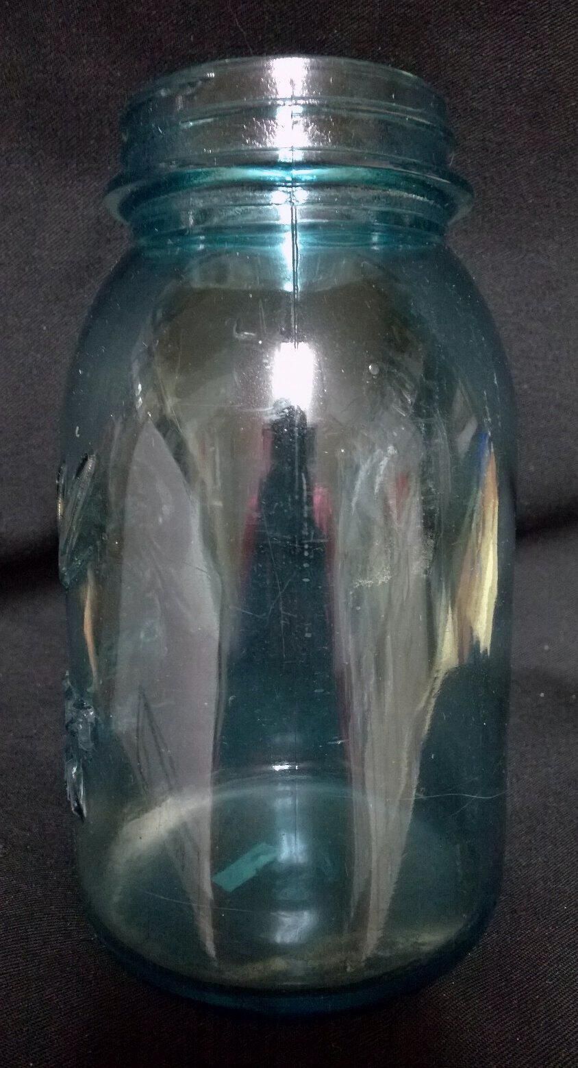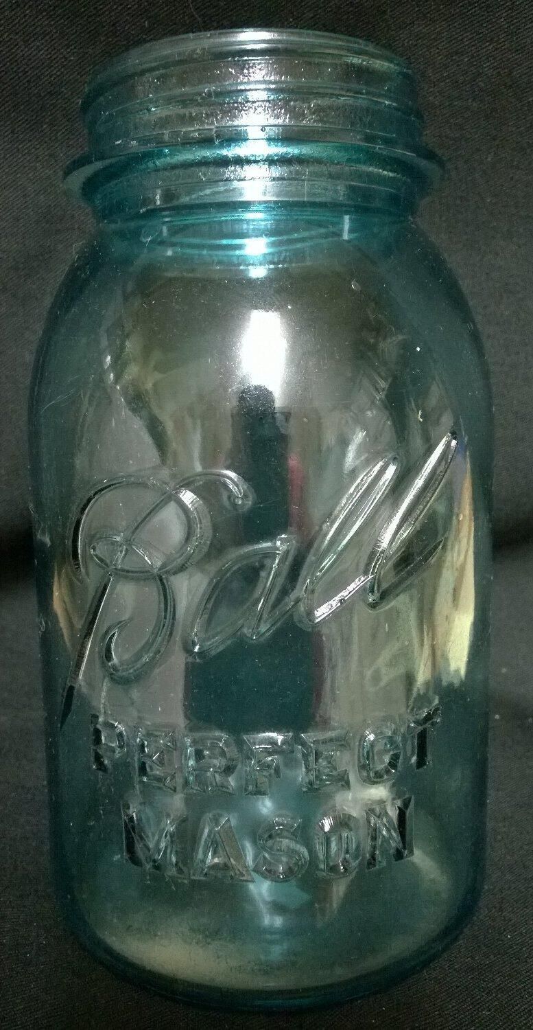 Light blue glass Ball one-quart canning jar. The jar is cylindrical in shape. The mouth of the jar is threaded for a screw-on lid and has a flat surface for a rubber seal. There is a horizontal seam where the mouth was attached to the base. The side seam lines run from the bottom circular seam line up to and over the lip. There is a circular mold seam on the bottom and a second seam mark inside but off center. The jar is embossed with the following: On the side: "Ball" "PERFECT MASON" On the bottom: "2".Made/Created