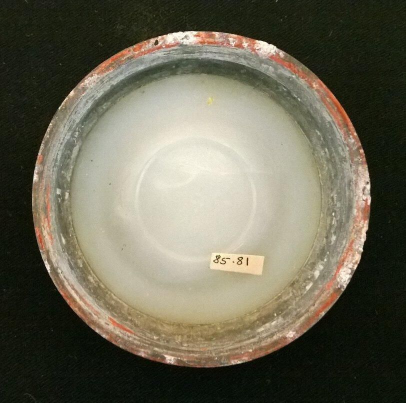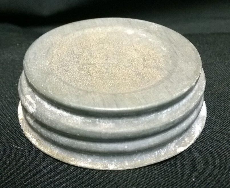 Zinc and glass lid for canning jar. The gray lid has female threads to fit on the male threads of a mason jar. There are concentric circles of 1" and 2" impressed on the top. The inside of the lid has a white milk glass lining. The liner has a 1.25" circle in the center. The zinc is corroded with accretions/powdery white spots. The sealing edge has a red coloring possibly from the rubber gasket it was used with.Made/Created