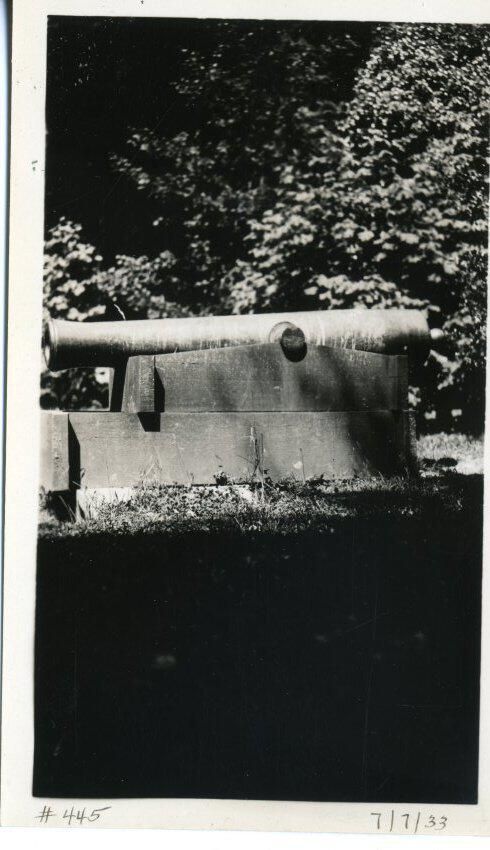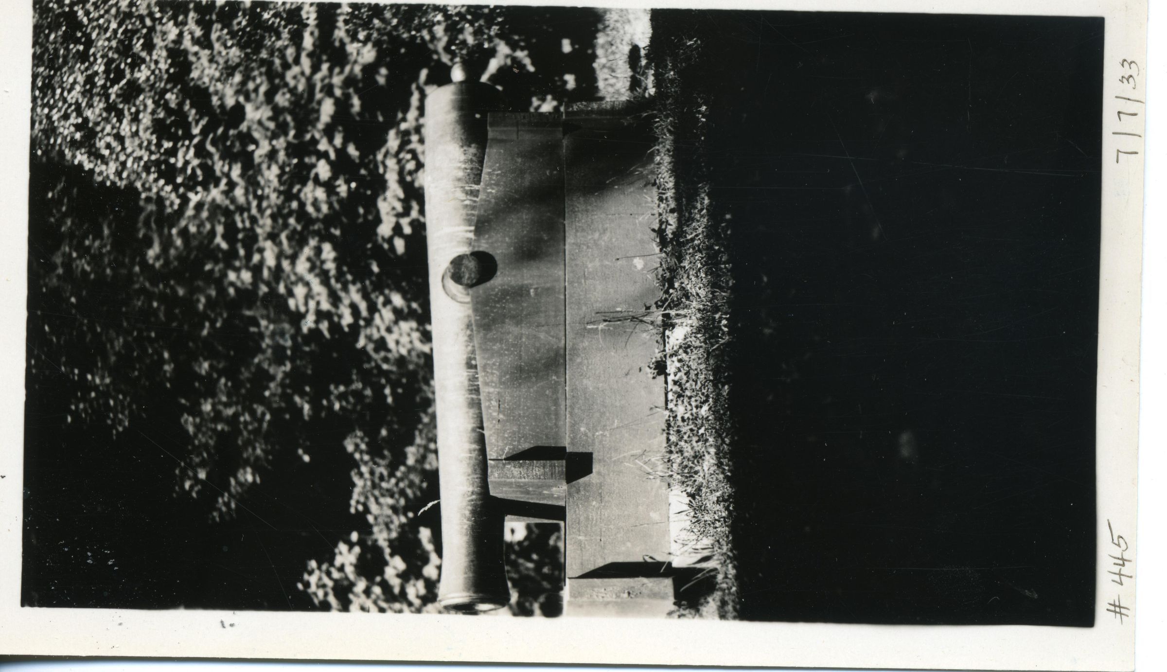 Black and white photo of a cannon at Priest Point Park The barrel of the cannon extends across the image, and is supported by what appears to be a wooden stand. The cannon is on grass, and behind it is shrubs and trees. There is a white border on all sides, and in the bottom border is "#445" and "7/7/33". On the back is "0907".