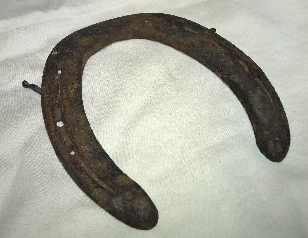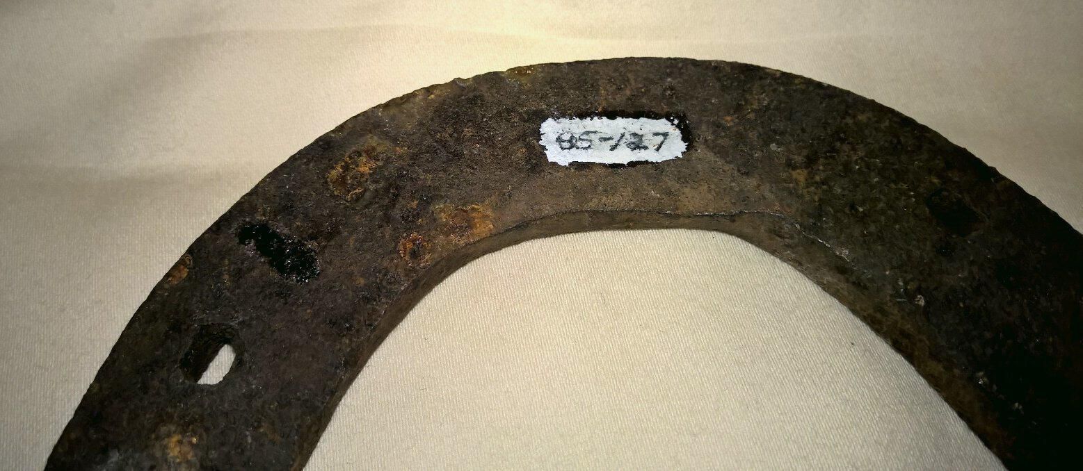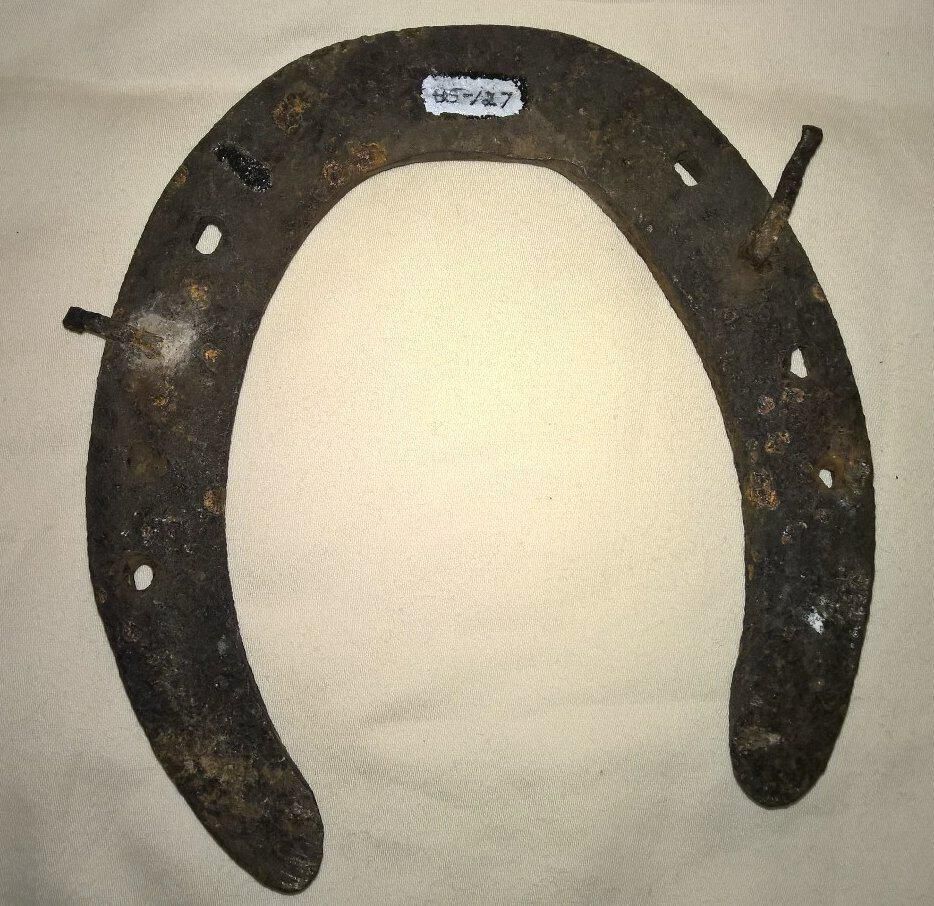 Small horseshoe with grooves that fit shoe nails, and holes within the grooves for the nails to go through. On each side of the shoe near the toe is a nail that is flush on the bottom (as it would be on the horse's foot) and extend through to the top side and are bent flat.Made/Created