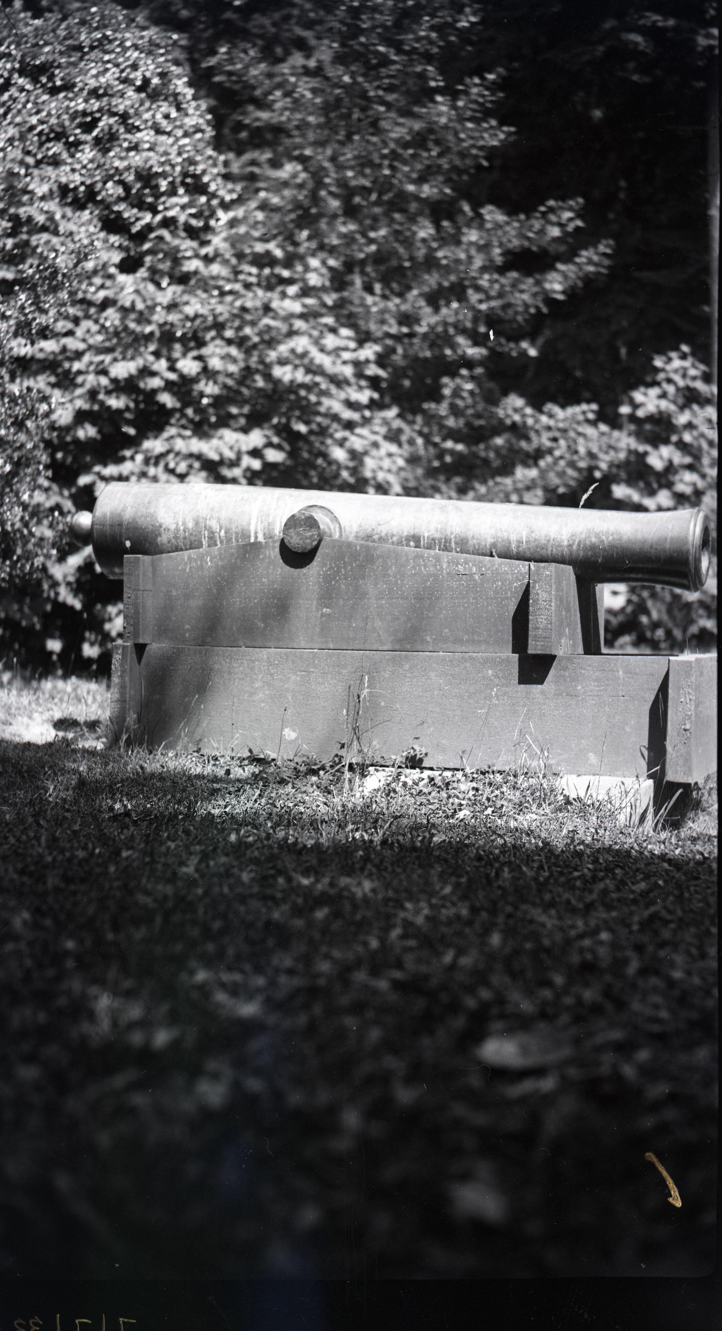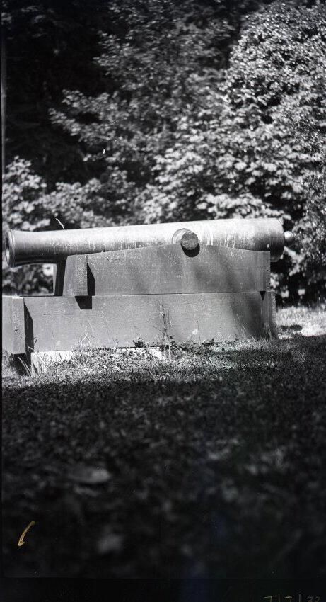 Black and white photo of a cannon at Priest Point Park The barrel of the cannon extends across the image, and is supported by what appears to be a wooden stand. The cannon is on grass, and behind it is shrubs and trees. There is a white border on all sides, and in the bottom border is "#445" and "7/7/33".