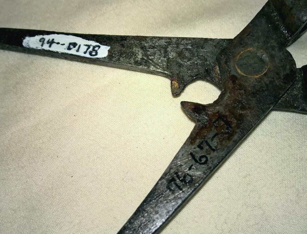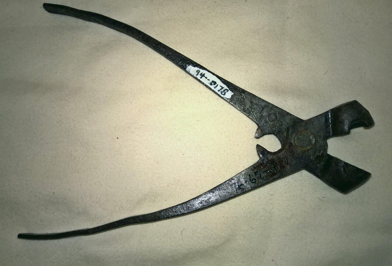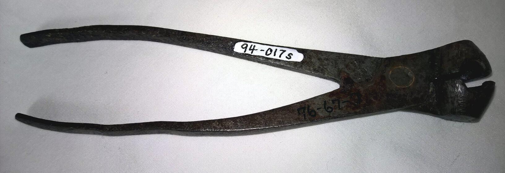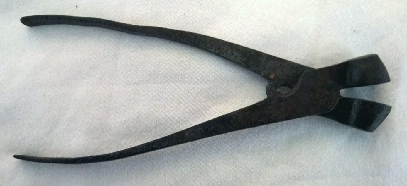 Scissor style metal black powder bullet mold. Two handles are fastened together at a pivot point. Opposite the handles is the mold in two parts that, when the handles are closed, form the bullet shape with an opening on one side for inserting molten material. On the handle side of the pivot are blades for trimming the bullet. Embossed on one handle is "I 05", which might suggest 50 caliber. Also embossed is the letter "B" inside a triangle.Made/Created