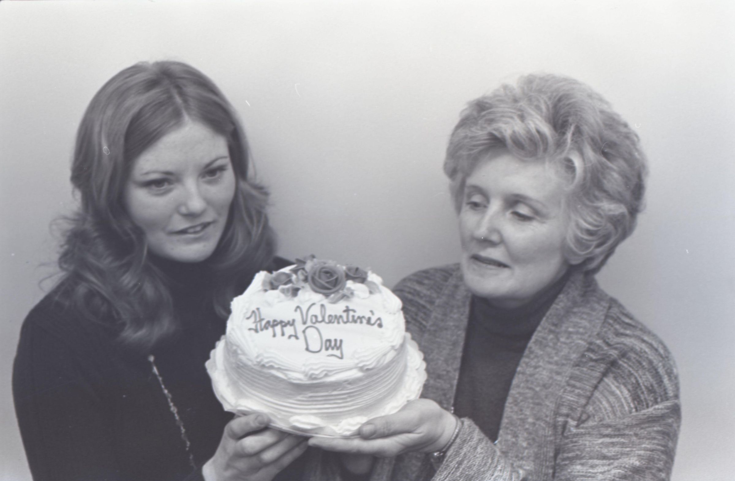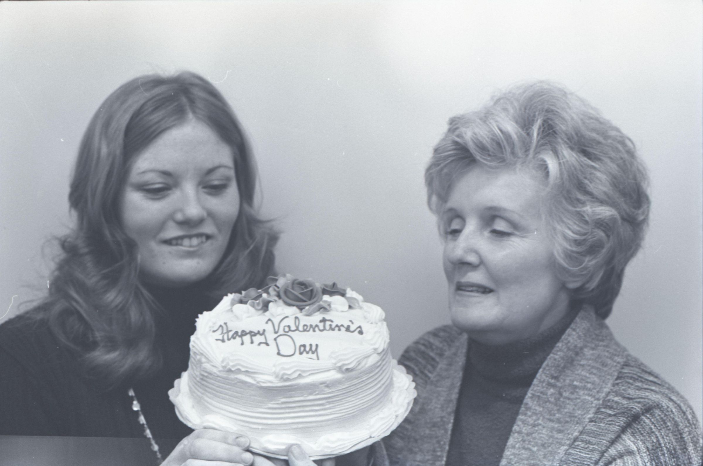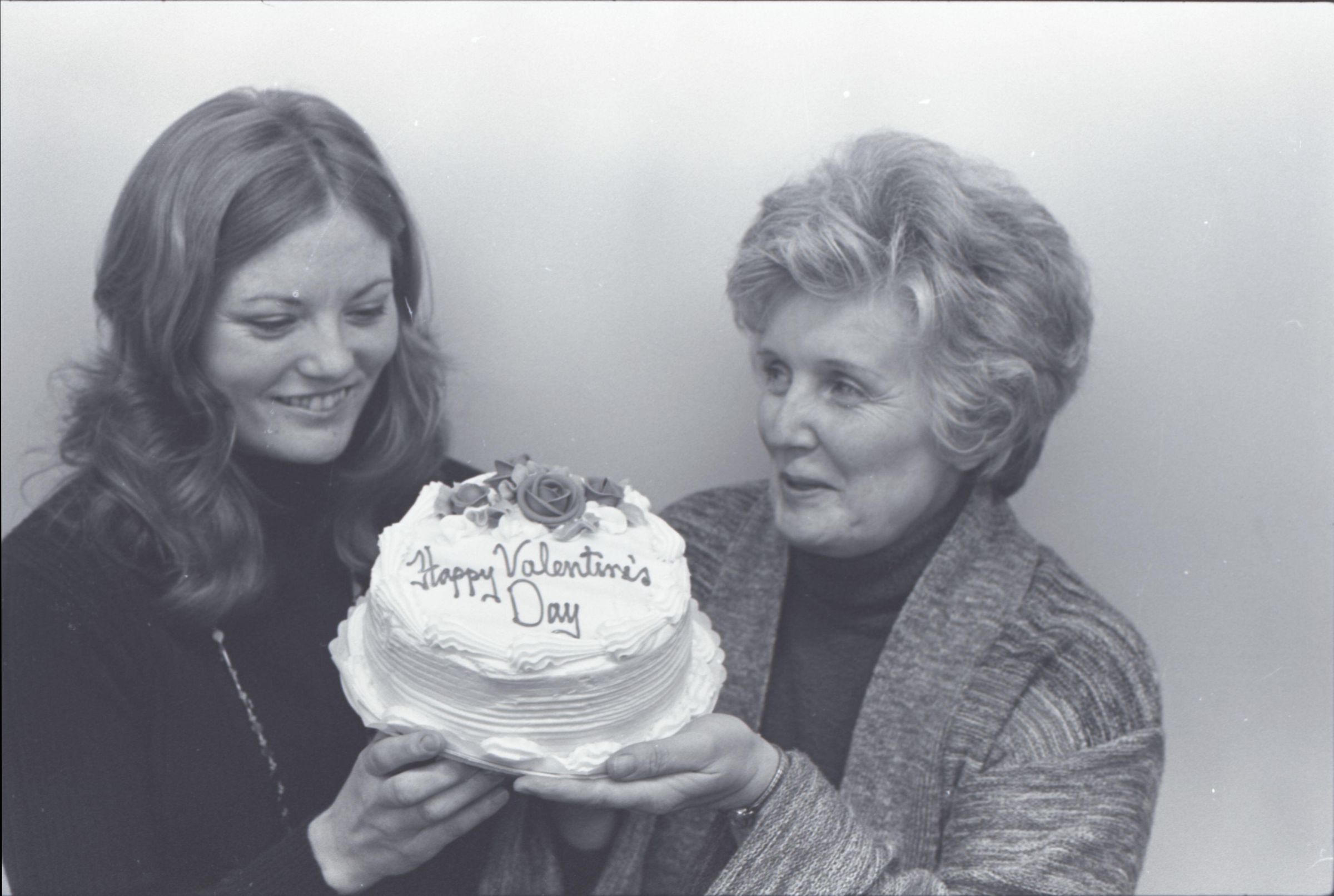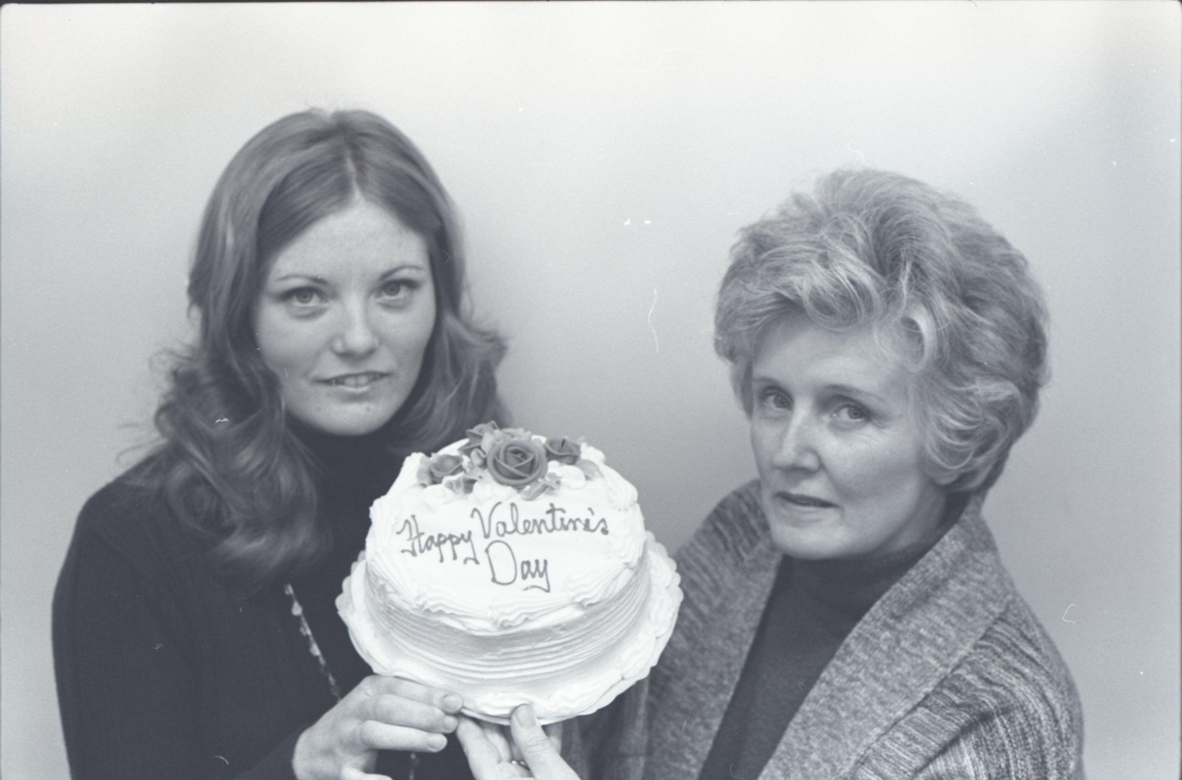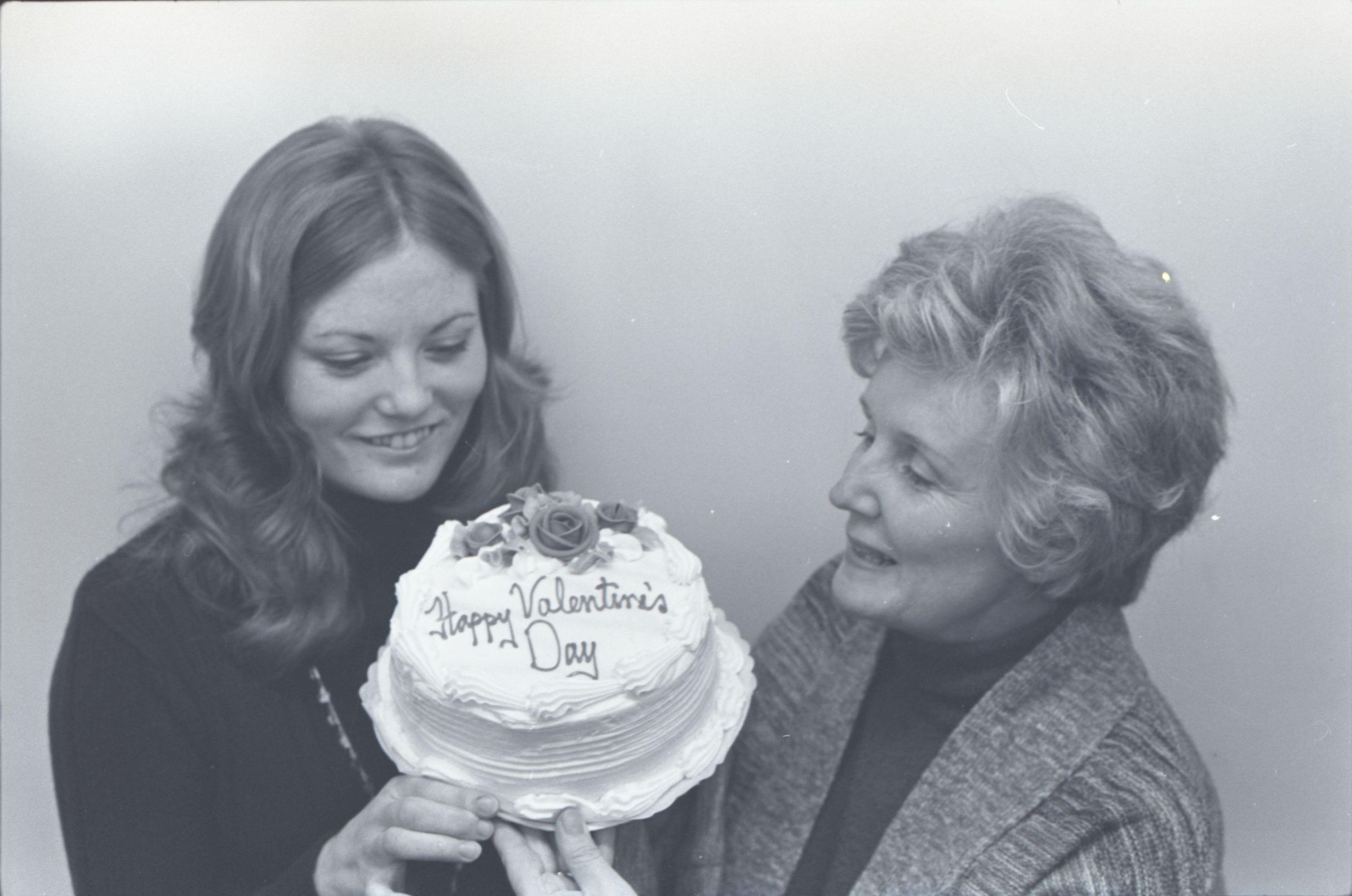 Humane Society Bake Sale, 1976. These three black and white film negative strips were created for the Lacey Leader newspaper. These images show two women (Barb Adams at left, Marj Munzinger at right) standing next to each other and holding up a cake with "Happy Valentine's Day" written on it in piped frosting.Made/Created