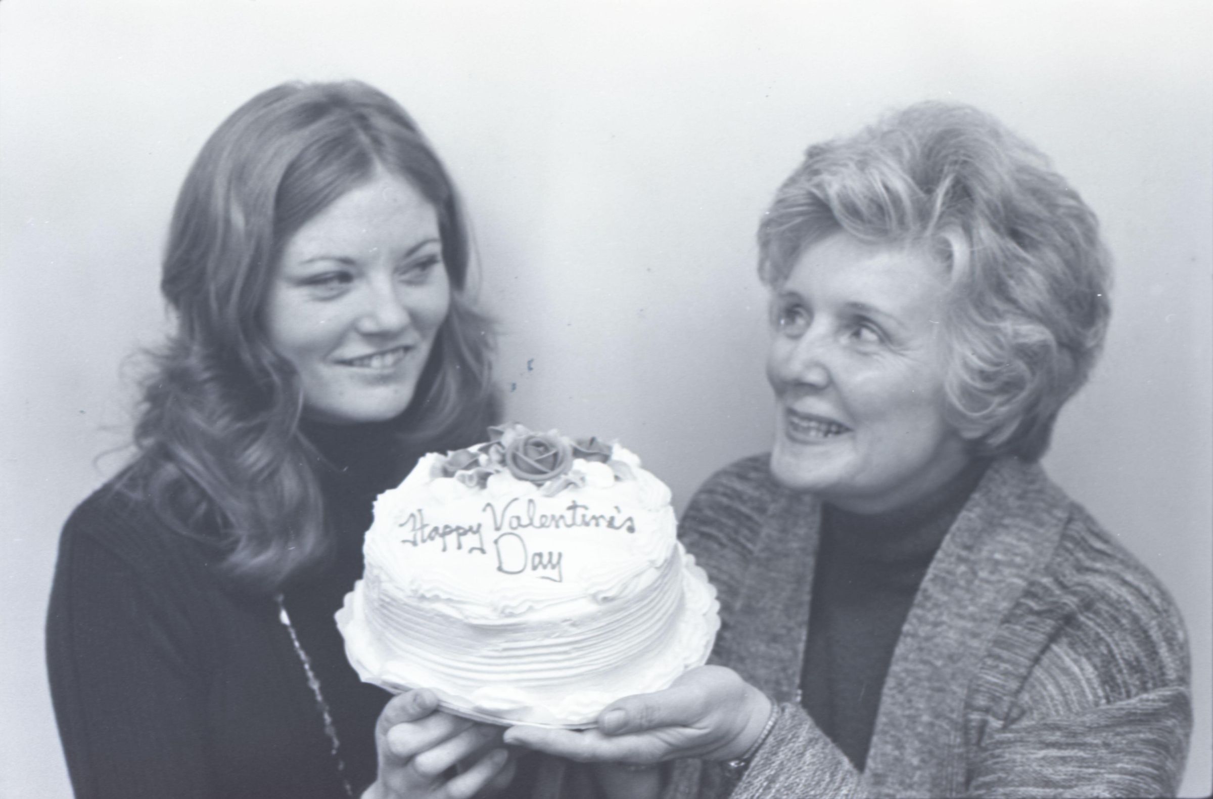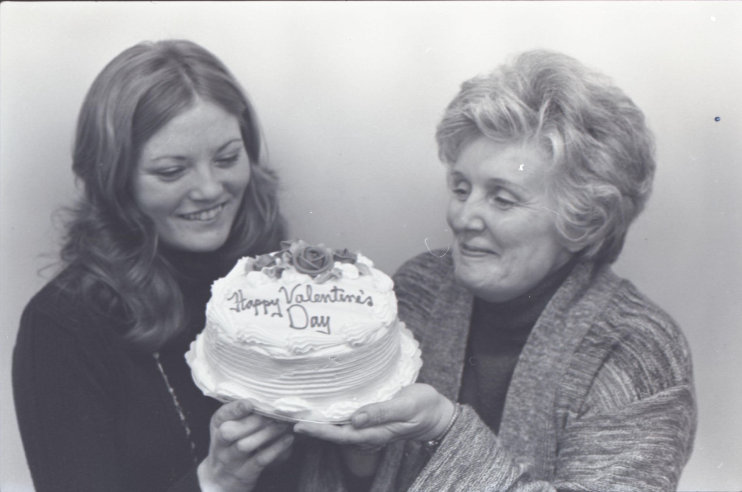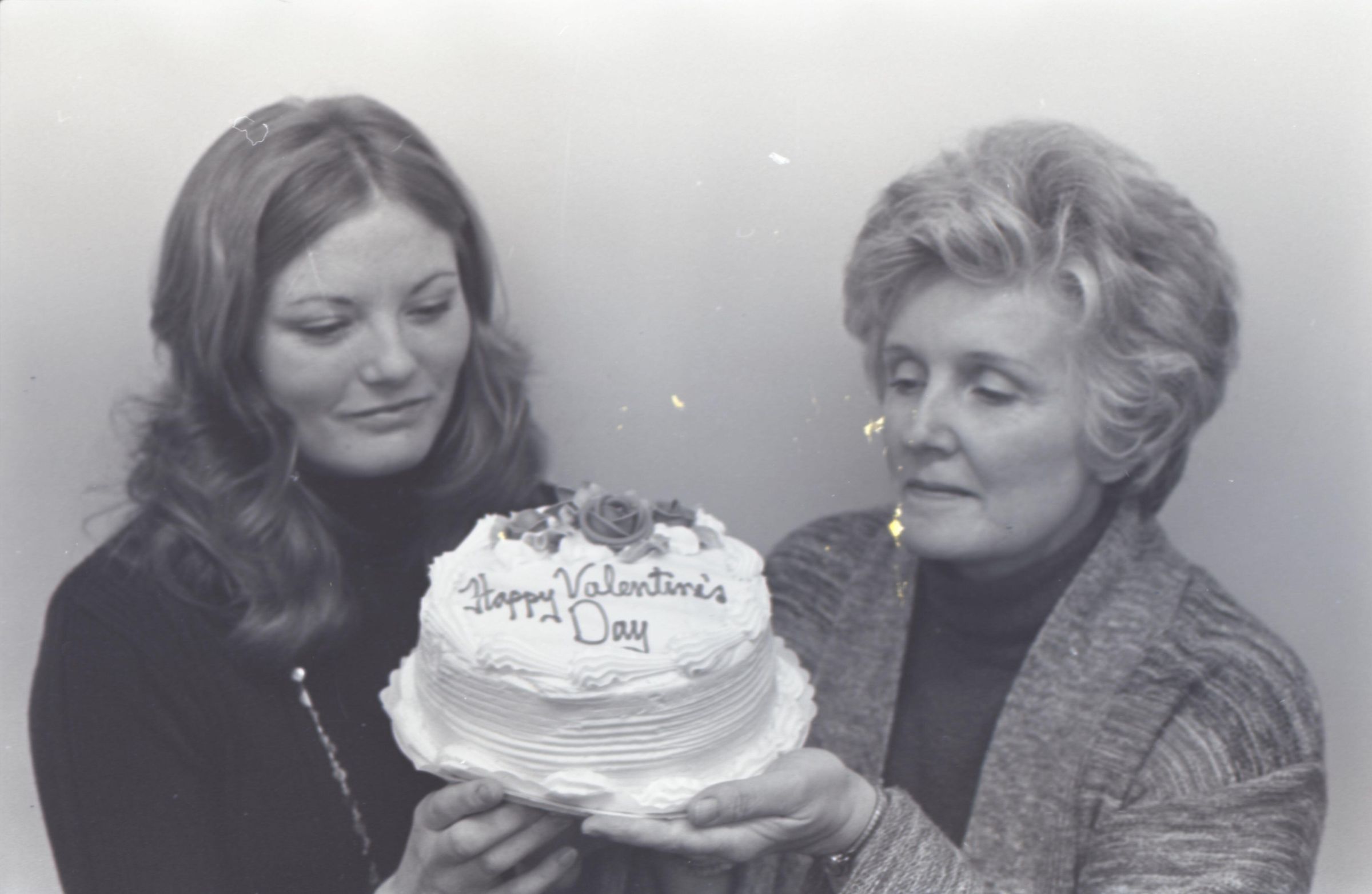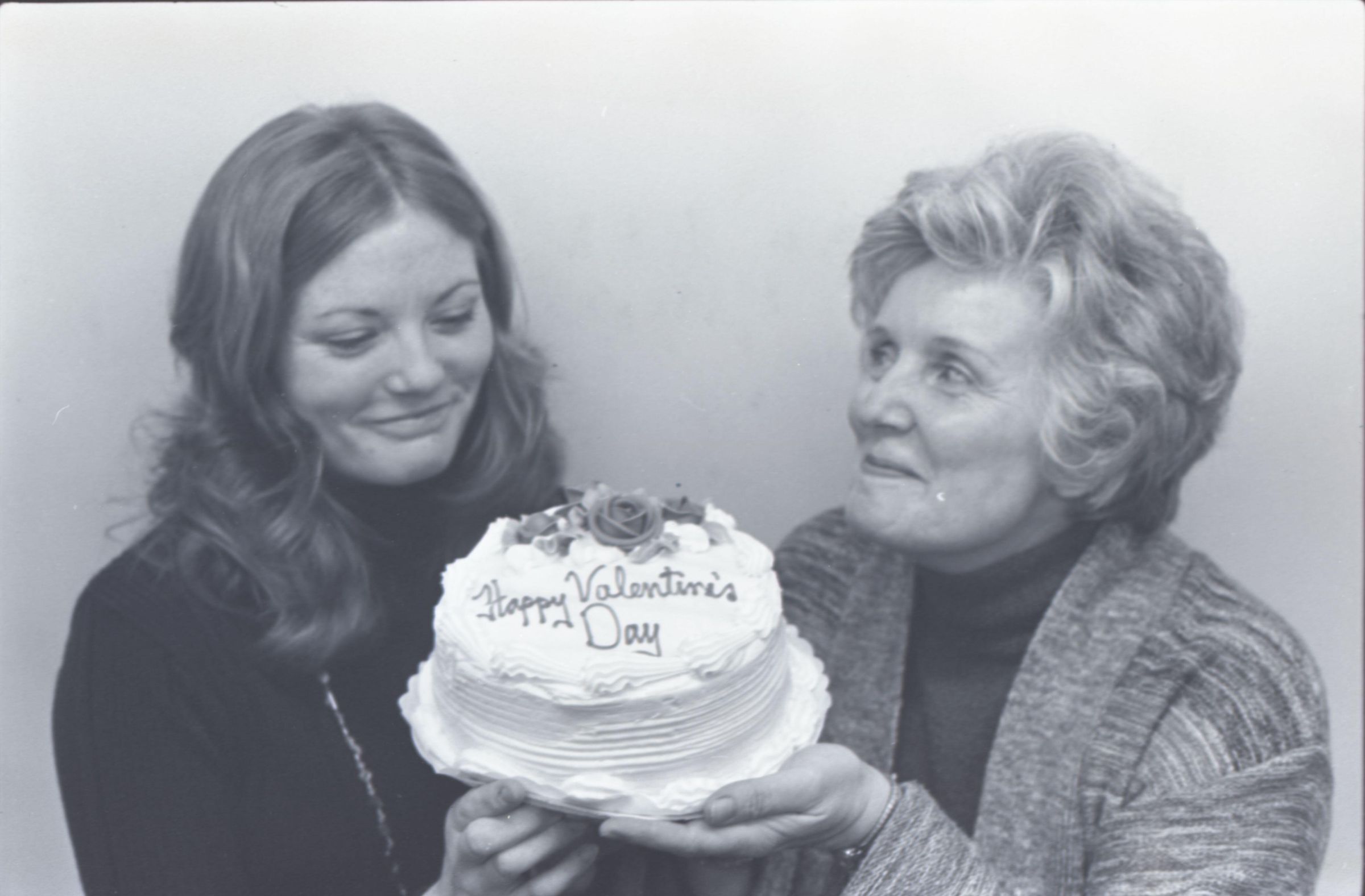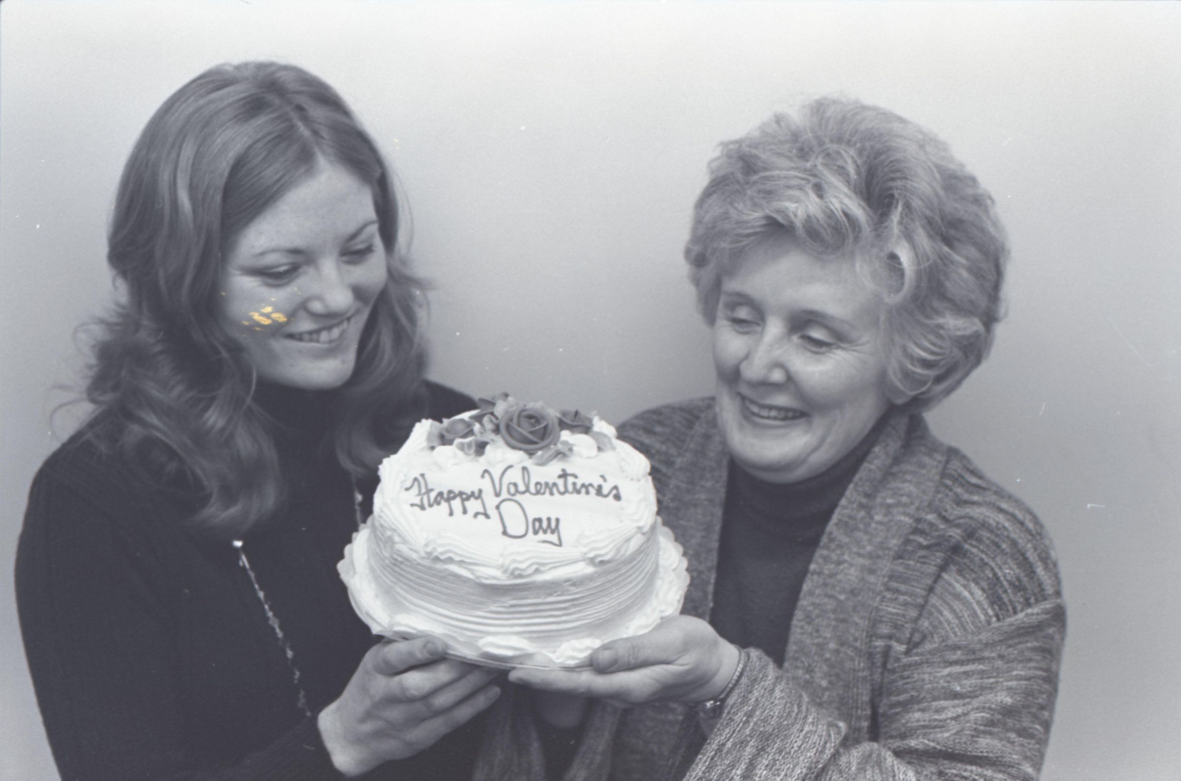 Humane Society Bake Sale, 1976. These three black and white film negative strips were created for the Lacey Leader newspaper. These images show two women (Barb Adams at left, Marj Munzinger at right) standing next to each other and holding up a cake with "Happy Valentine's Day" written on it in piped frosting.Made/Created