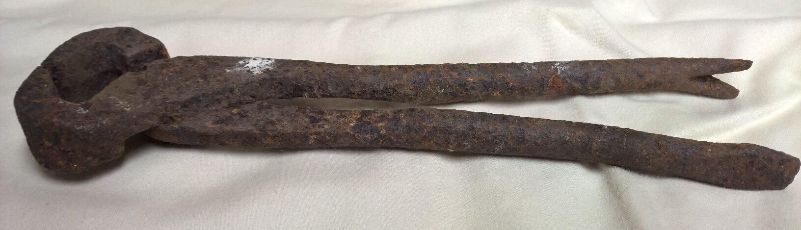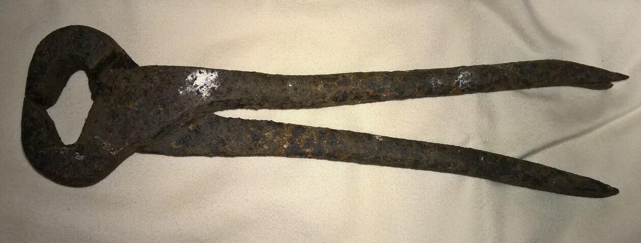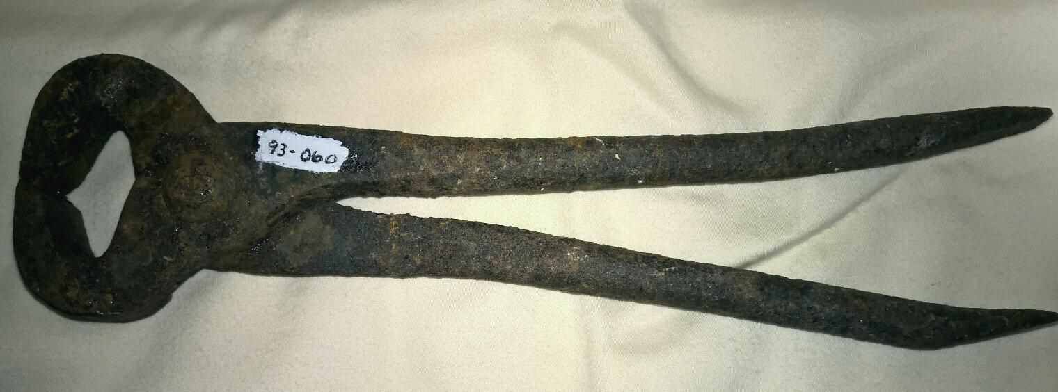 Metal tongs for the purpose of removing horseshoe nails. The object has flat teeth to grip the head of the nail. The end of one of the two handles is shaped like a slot-type screw driver; at the end of the other handle is a v-shaped wedge. The object is so rusty that the jaws are frozen closed.Made/Created