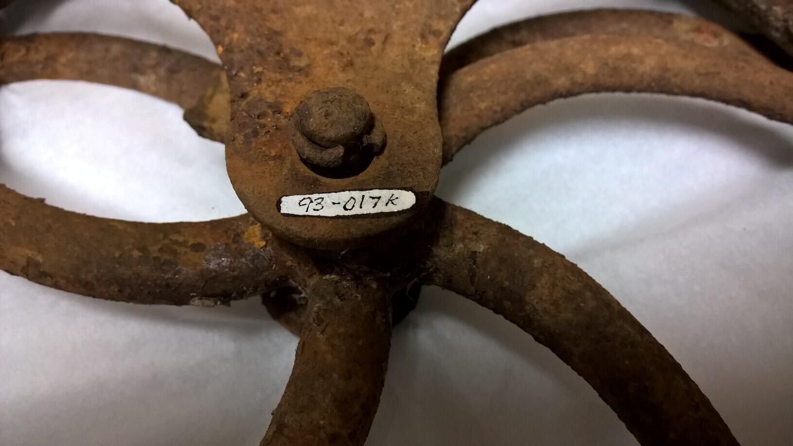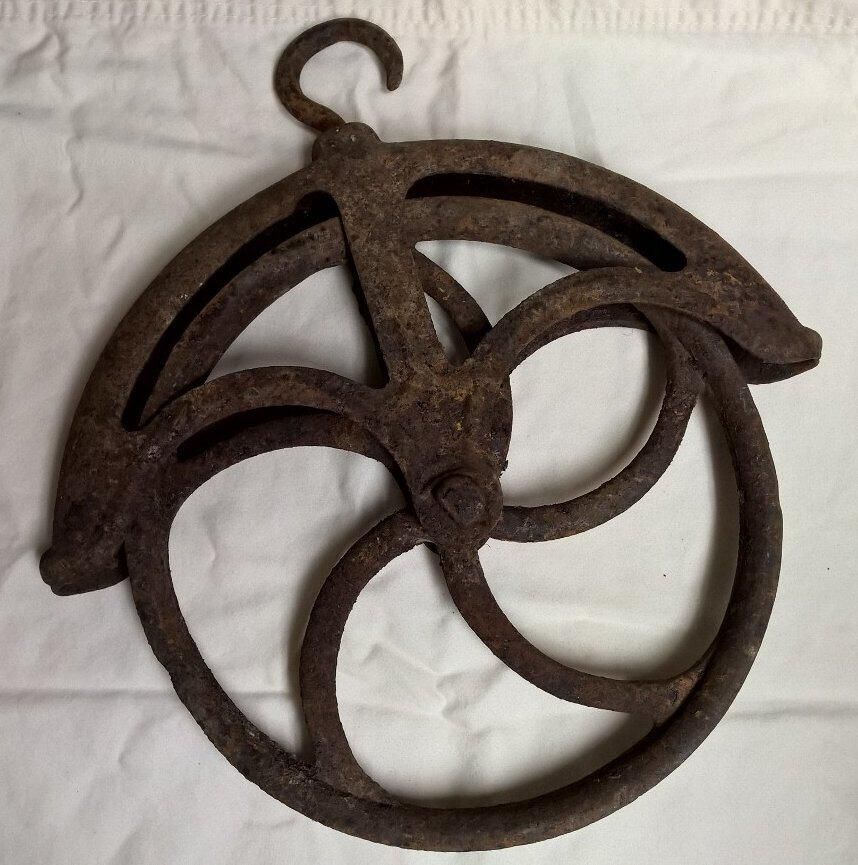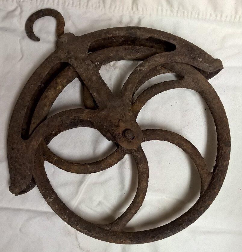 Cast iron Water Barn Well Pulley used to lift buckets of water to the surface from the bottom of the well. The object consists of a wheel with a groove in which a rope fits, with the wheel fastened by a pivot pin into a framework that has a curved cover over the top of the wheel and a hook with which to hang the pulley above a well. The whole assembly is rusty and the pivot pin is worn so that the wheel wobbles and is quite loose. The wheel has curved spokes and the frame has curved support pieces.Made/Created