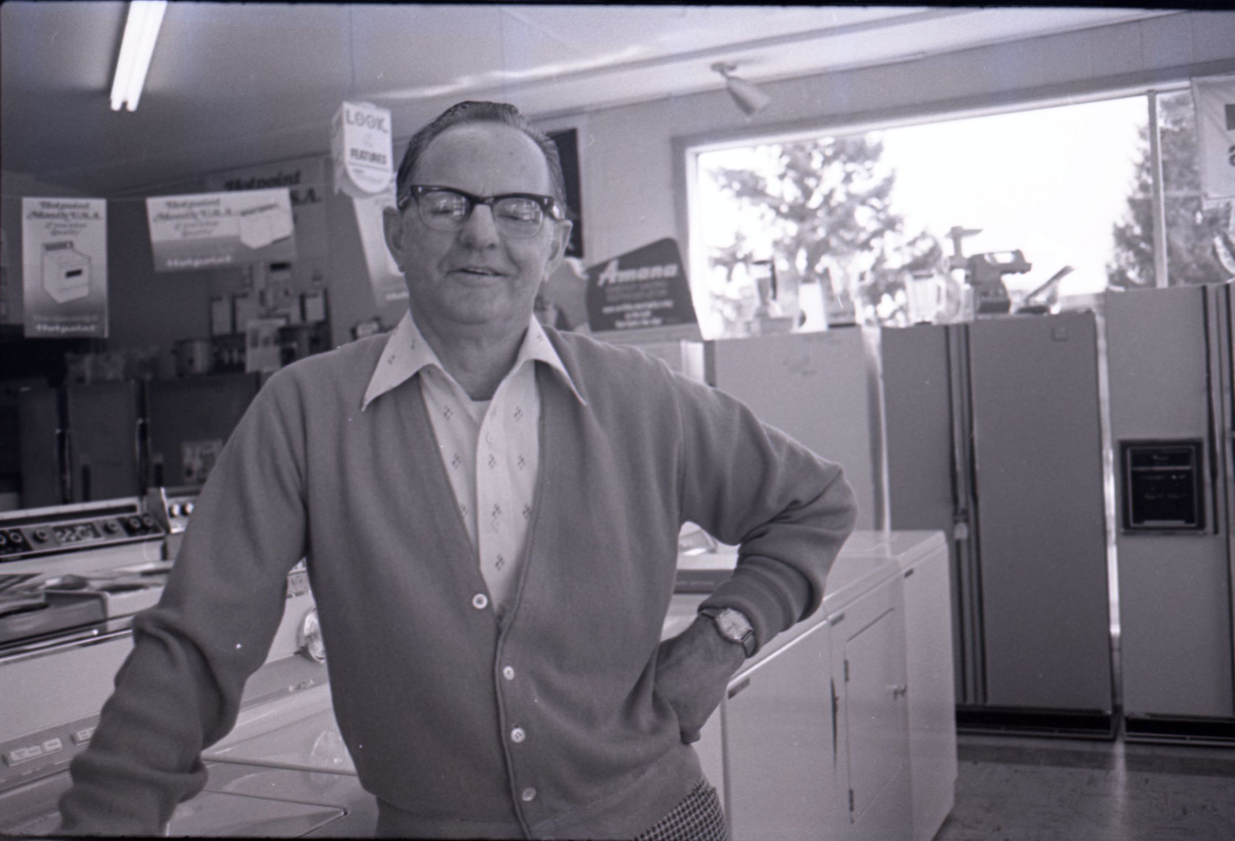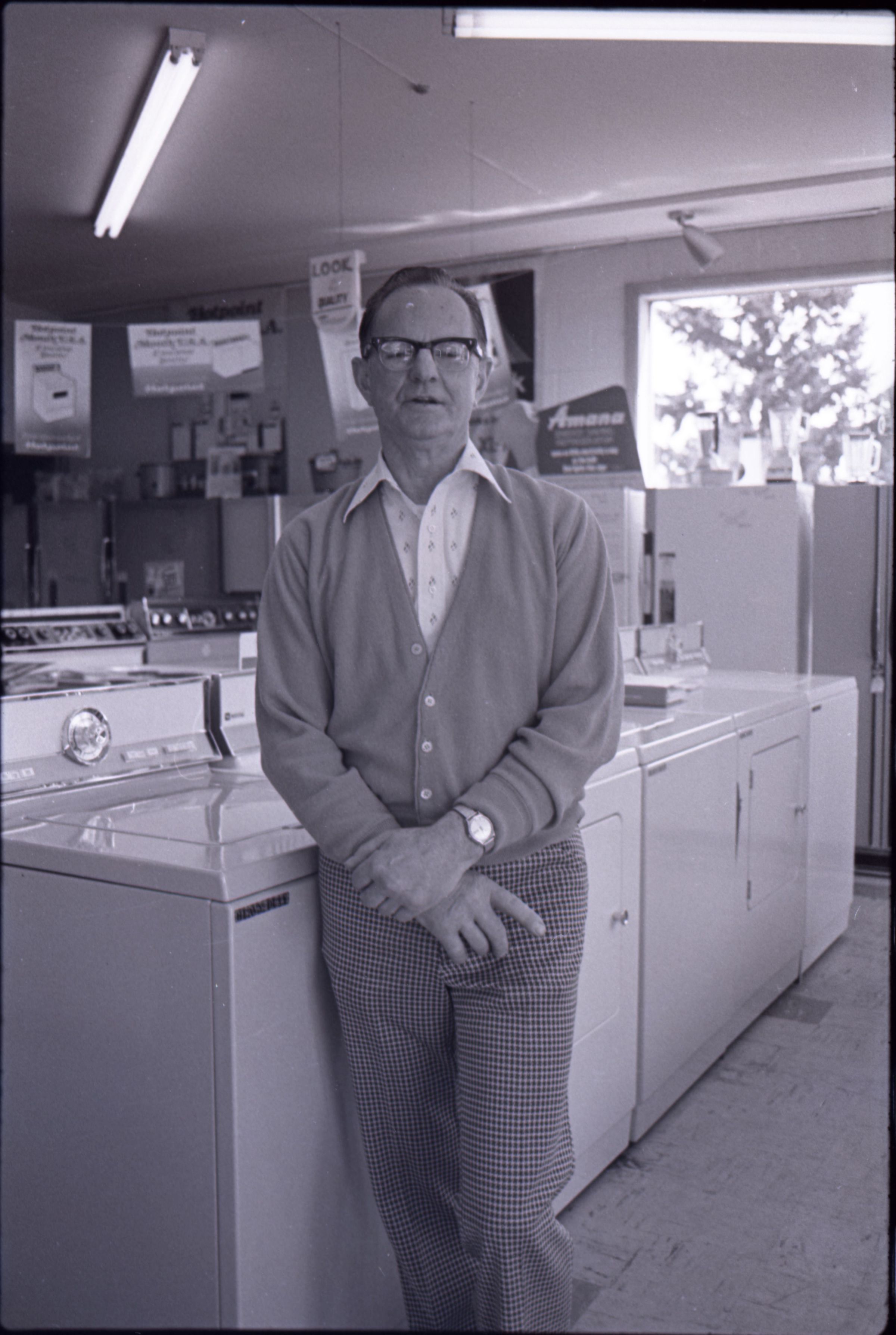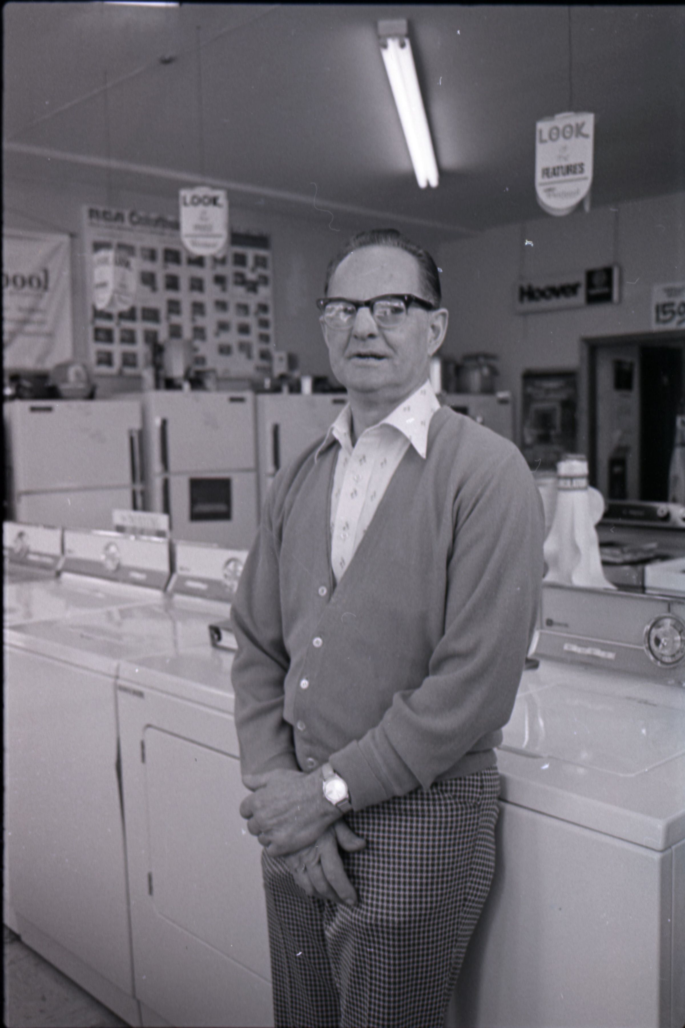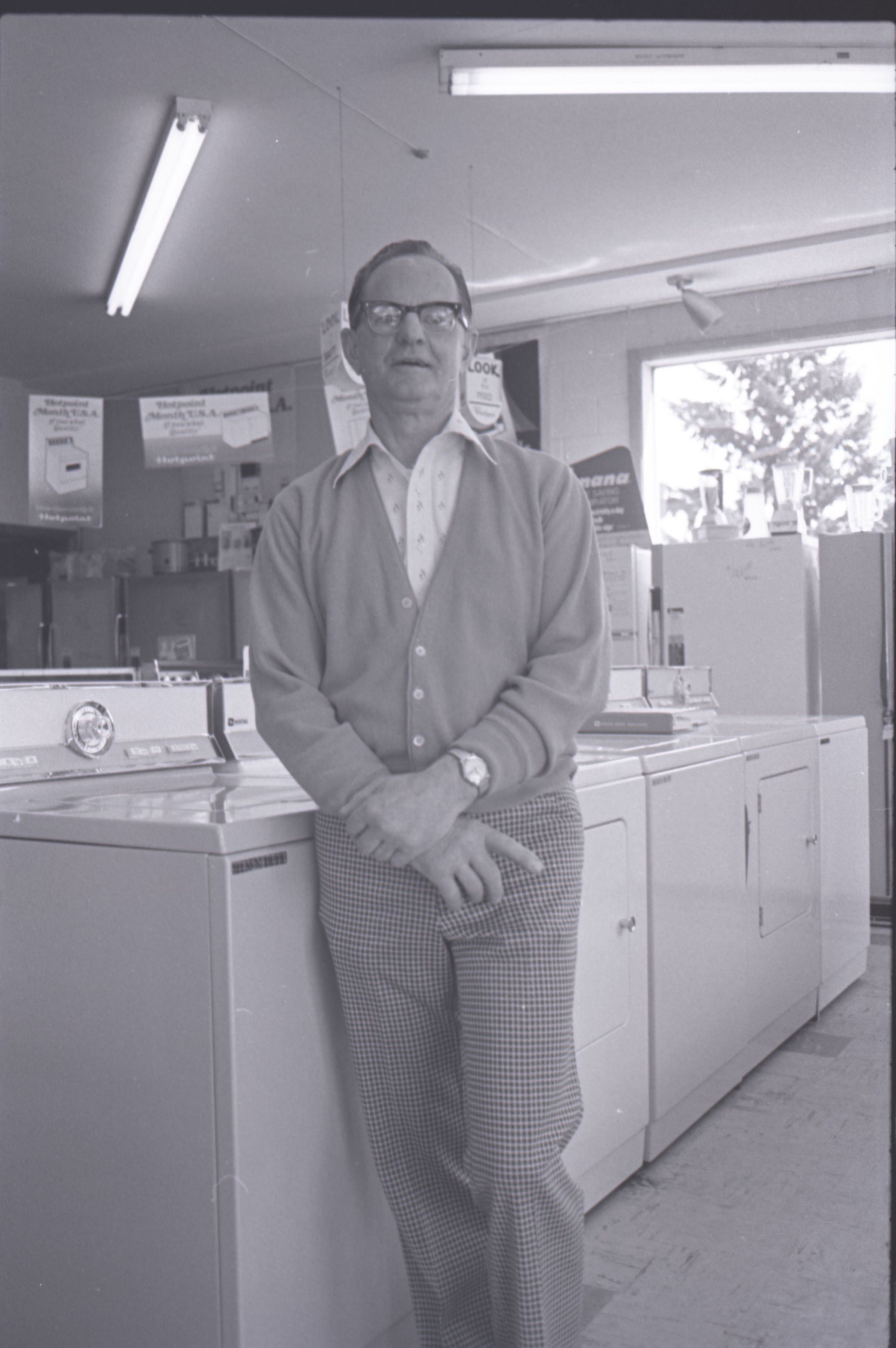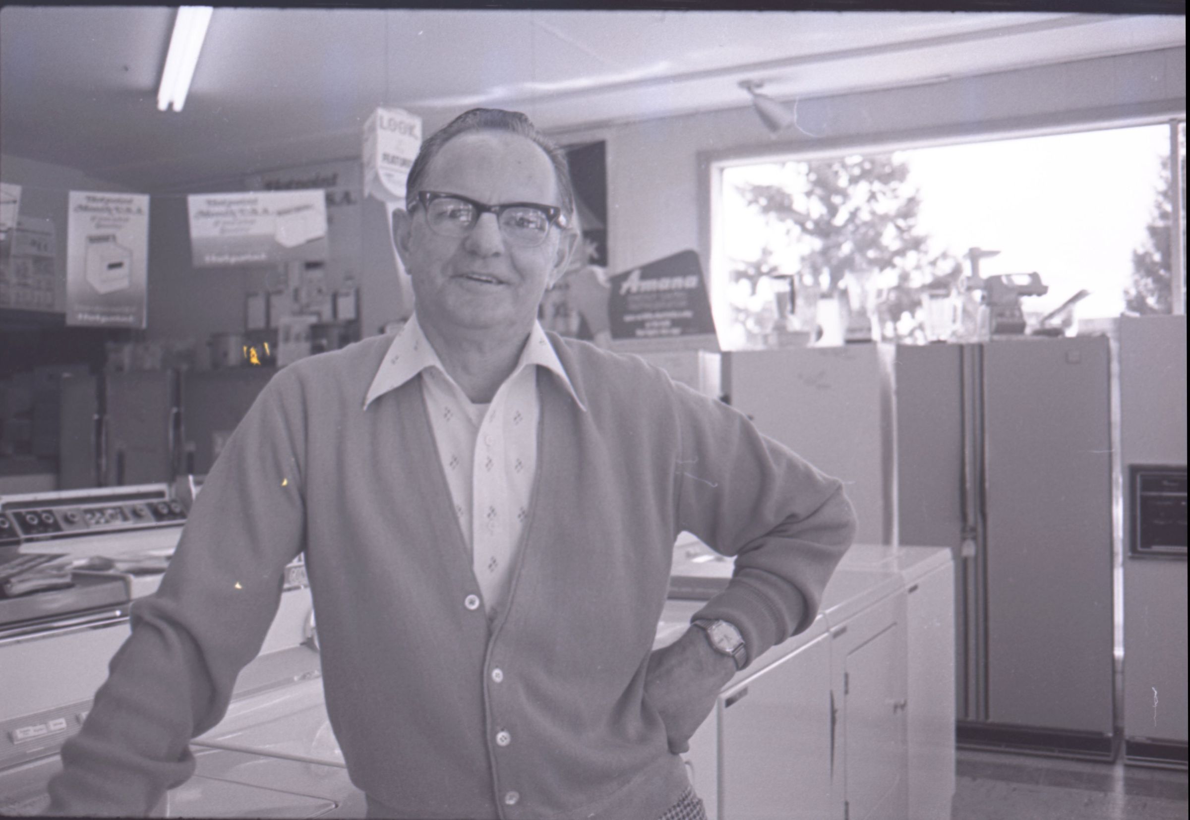 Harold's Appliance, 1979. These three black and white film negative strips were created for the Lacey Leader newspaper. These images show a man (Earl Lavasseur) posing for photos in a home appliance store. The man has combed-back hair and is wearing glasses. He is also wearing a cardigan over a button-up collared shirt, and plaid pants. He is wearing a watch on his left wrist.