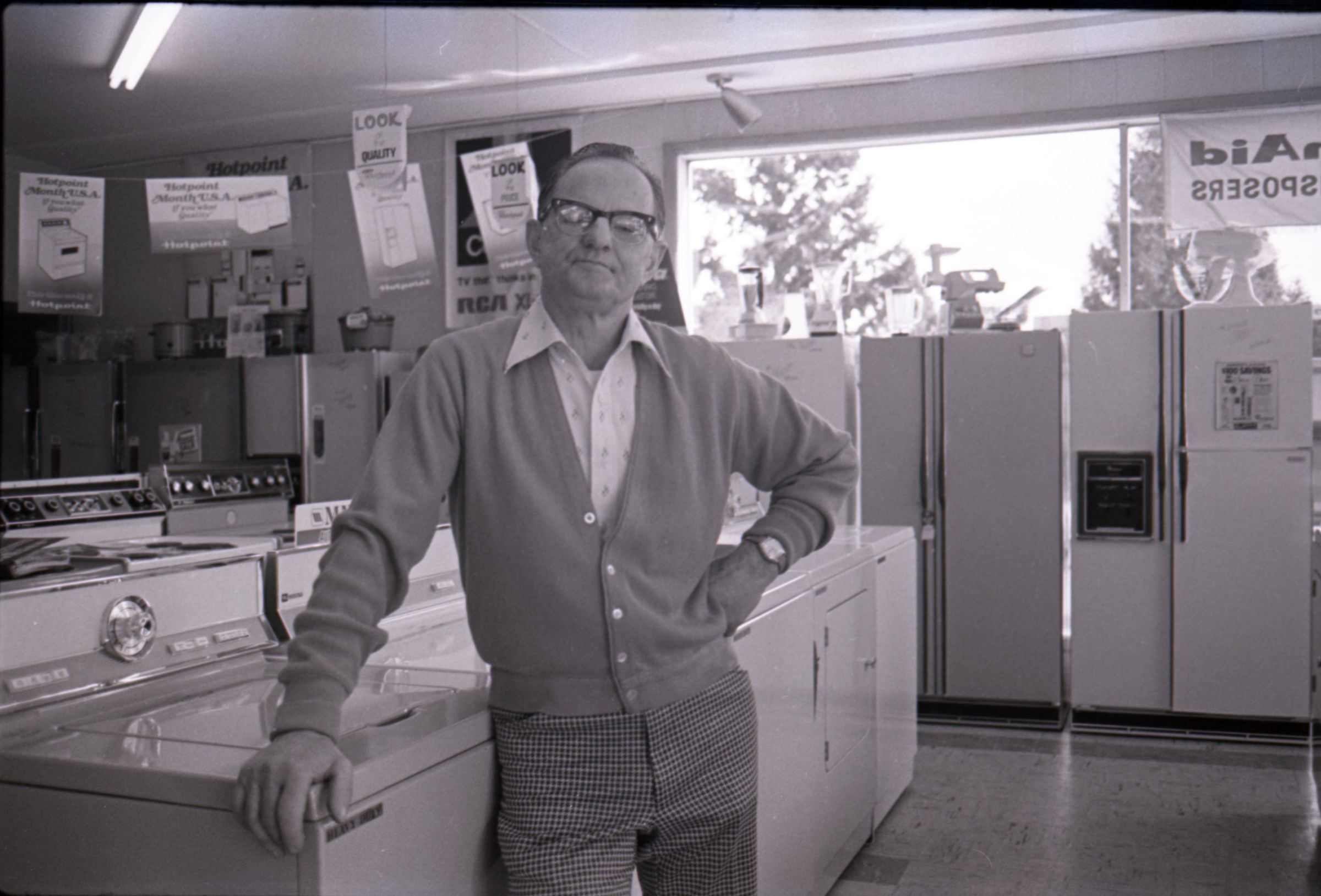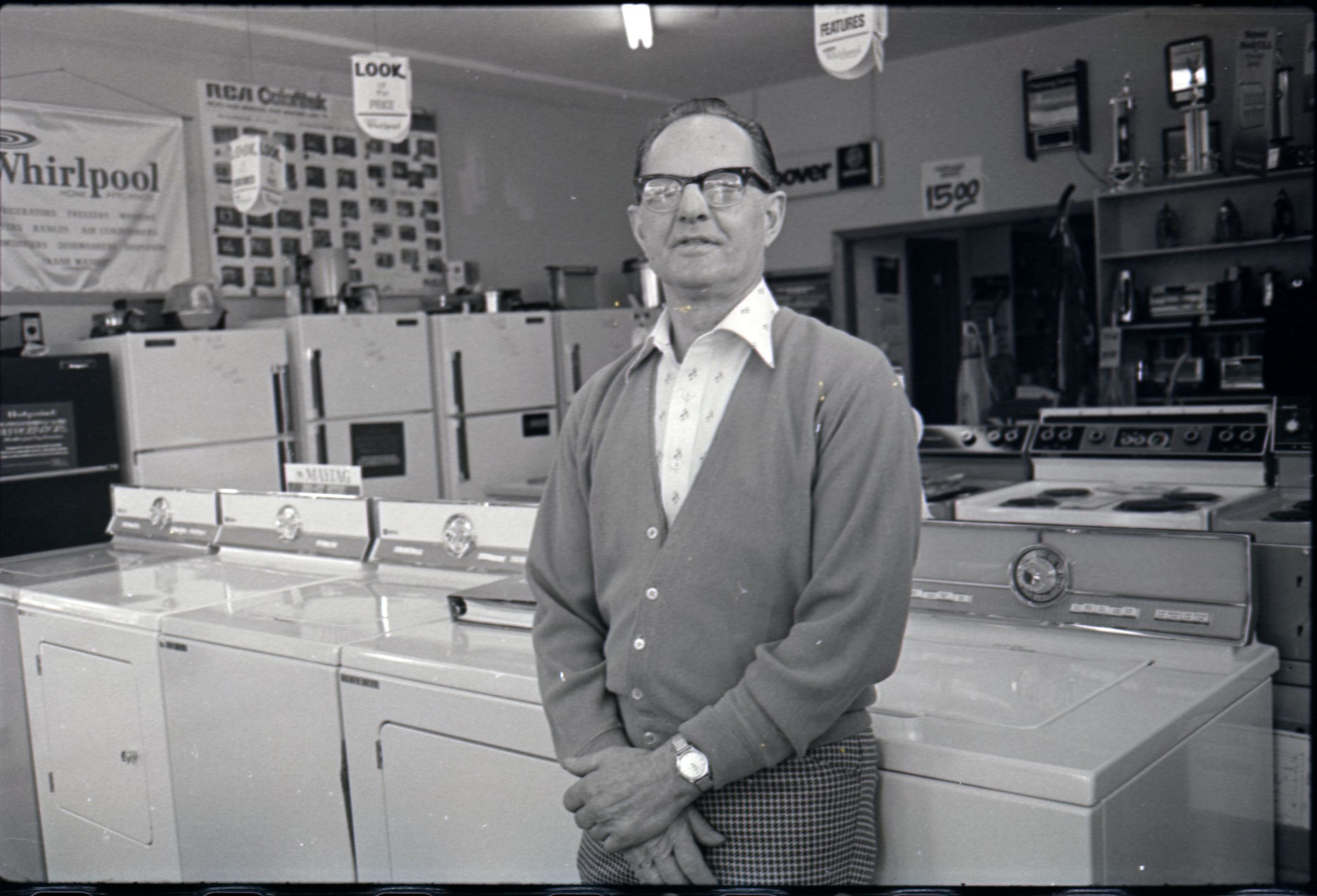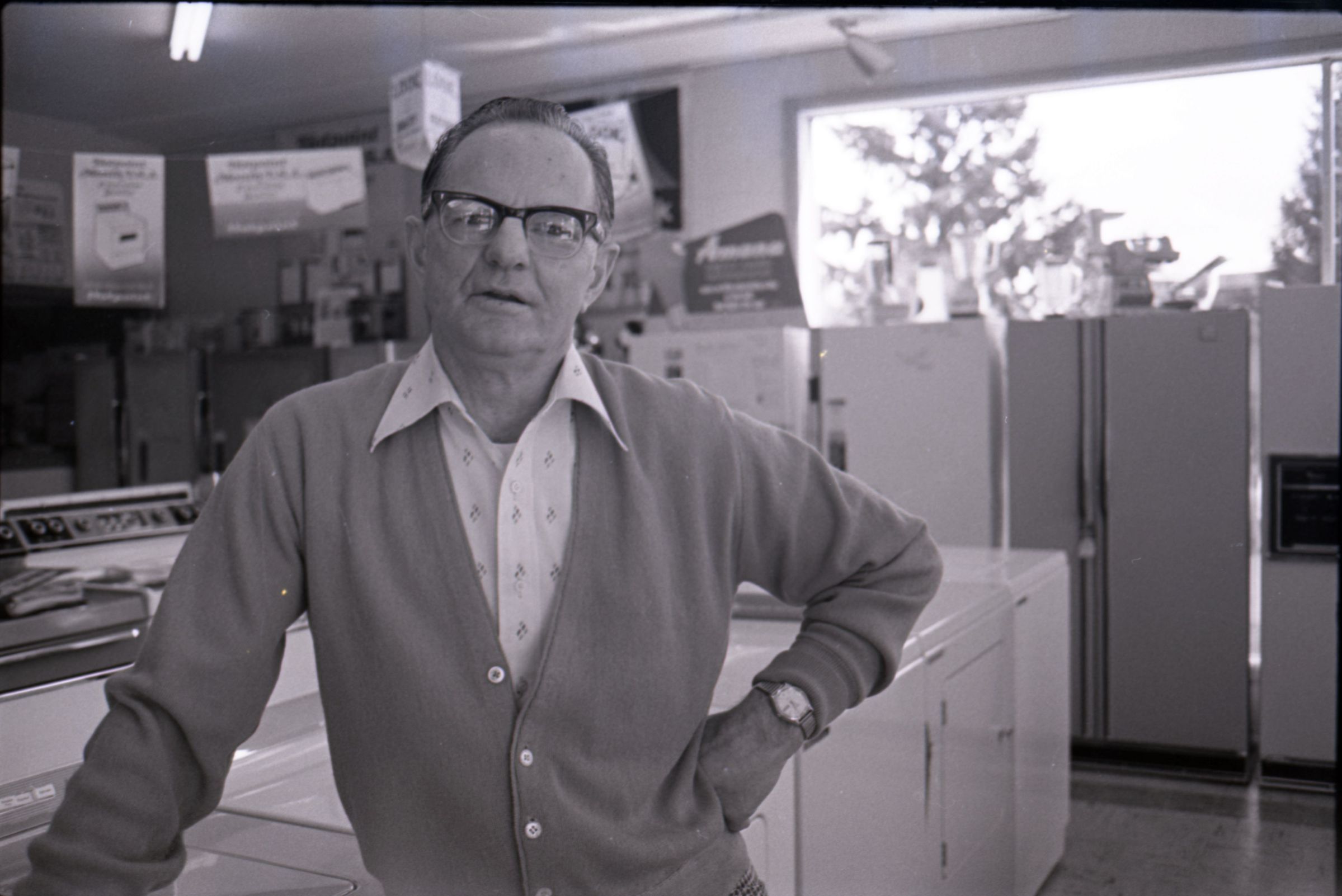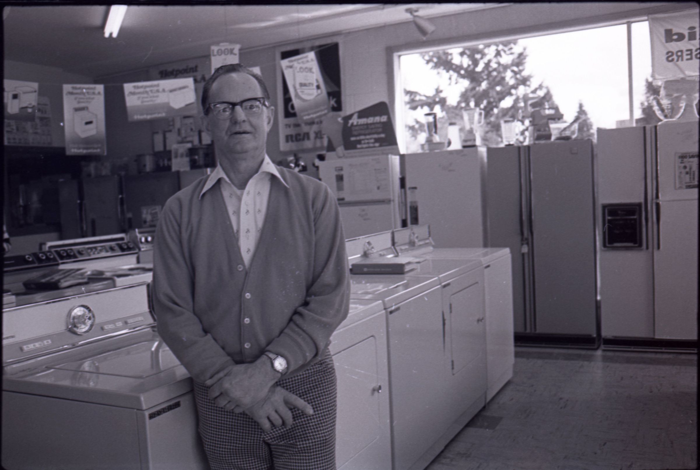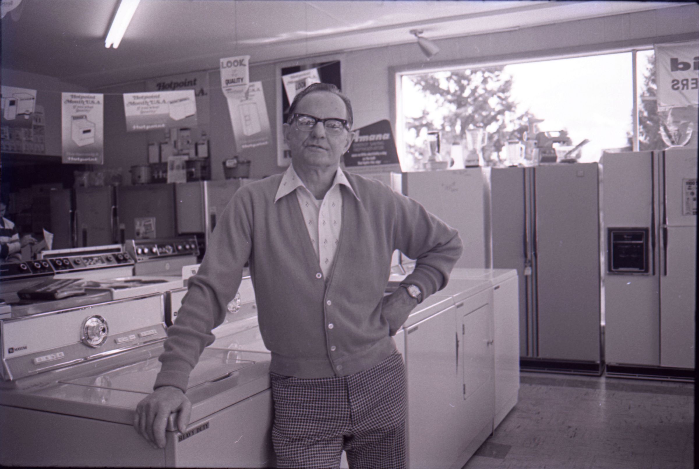 Harold's Appliance, 1979. These three black and white film negative strips were created for the Lacey Leader newspaper. These images show a man (Earl Lavasseur) posing for photos in a home appliance store. The man has combed-back hair and is wearing glasses. He is also wearing a cardigan over a button-up collared shirt, and plaid pants. He is wearing a watch on his left wrist.