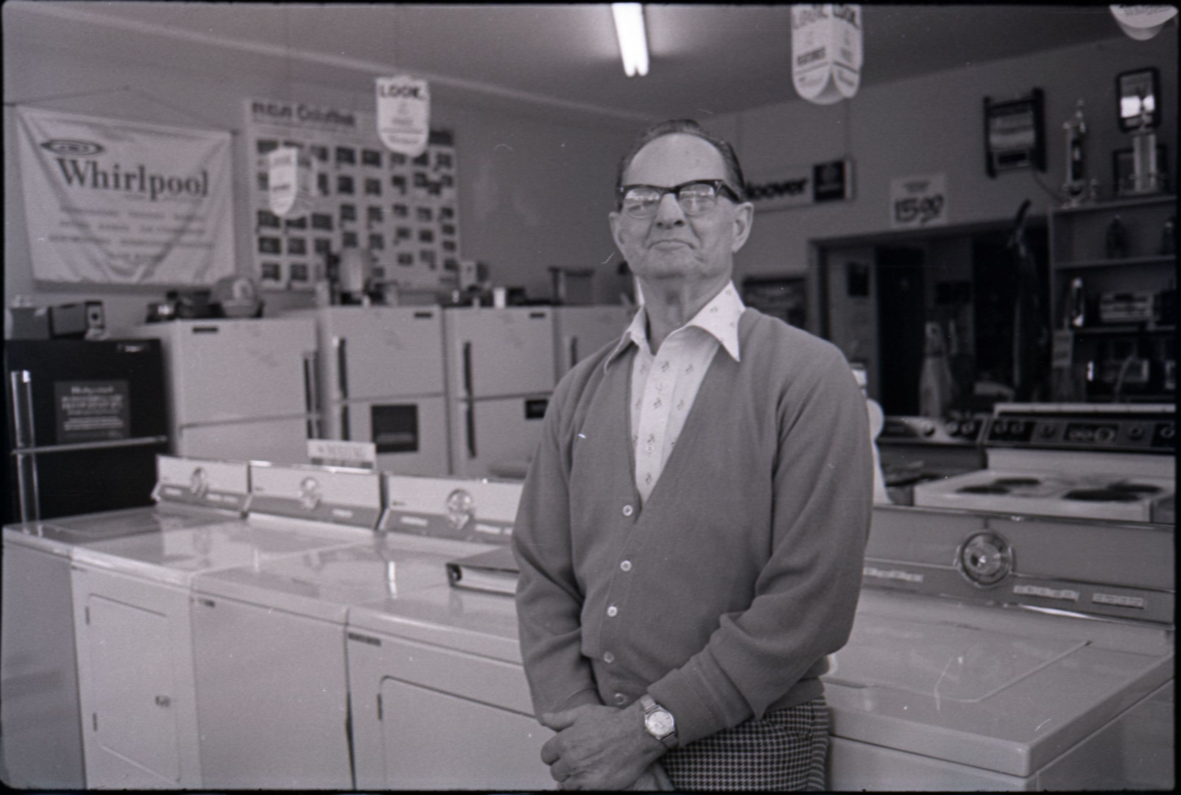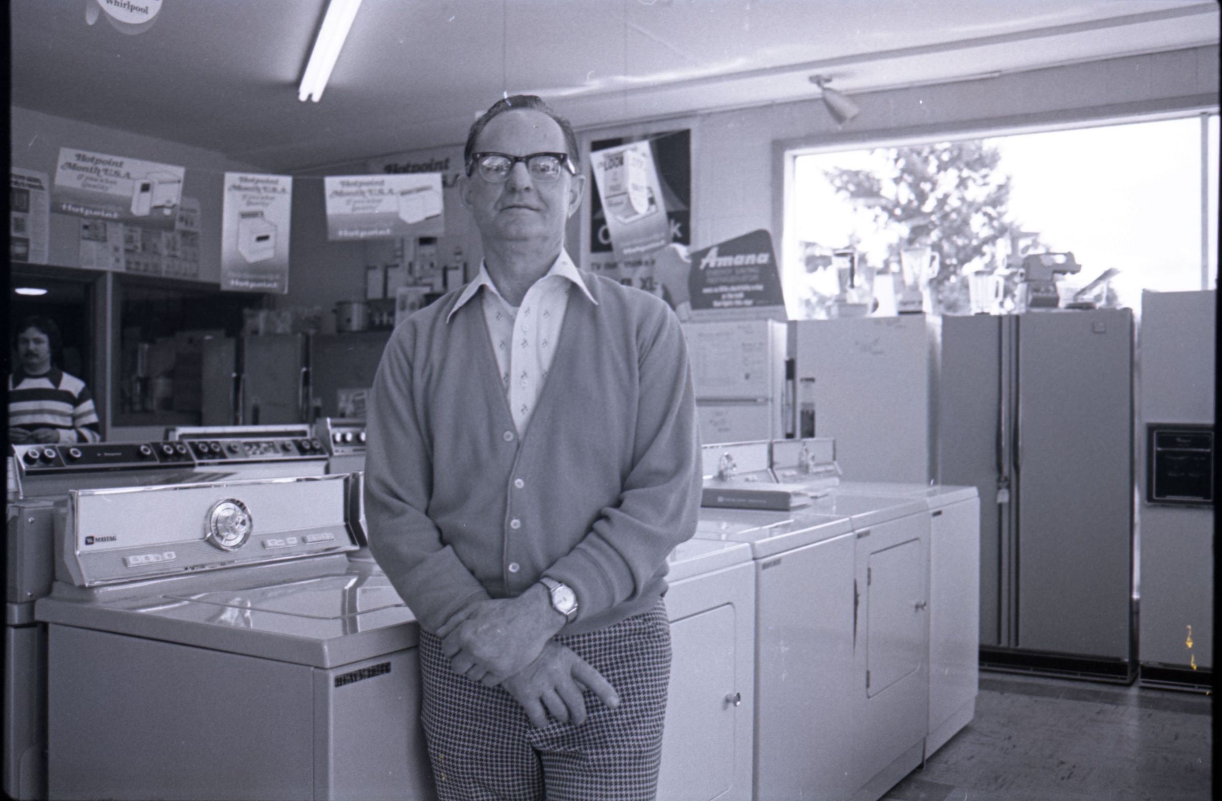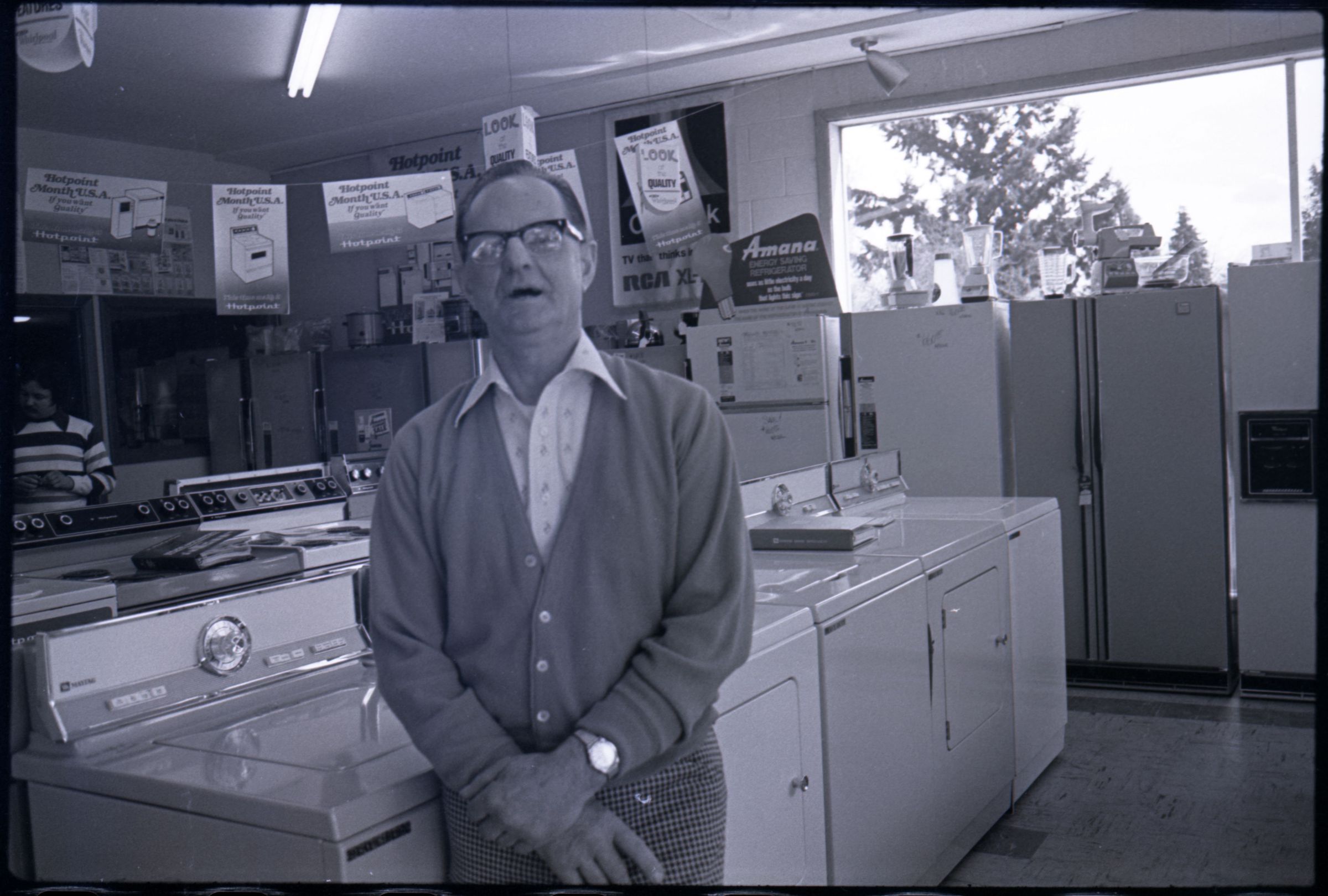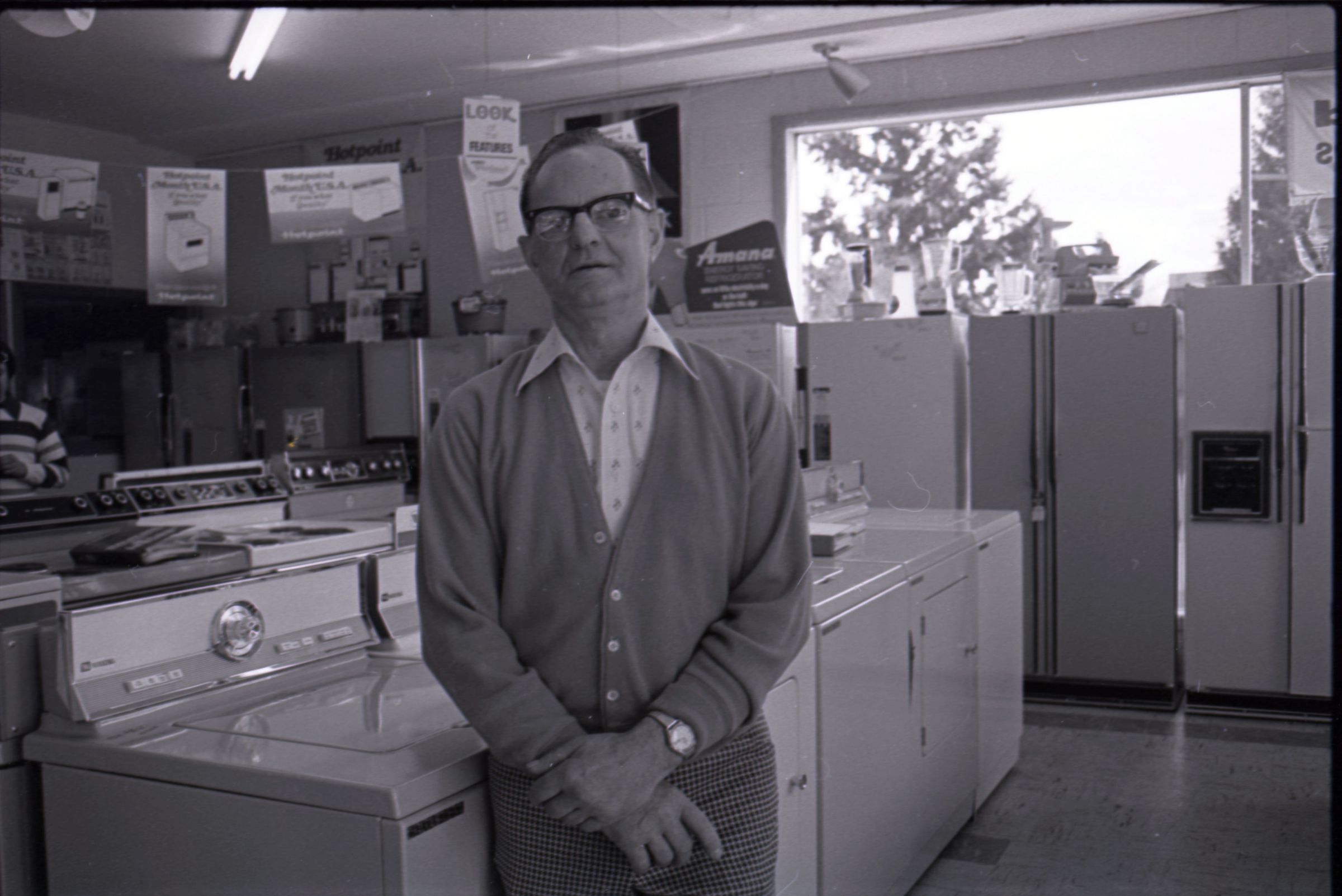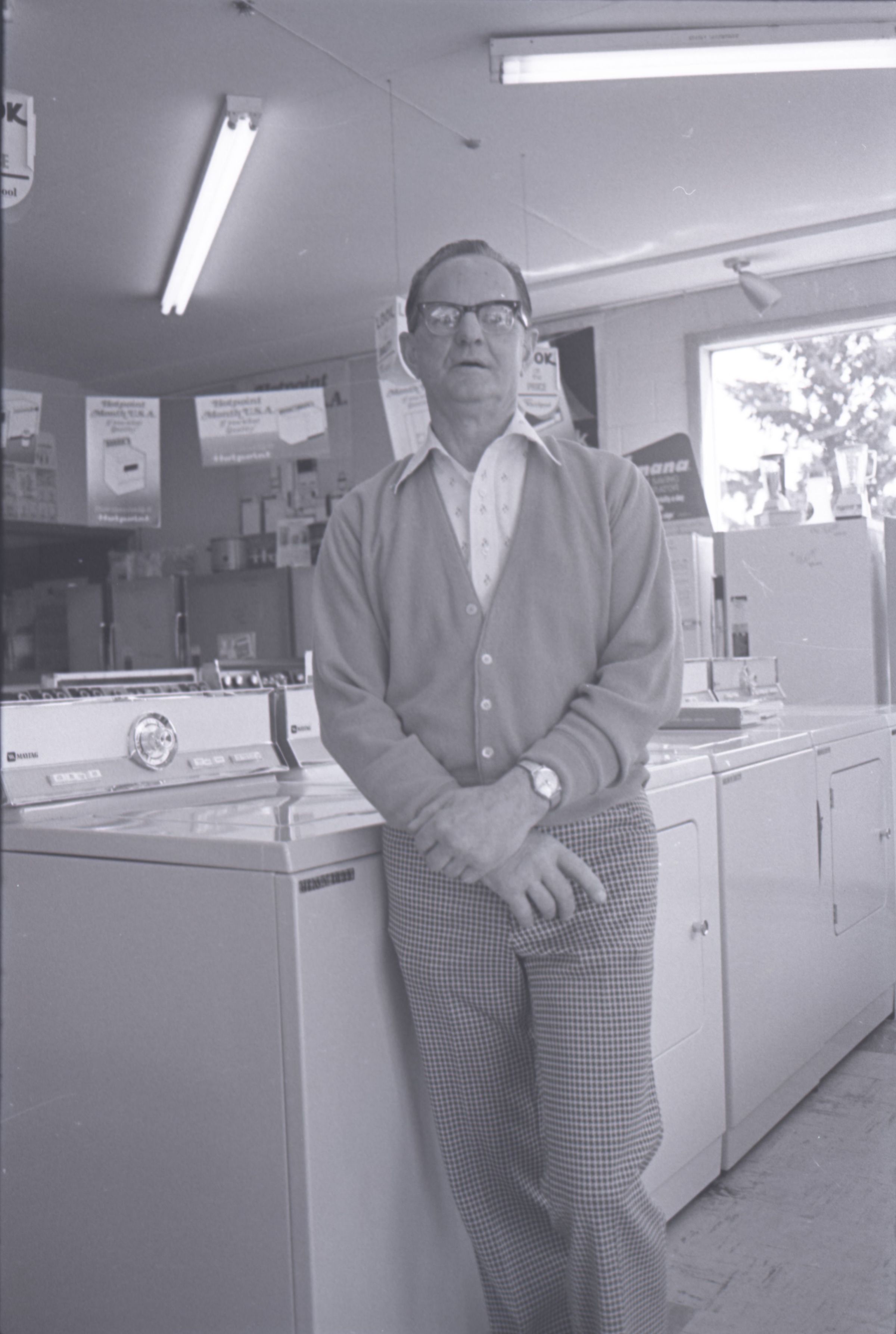 Harold's Appliance, 1979. These three black and white film negative strips were created for the Lacey Leader newspaper. These images show a man (Earl Lavasseur) posing for photos in a home appliance store. The man has combed-back hair and is wearing glasses. He is also wearing a cardigan over a button-up collared shirt, and plaid pants. He is wearing a watch on his left wrist.