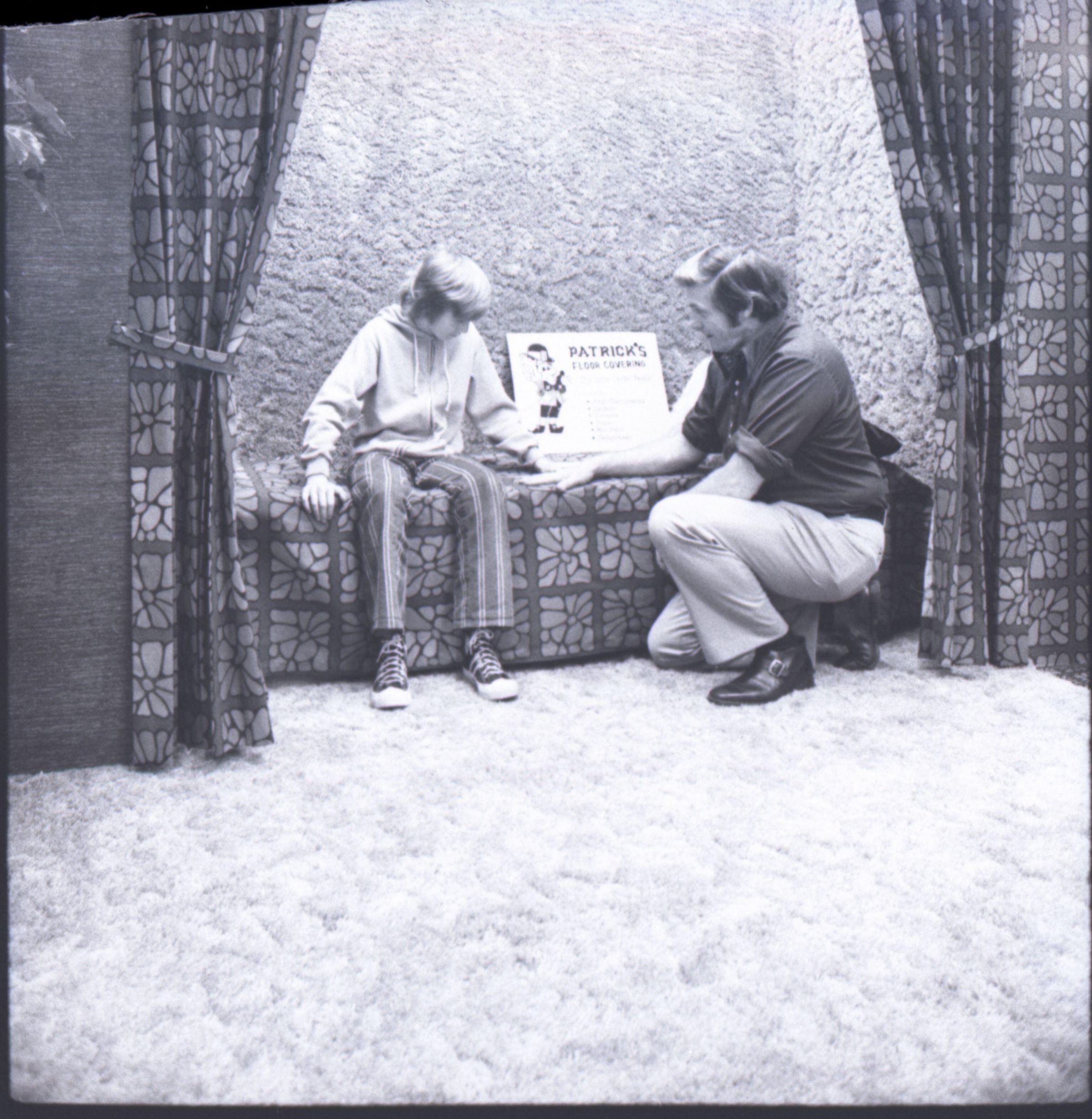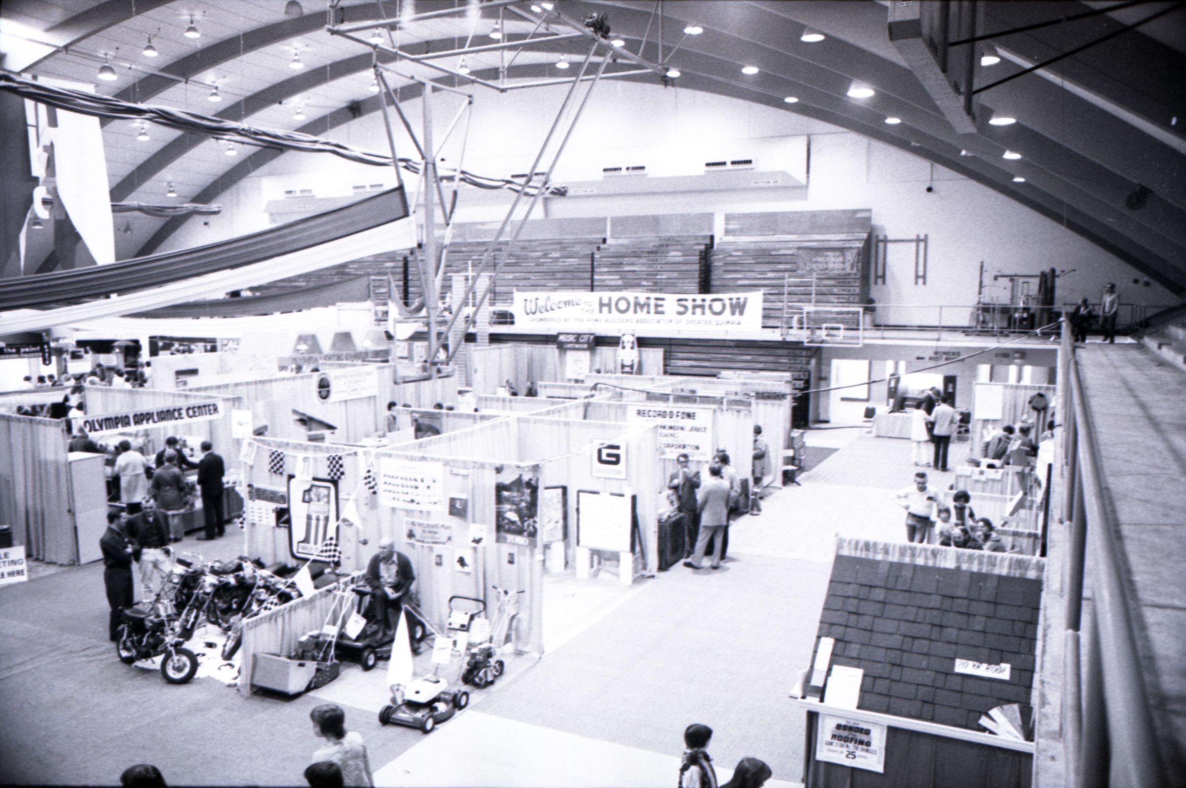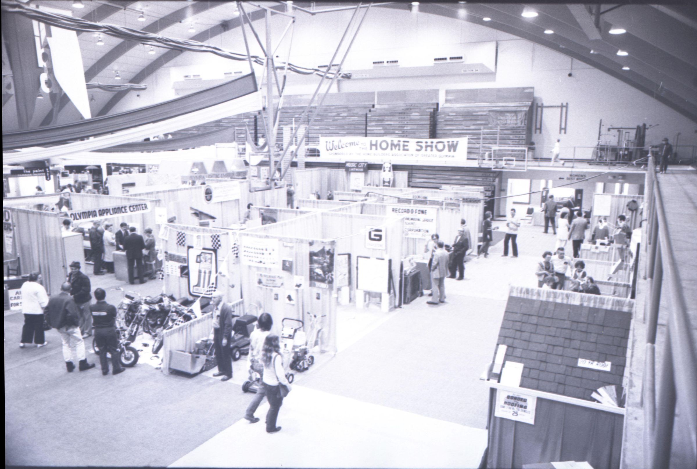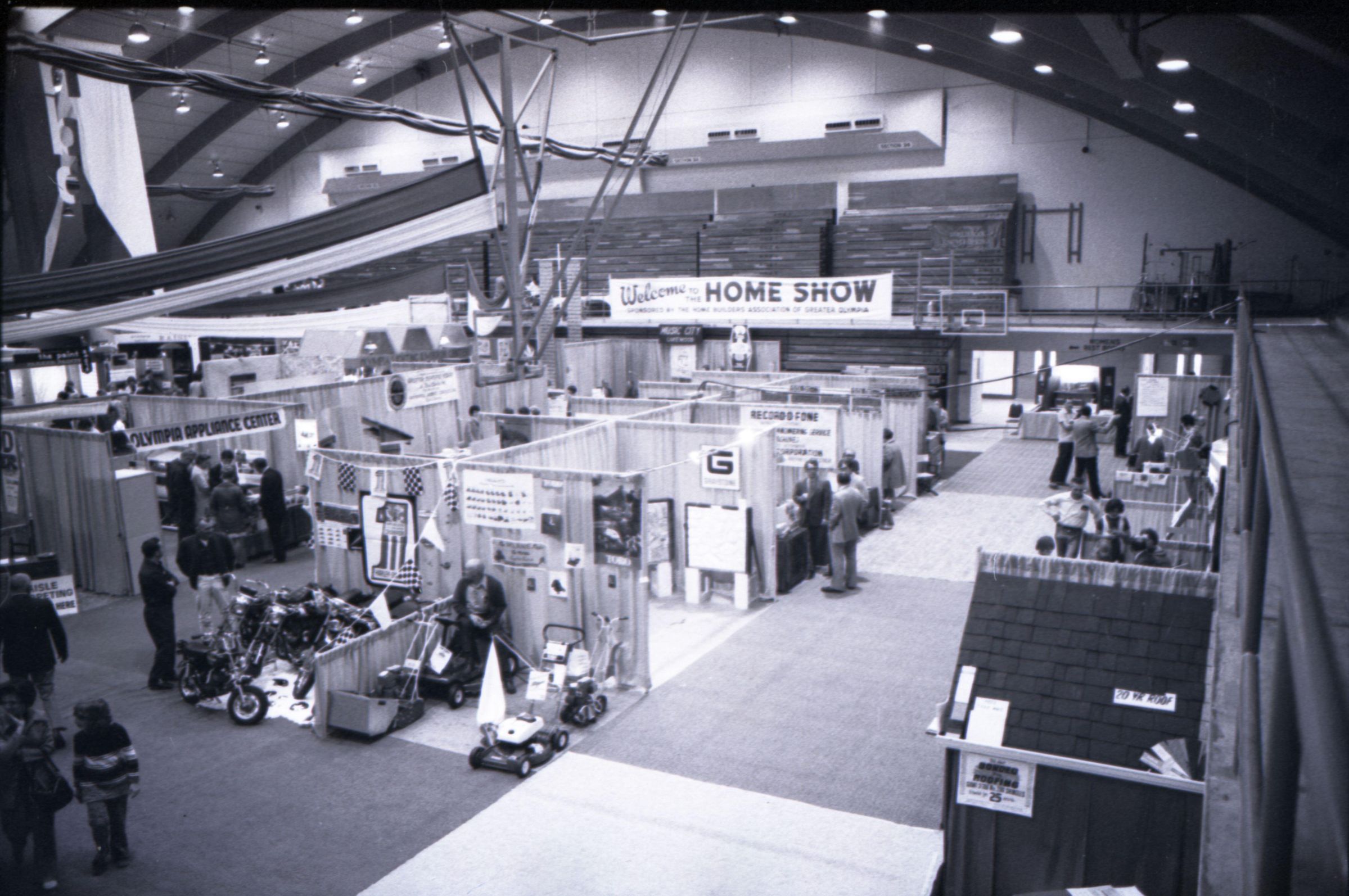 Home Show and Horses, 1972. These five black and white film negative strips were created for the Lacey Leader newspaper. These images show a home show which appears to have taken place in the pavilion on the Saint Martin's campus, and people posing with a horse outdoors.Made/Created