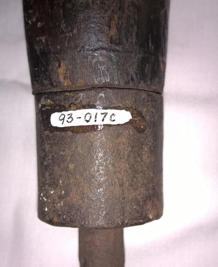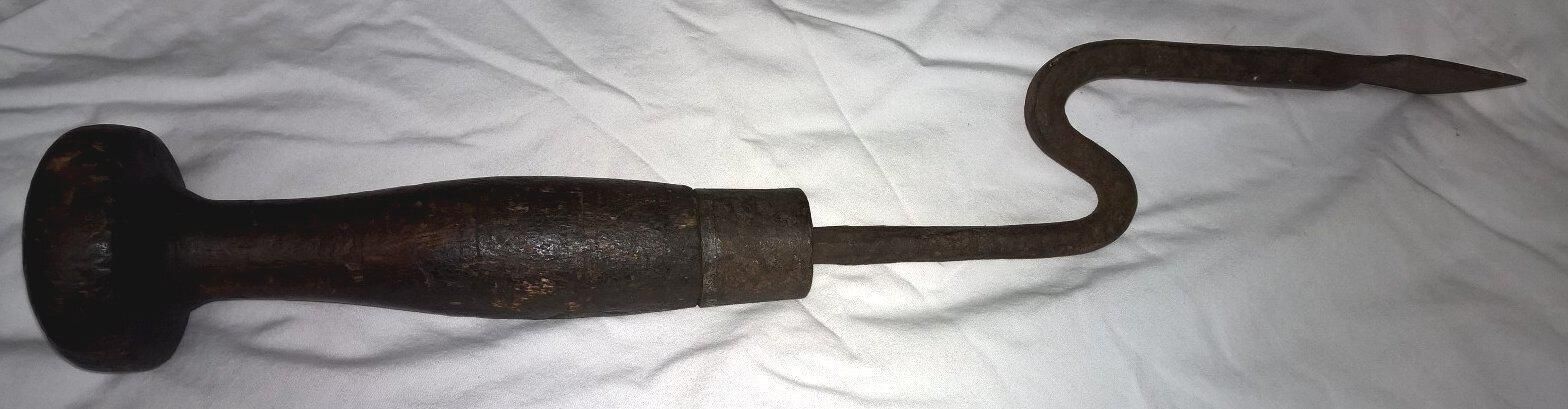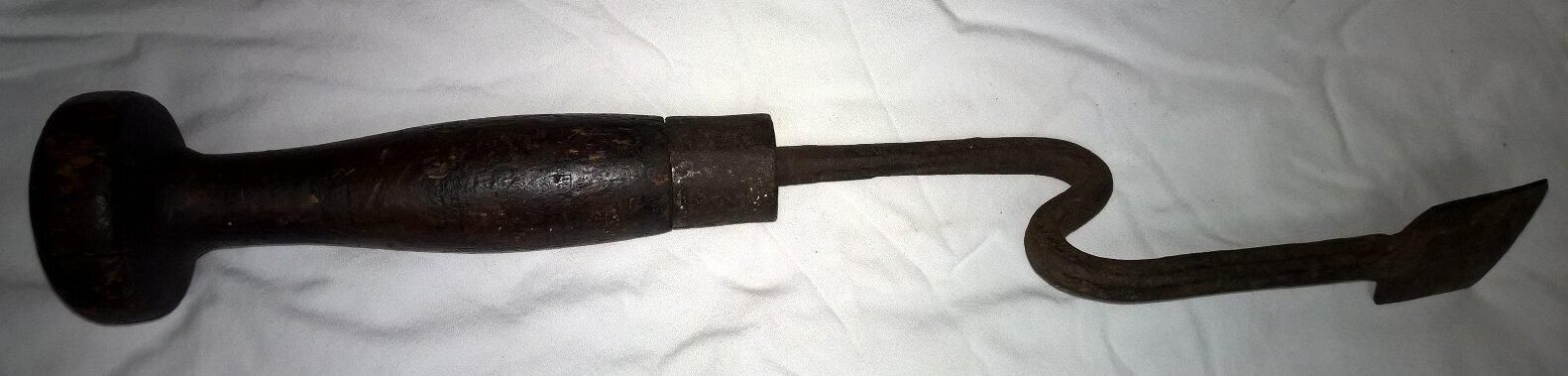 Paring tool for preparing oxen hooves for shoeing. Written material received with the donation described this object as a "buttress." One definition for buttress is "In farriery, an instrument of steel set in wood, for paring the hoof..." The object consists of an "S" shaped metal rod with a flat end sharpened as a blade, which rod is set in a round wooden handle that has a round portion to grip and a flat pad with which to push.