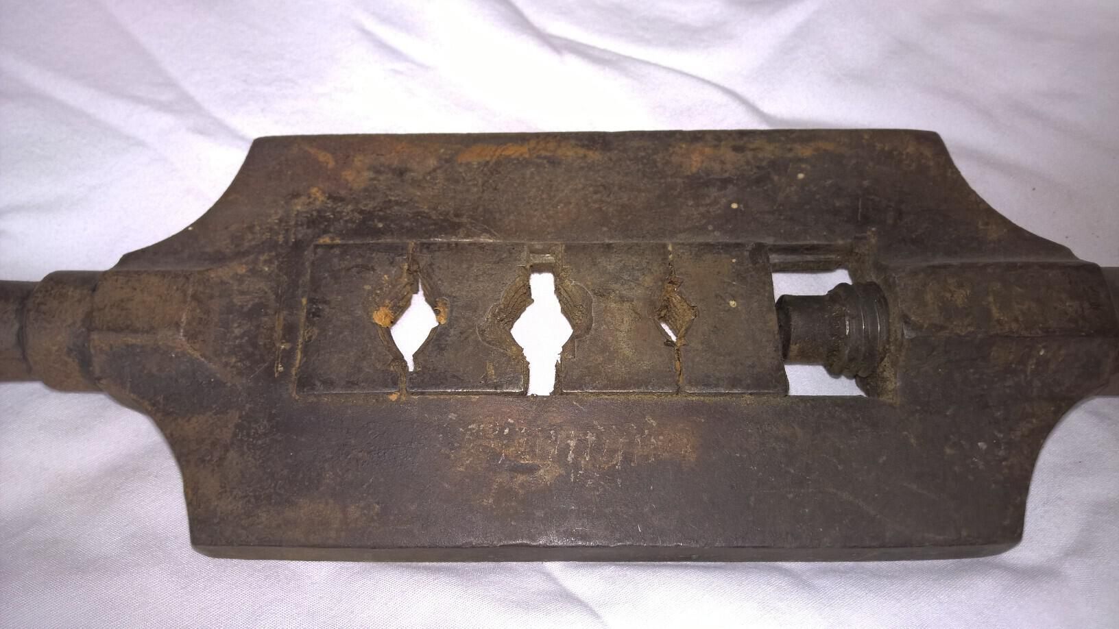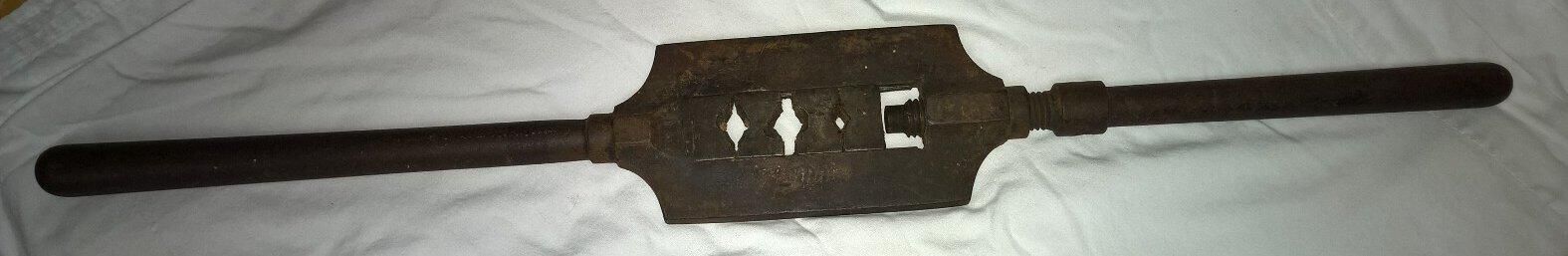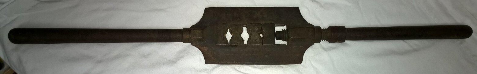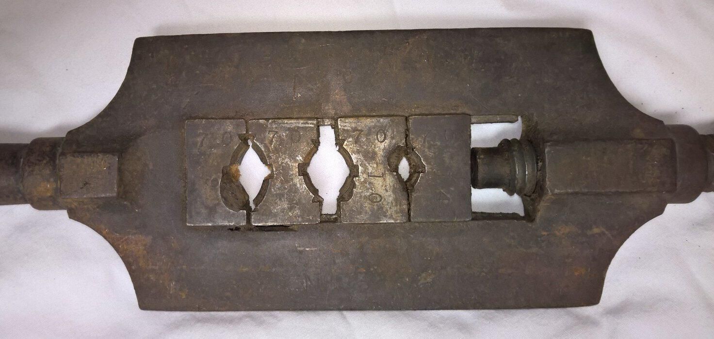 Metal threading tool for placing threads on metal rods. The object is a metal rectangle with one stationary metal piece and three sliding metal pieces that have teeth for cutting threads. A rod may be inserted in any of three openings between the pieces which fit different size rods. A round handle extends from each end of the rectangle for leverage. One of the handles may be screwed inward to tighten the sliding pieces against the rod being threaded. Stamped on each piece is "70" and on two of the pieces is "14" and "10". Stamped on the other side of the same two pieces is "1/2" and "3/4". Stamped on the rectangle itself is what appears to be "70".