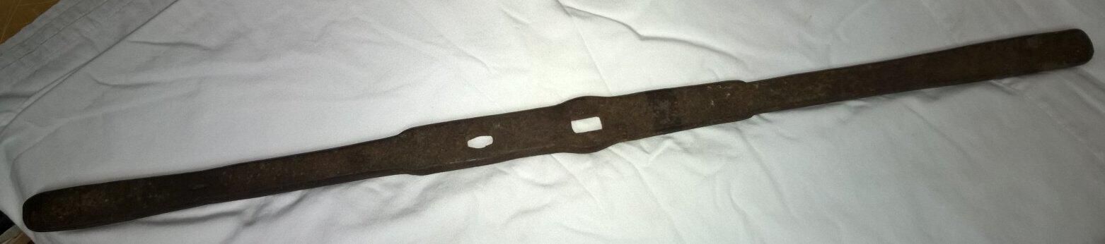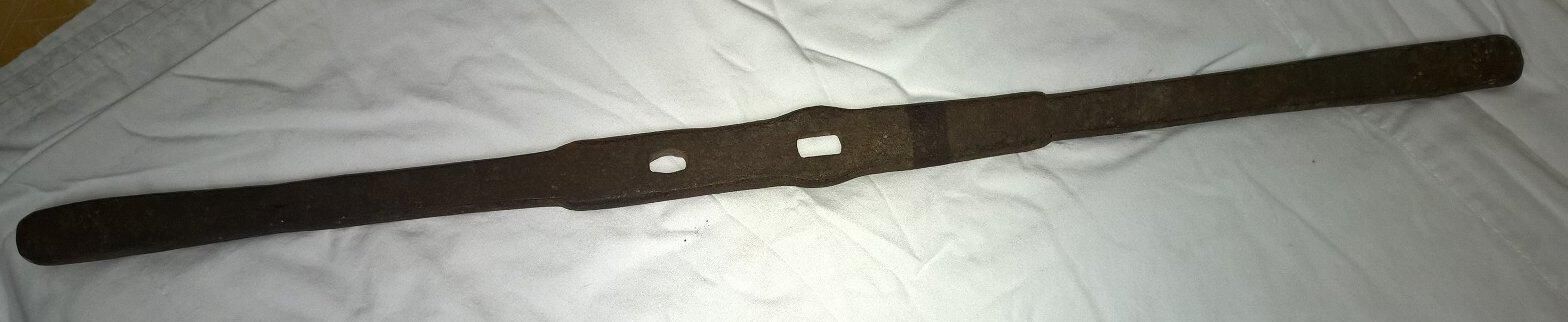Metal bar with two openings near the center that fit the shaped top portion of a threading tap. The object was used to provide leverage when cutting threads in a metal nut.