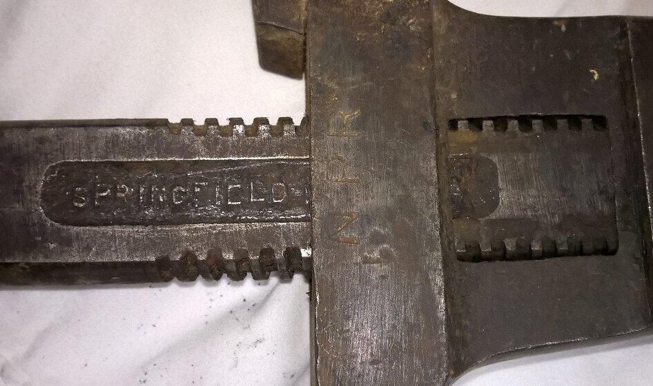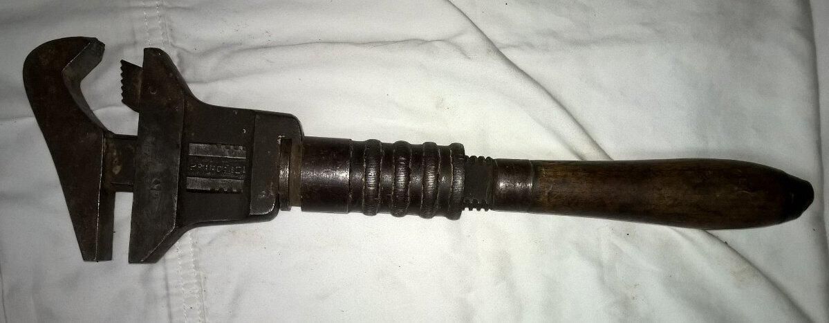 Metal combination pipe and monkey wrench with a wooden handle. There is a rotating cylinder above the wooden handle that adjusts the upper jaw to accomodate the size of a pipe up to 4" capacity. On the shaft that holds the upper jaw is stamped "Bemis & Call Co | 5 |". On the other side is stamped "Springfield Mass USA". On the lower jaw is stamped "NPR" which is believed to stand for the Northern Pacific Railway.
