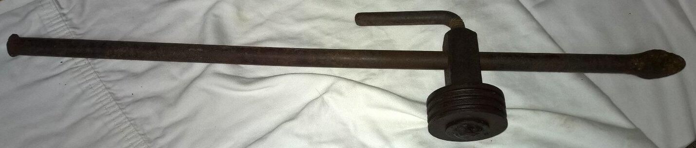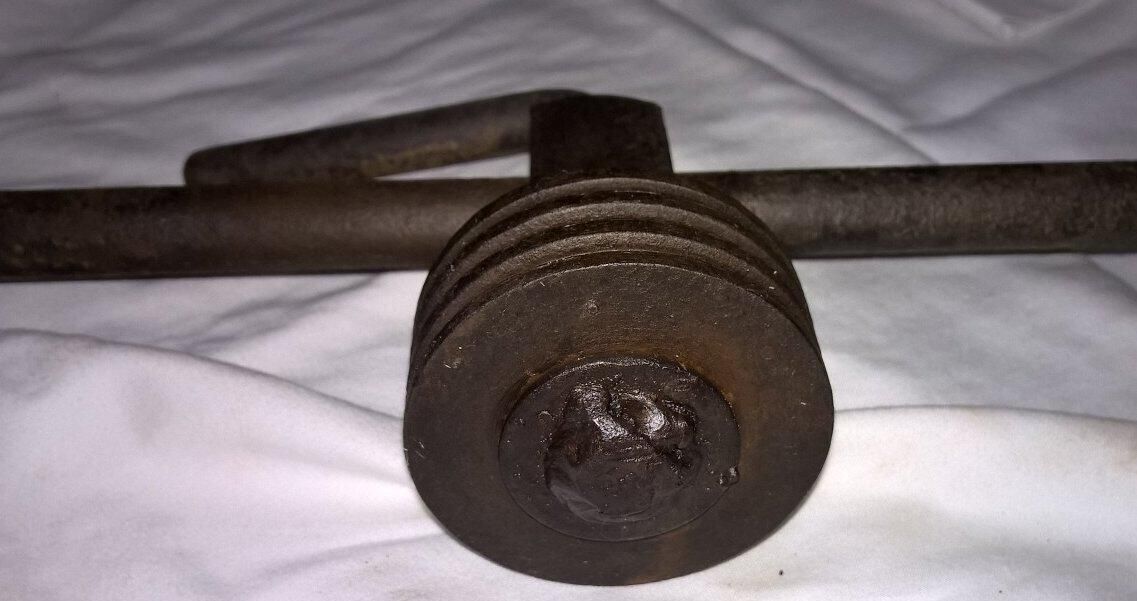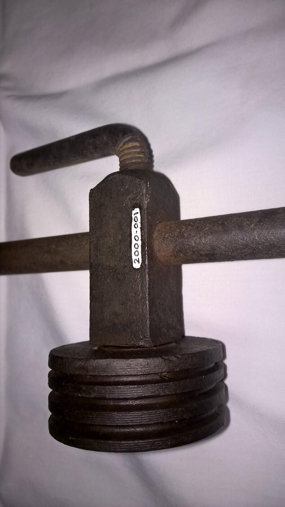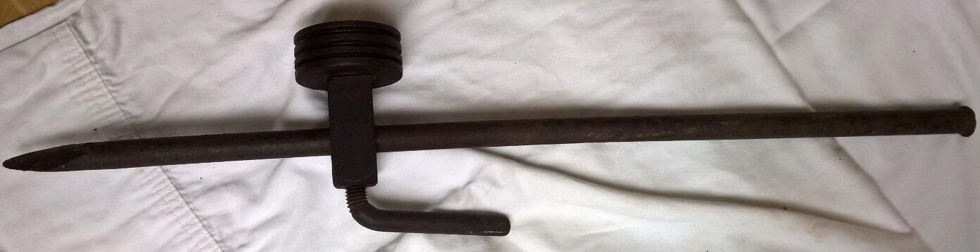 Metal forestry tool used to support a crosscut saw while bucking a fallen tree. The object consists of a long rod upon which a square metal piece slides back and forth. At one end of the sliding piece is a threaded handle that can be tightened to lock the sliding piece in place. At the other end of the sliding piece is a rotating wheel with three parallel grooves into which the saw would fit. One end of the rod is flattened to a chisel point which sticks into the tree.Made/Created