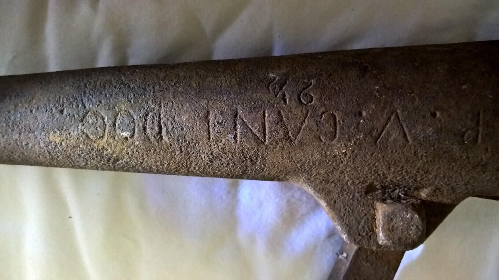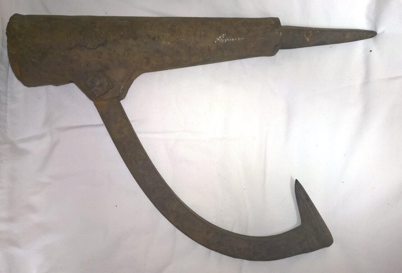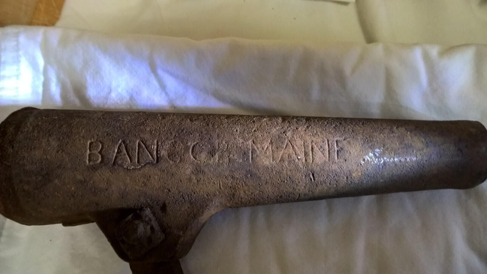 Metal device with a spike protruding from the end and a curved arm with a hook at the end attached to a pivot a short distance away from the spike. The spike is rammed into a log, then the hook grabs the log at a second location usually to turn the log. At the opposite end of the spike assembly is an opening to insert a wooden handle. No handle is present for this object. Stamped on one side of the body where the wooden handle could be inserted is what appears to be "P. V. CANT DOG 2 1/2" On the other side is what appears to be "BANGOR" and "MAINE".Made/Created