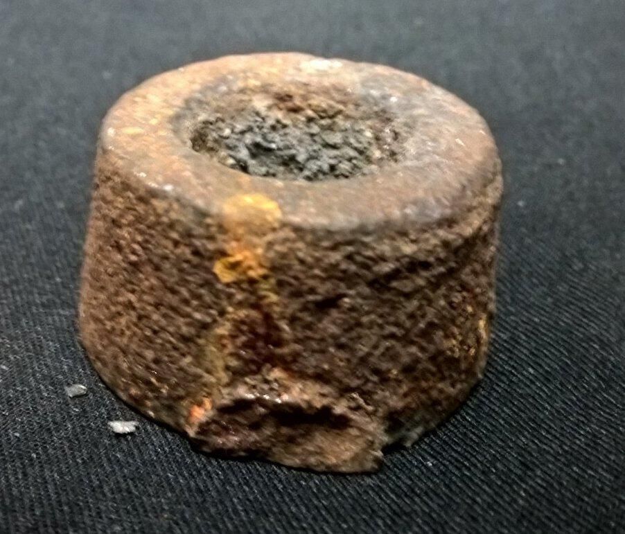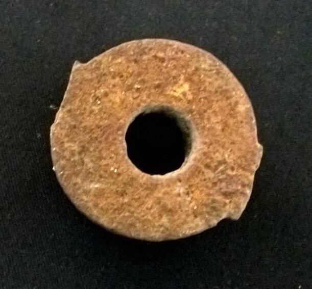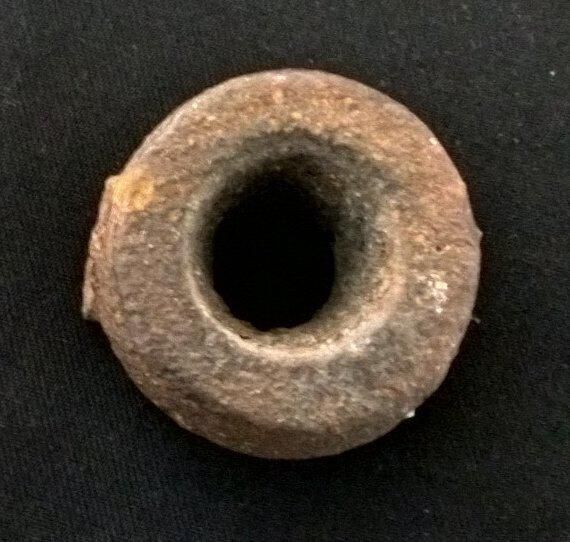Cast iron doughnut-shaped object with both the exterior and the center opening tapered. On opposite sides of the large end of the exterior are semicircular flat areas that give the appearance of a break from a casting mold or another object.Made/Created