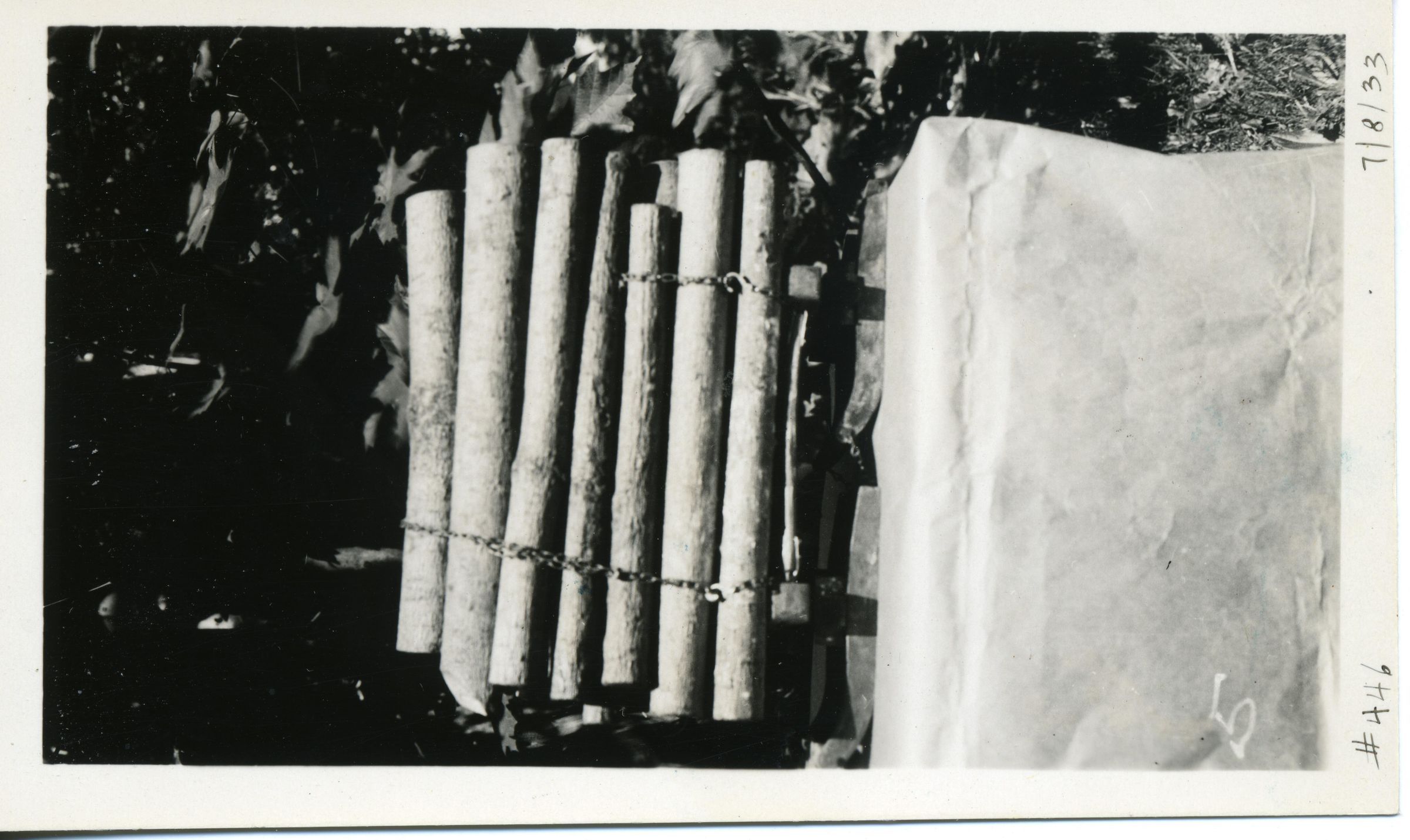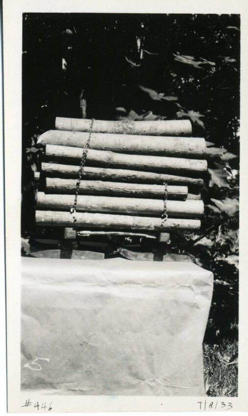 Black and white photo of a model of a load of logs. There is a stack of miniature logs on a model trailer. Two chains extend from the trailer up and over the logs. The model is sitting on a stand covered by paper. Foliage is visible in the background. There is a white border on all sides, and in the bottom border is "#446" and "7/8/33". On the back is "0007".