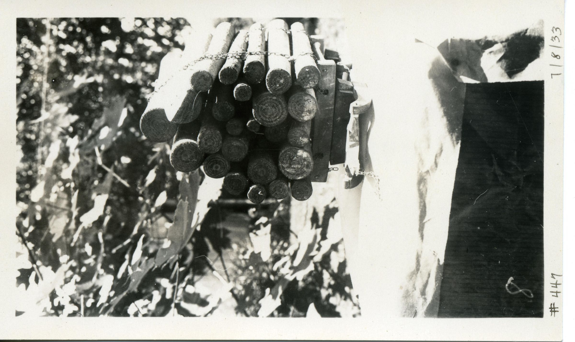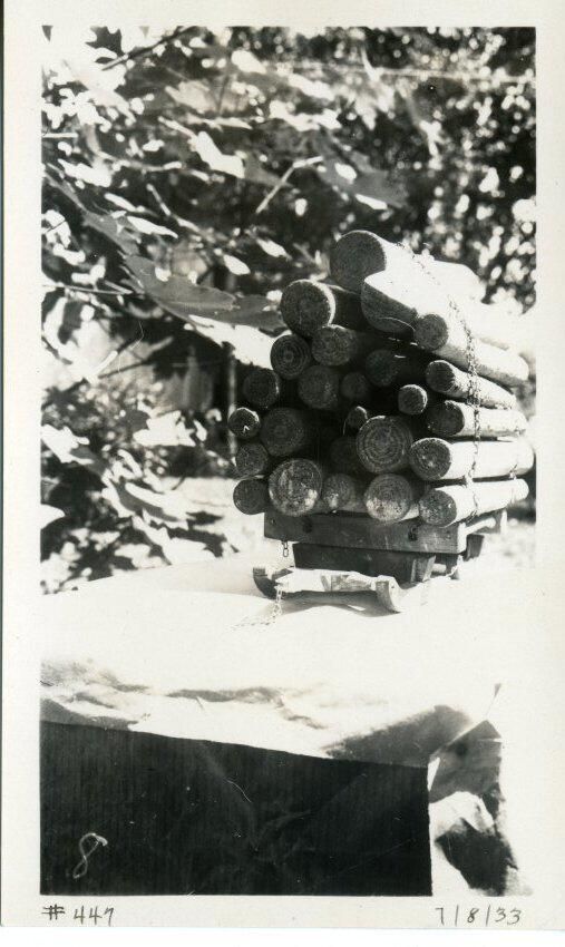 Black and white photo of a model of a load of logs. There is a stack of miniature logs on a model of a sled. A chain extends from the sled up and over the logs. The model is sitting on a stand covered by paper. Foliage is visible in the background. There is a white border on all sides, and in the bottom border is "#447" and "7/8/33". On the back is "0007".