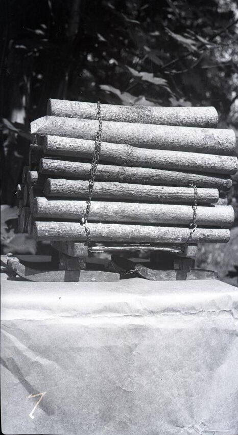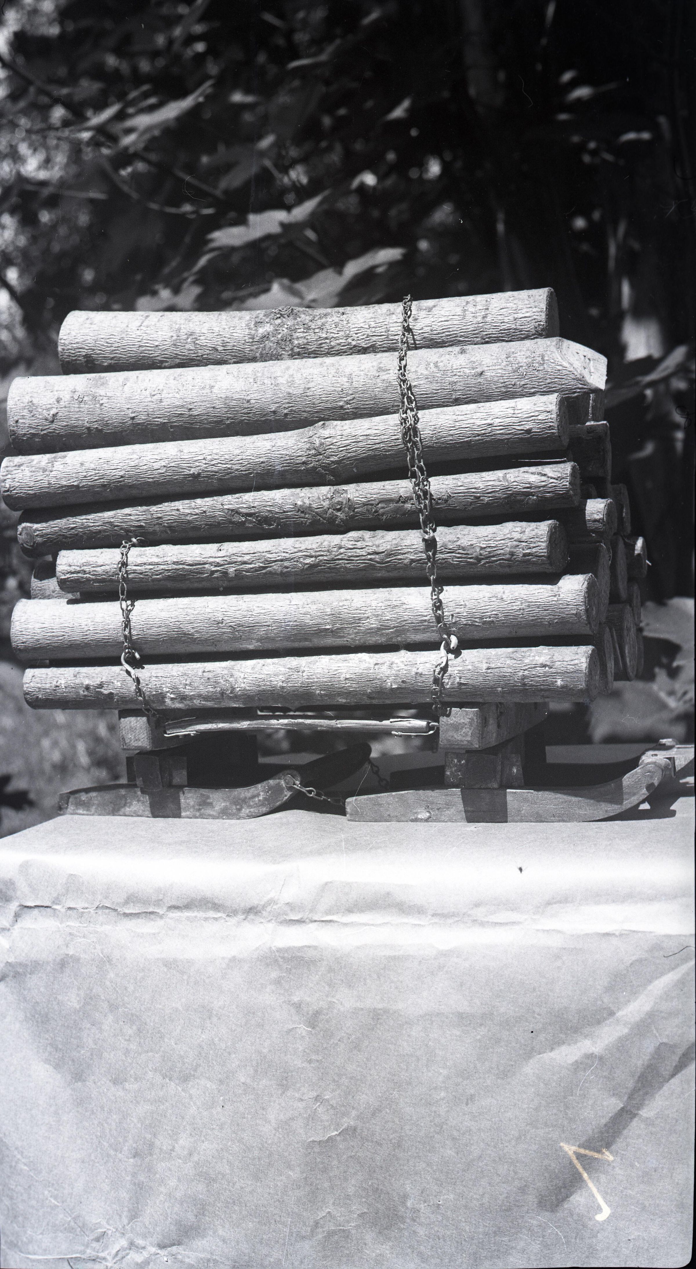 Black and white negative of a model of a load of logs. There is a stack of miniature logs on a model trailer. Two chains extend from the trailer up and over the logs. The model is sitting on a stand covered by paper. Foliage is visible in the background. There is a white border on all sides, and in the bottom border is "#449" and "7/8/33".