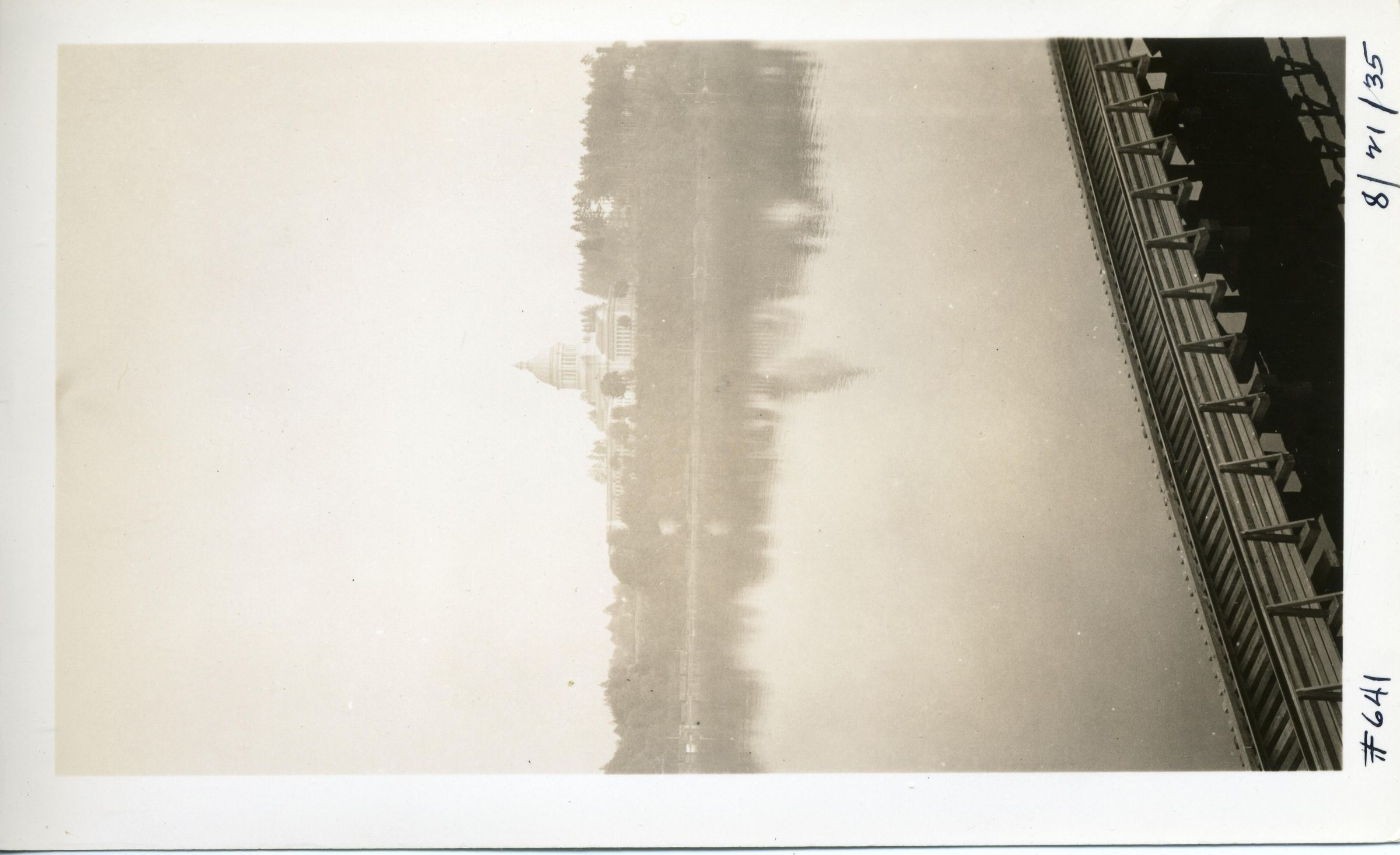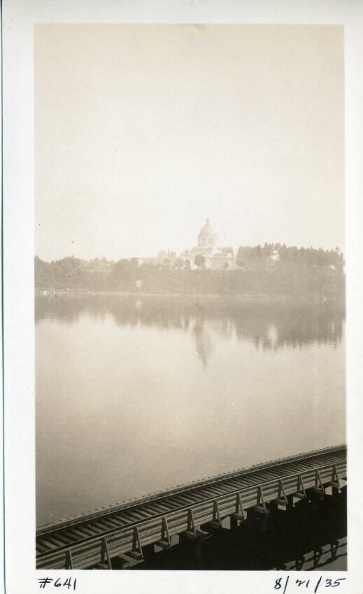 Black and white photo of the Legislative Building. In the foreground is a railroad track, and beyond that is the water of the Des Chutes River. In the background is dimly seen the Capitol group along with trees. There is a white border on all sides, and in the bottom border is "#641" and "8/21/35". On the back is what appears to be "A 7" and in pencil"8/21/35"..
