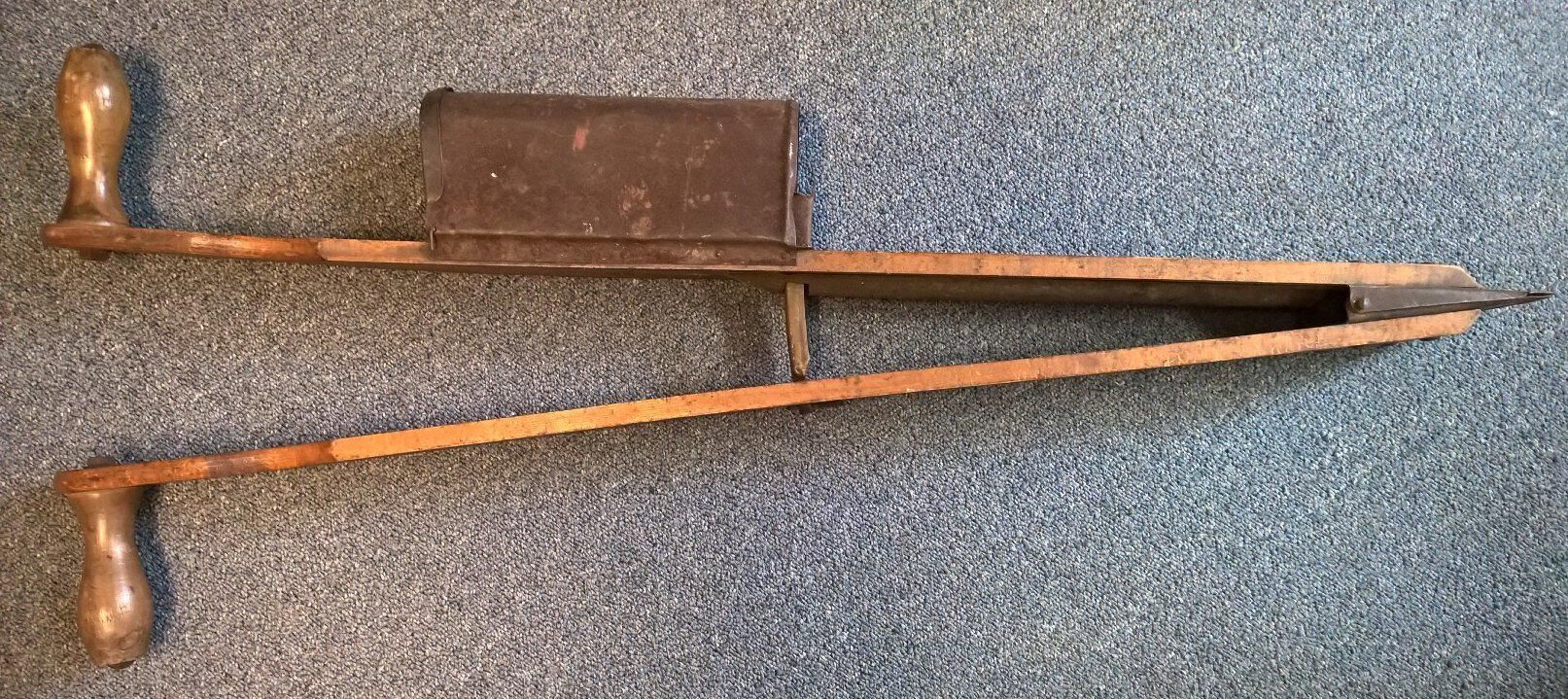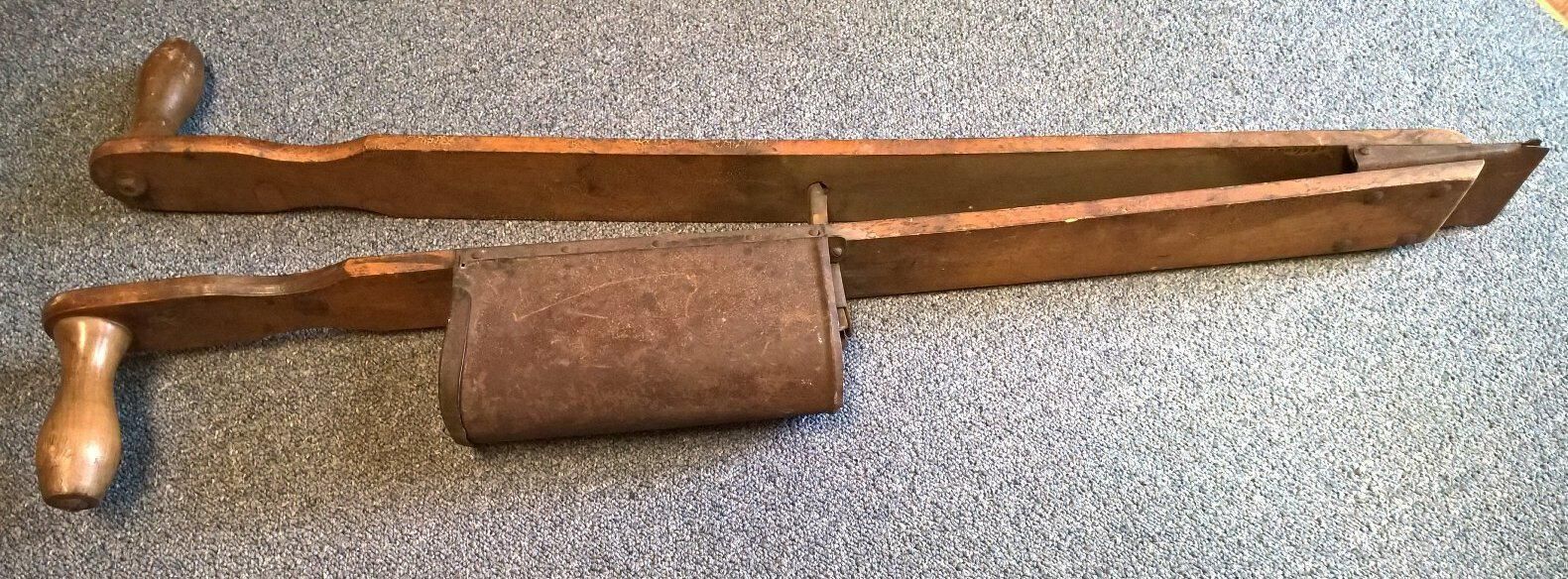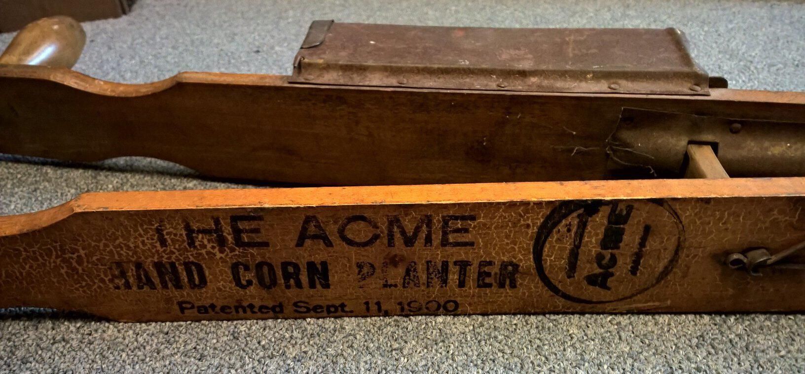 Wood and metal planting device for planting or seeding corn by hand. Two wooden slats are hinged together at the bottom and each have a round (turned) handle at the top. The hinges have metal blades that come together when the slats are spread apart at the top so as to permit insertion into the ground. When the slats are then pulled together at the top the blades separate and create an opening in the ground. Attached to one slat is a metal bin to hold the seed and when the slats are pulled together one seed is extracted from the bin and falls through a tube on the inside of one of the slats into the opening in the ground. Painted (or printed) on the outside of one of the slats is "The Acme hand corn planter, patented Sept. 11, 1900" "Acme" in a circle, and "Polson Implement Co. Seattle-Portland-Spokane".Made/Created