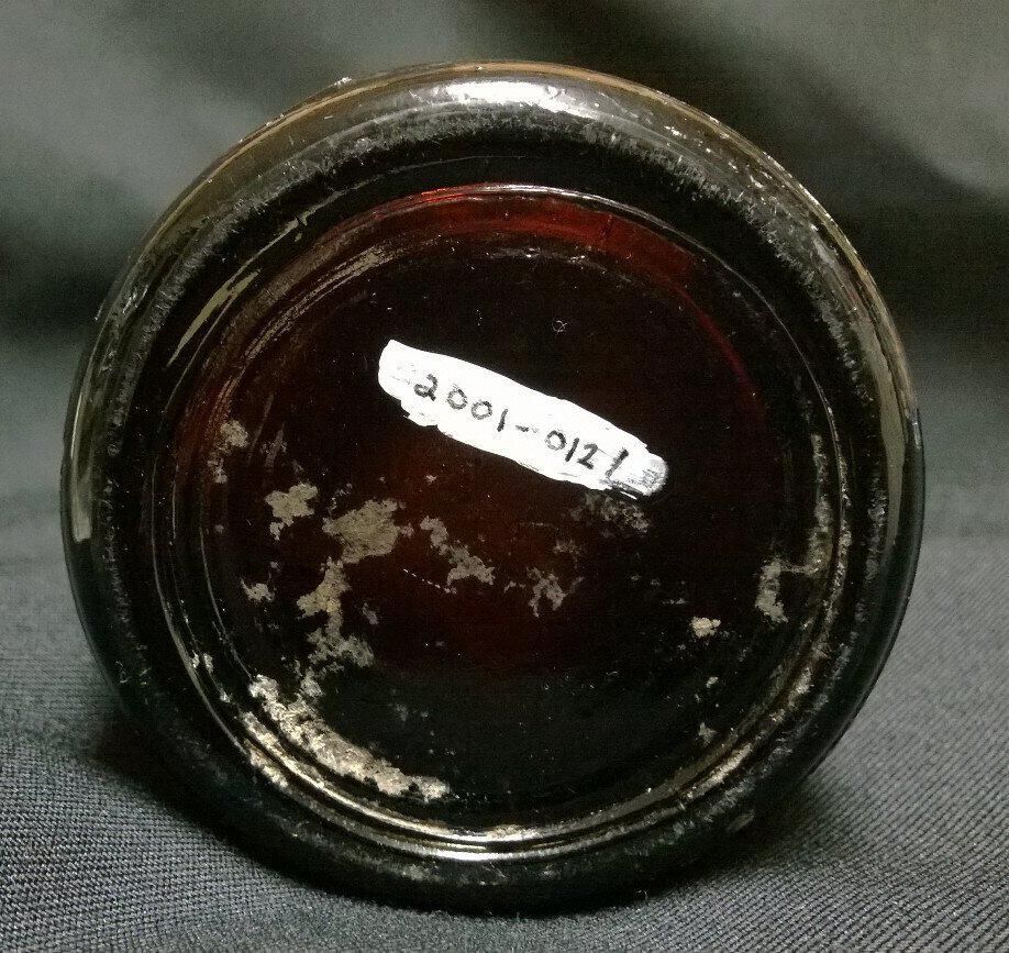 Brown glass bottle. The bottle is round with straight sides about half way up the side where the bottle tapers to a smaller top. Embossed near the bottom is "WF653". There is a mold seam that extends from the bottom up to and over the lip and there are horizontal seams just below the lip and on the bottom. The bottom is slightly recessed inside a rim around the edge. The top is slightly wider than the neck and the lip is rounded.