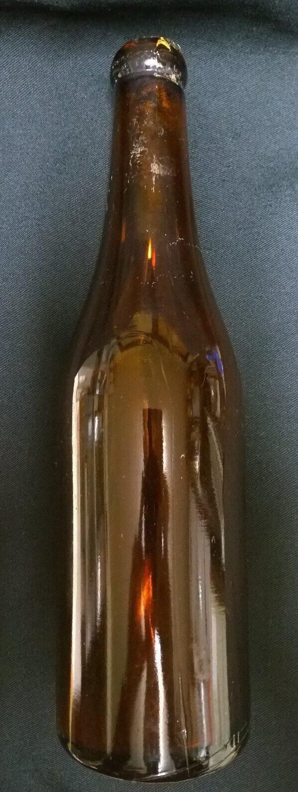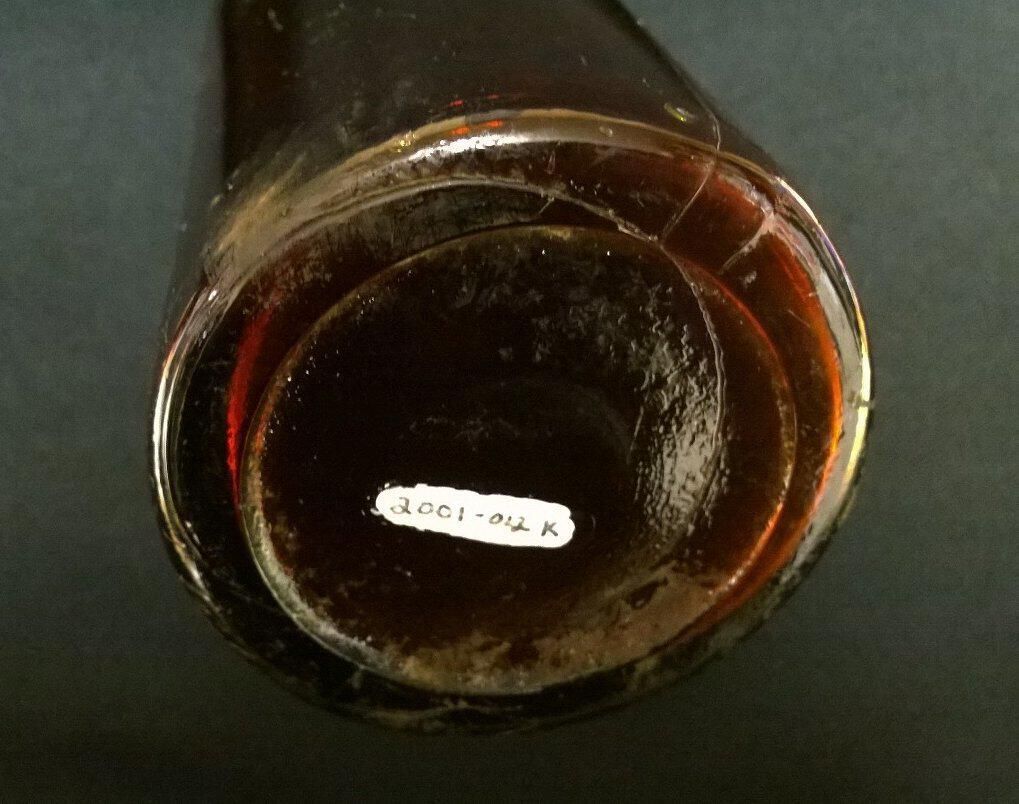 Brown glass bottle. The bottle is round with straight sides about half way up the side where the bottle tapers to a smaller top. Embossed near the bottom is "23511". There is a mold seam that extends from the bottom up to and over the lip and there are horizontal seams just below the lip and on the bottom slightly off center. The bottom is slightly recessed inside a rim around the edge. The lip is rounded and the top is chipped all around.
