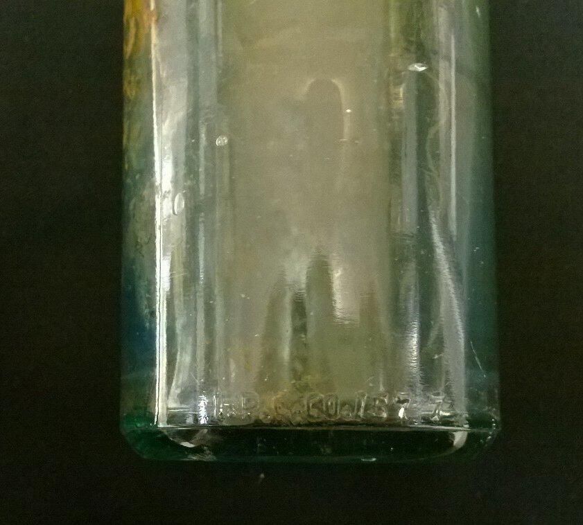 Blue-green glass bottle. The bottle is round with straight sides about half way up the side where the bottle tapers to a smaller top. Embossed near the bottom is "IPG CO 1577". There is a mold seam that extends from the bottom to the lip and there are horizontal seams just below the lip and on the bottom. The bottom is slightly recessed inside a rim around the edge. The lip is rounded and the top of the lip is chipped away all around.