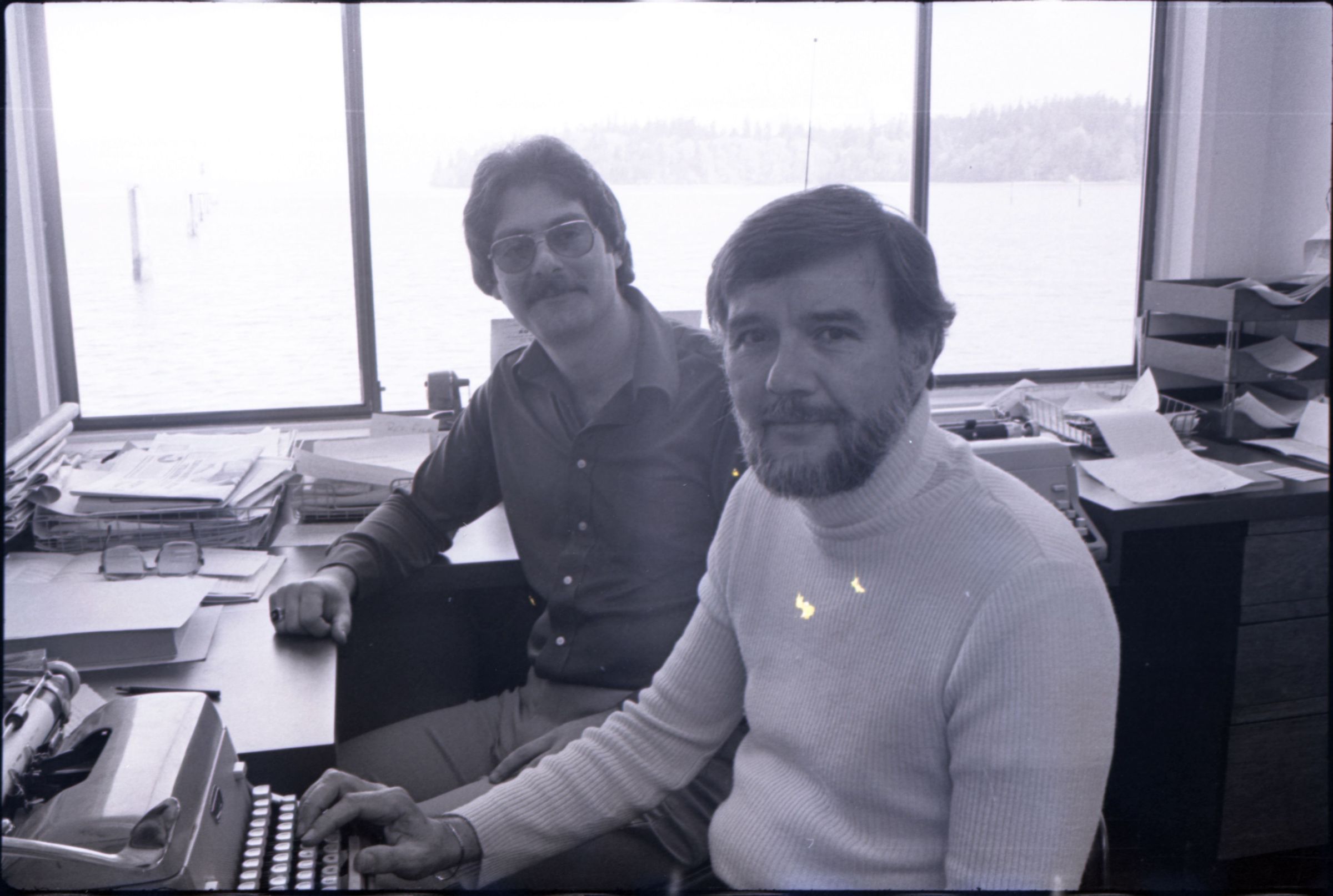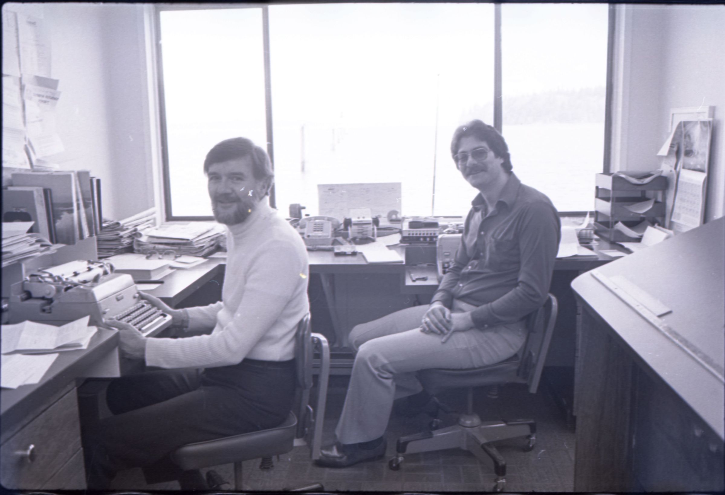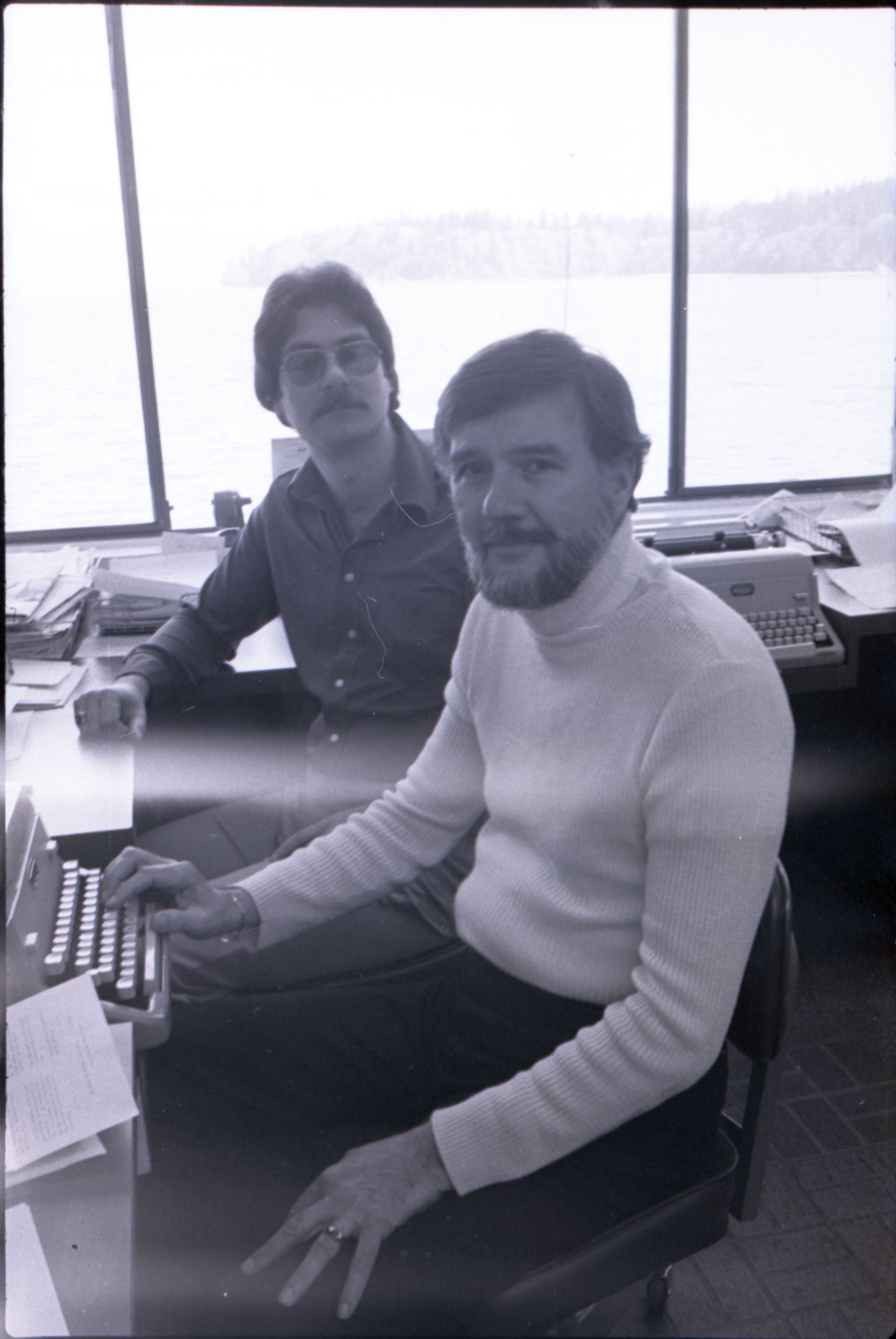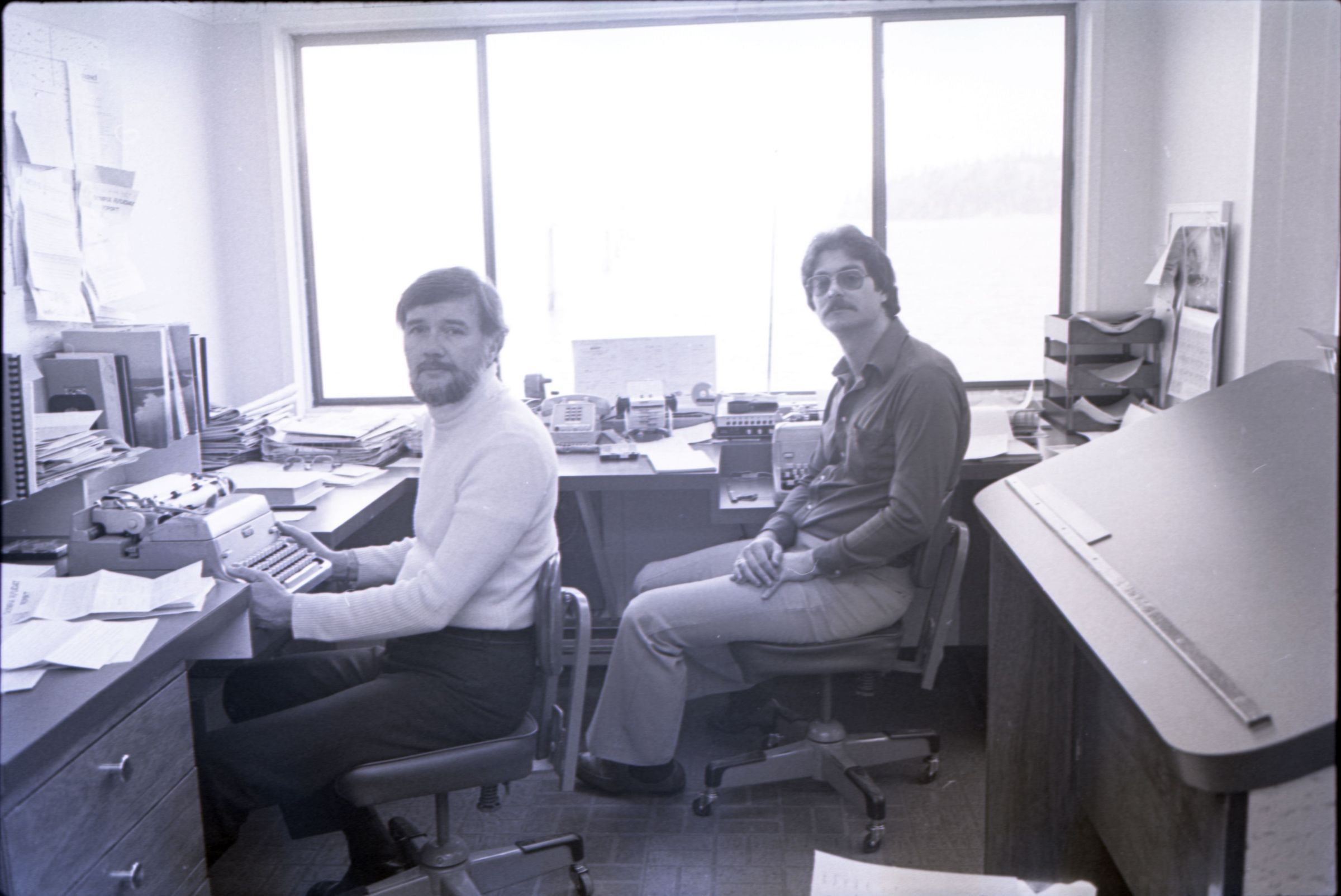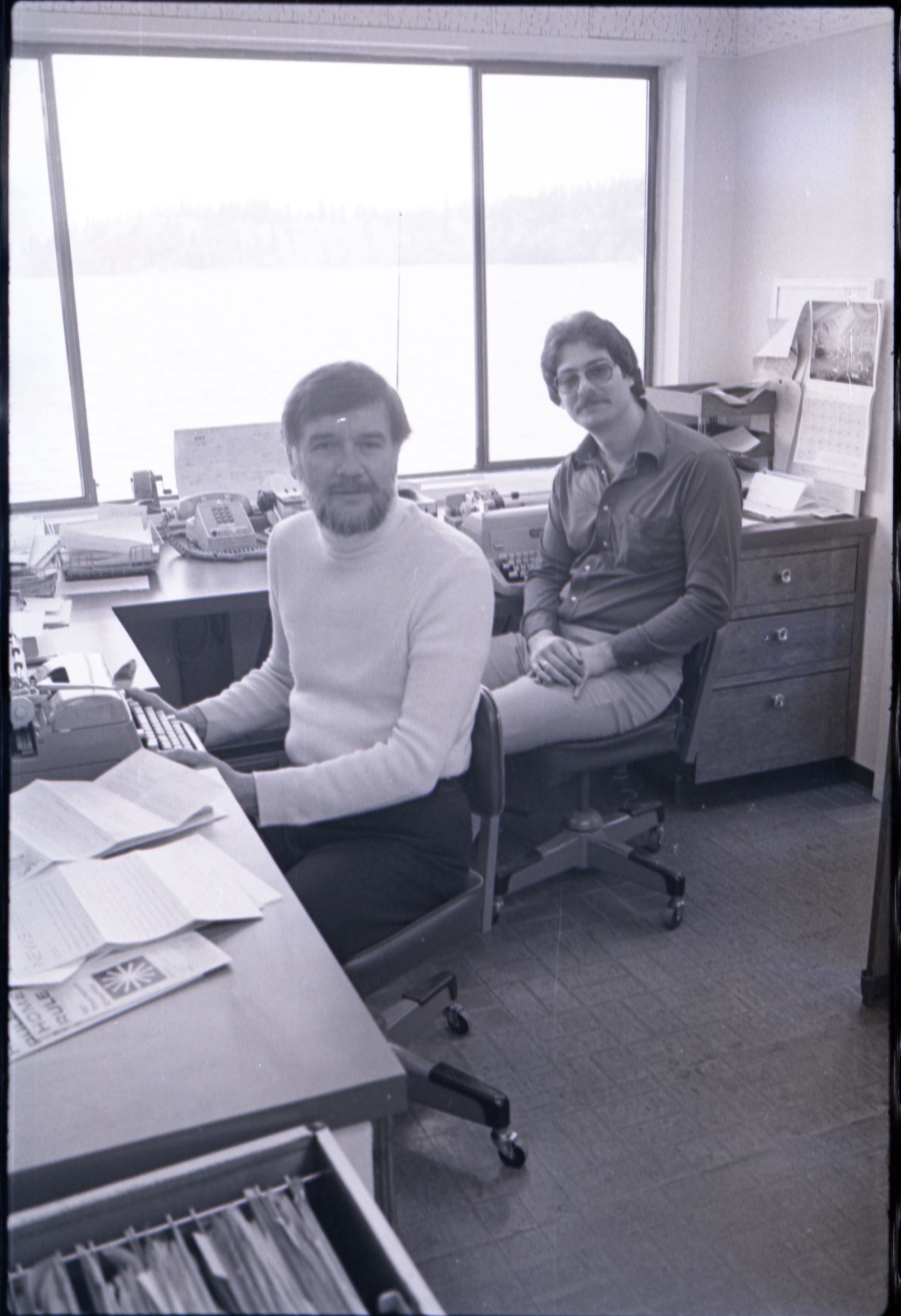KGY, 1979. This single black and white film negative strip was created for the Lacey Leader newspaper. These images show two men seated at an L-shaped desk in an office. One of the men has hair parted toward his left and a beard, He is wearing a turtleneck sweater and slacks. The other man has hair parted at the center and a mustache and is wearing glasses. He is wearing a button-up, collared shirt and slacks.
