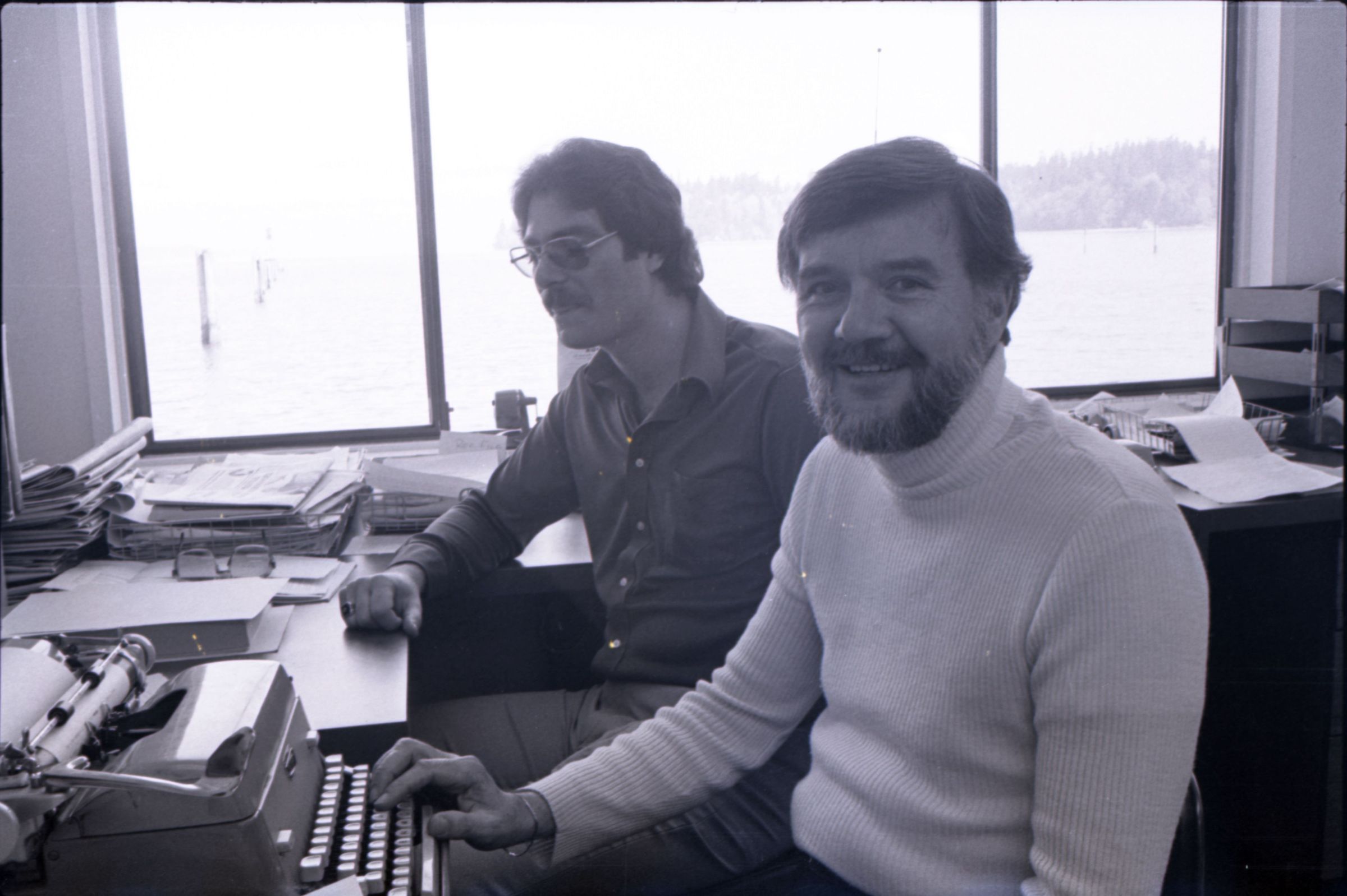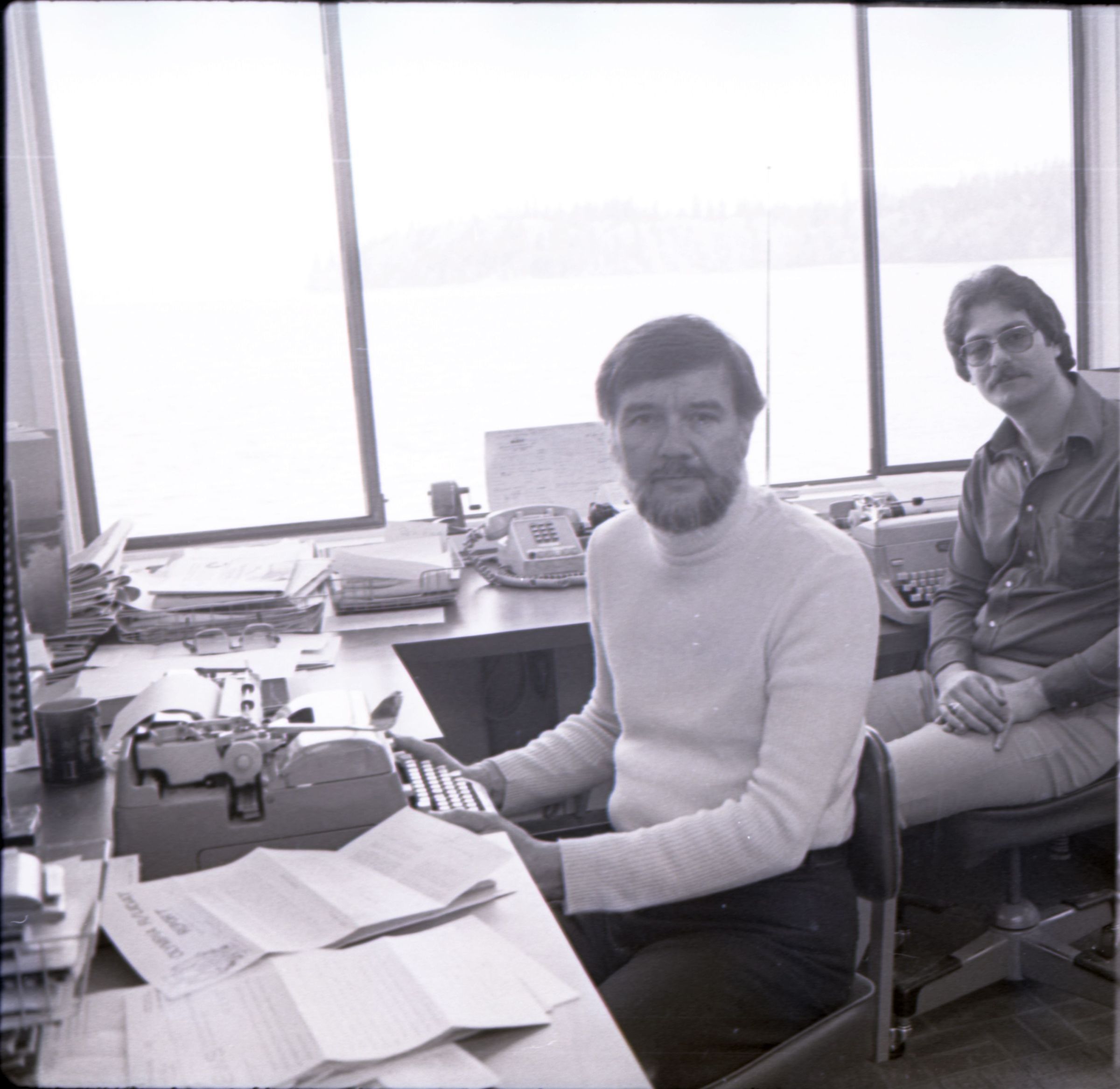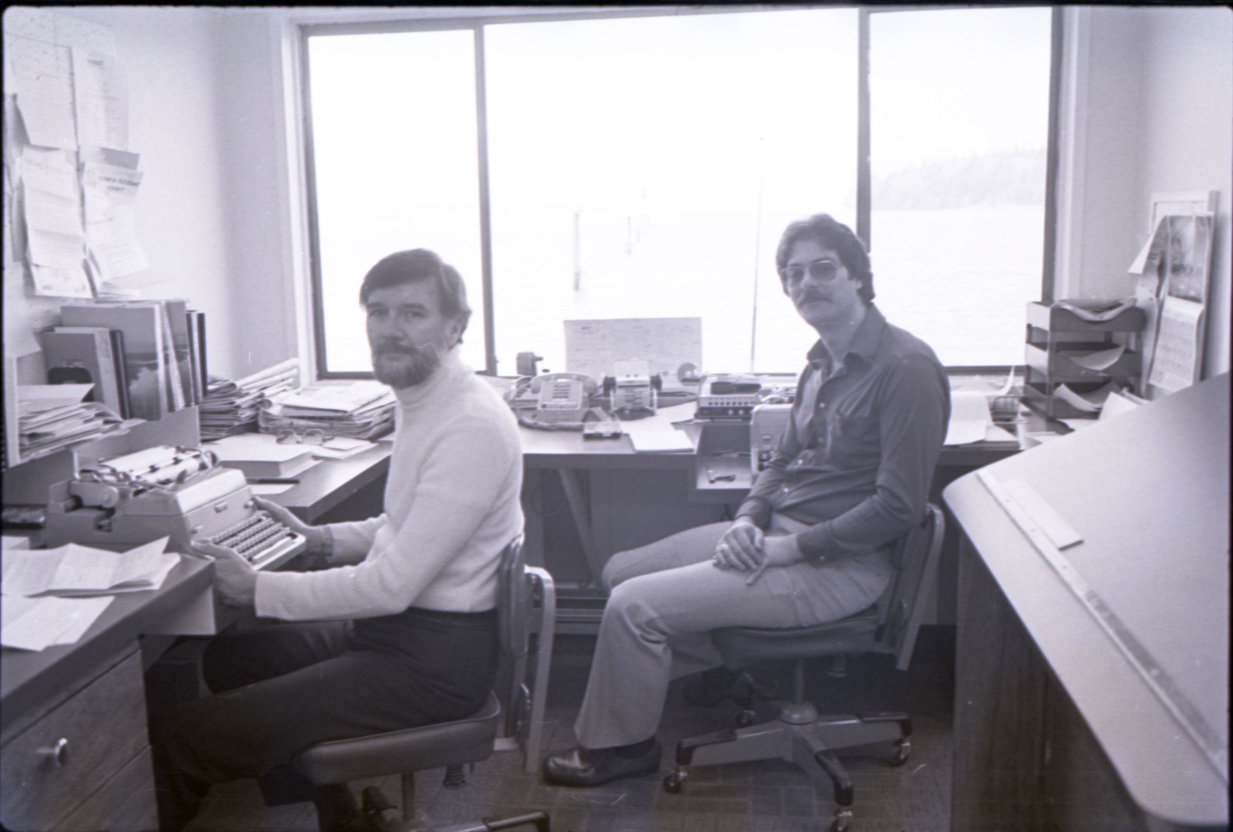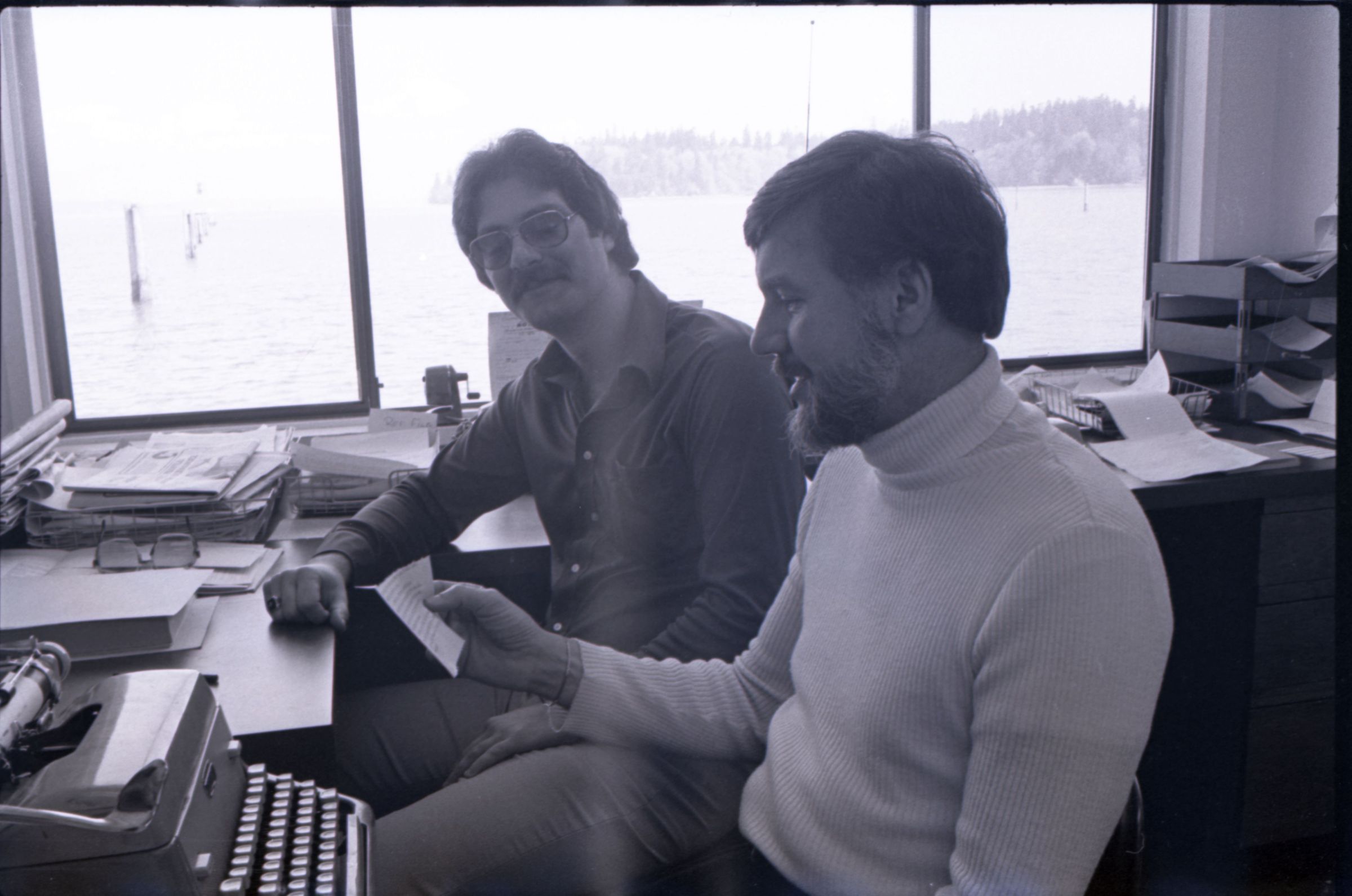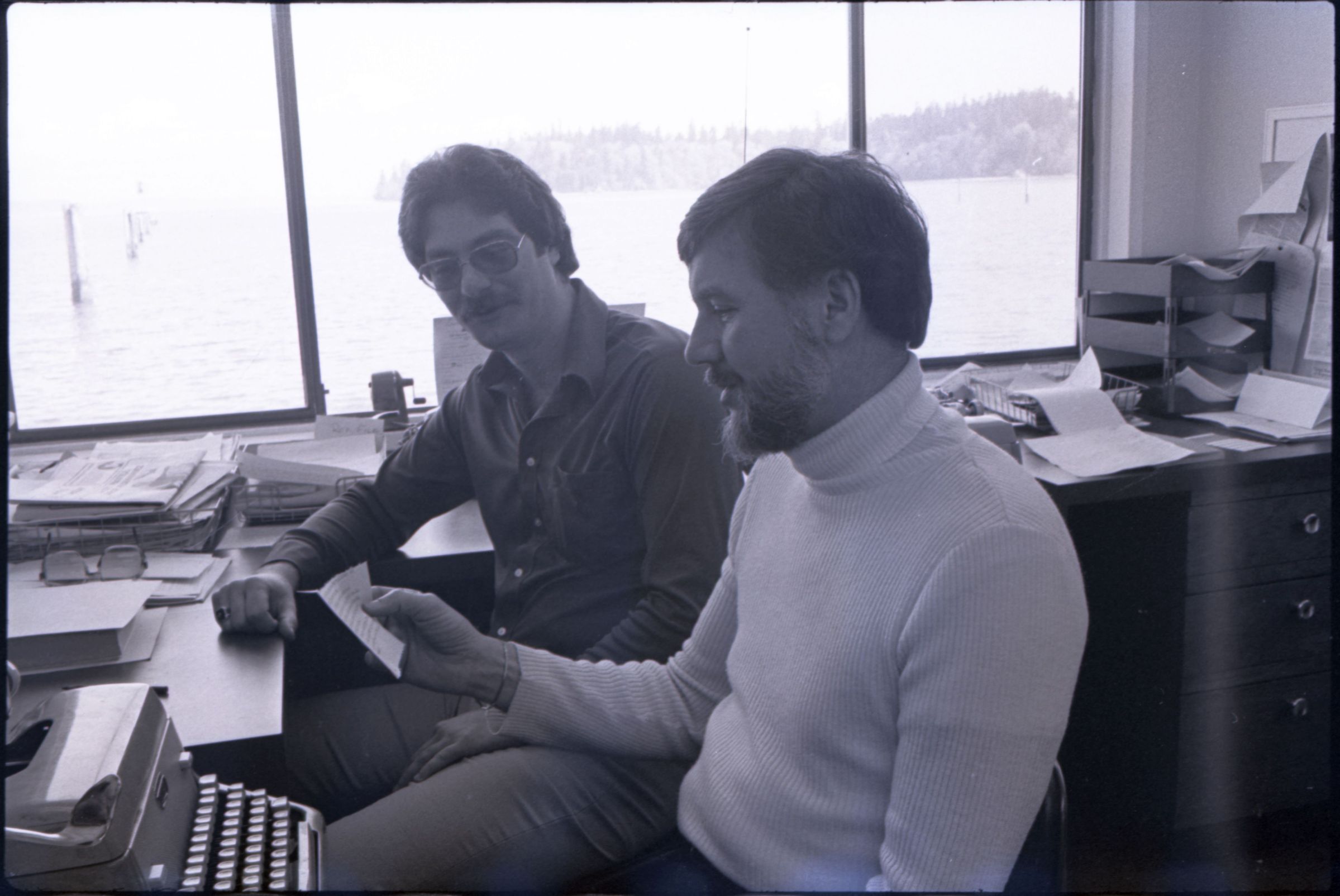 KGY, 1979. This single black and white film negative strip was created for the Lacey Leader newspaper. These images show two men seated at an L-shaped desk in an office. One of the men has hair parted toward his left and a beard, He is wearing a turtleneck sweater and slacks. The other man has hair parted at the center and a mustache and is wearing glasses. He is wearing a button-up, collared shirt and slacks.