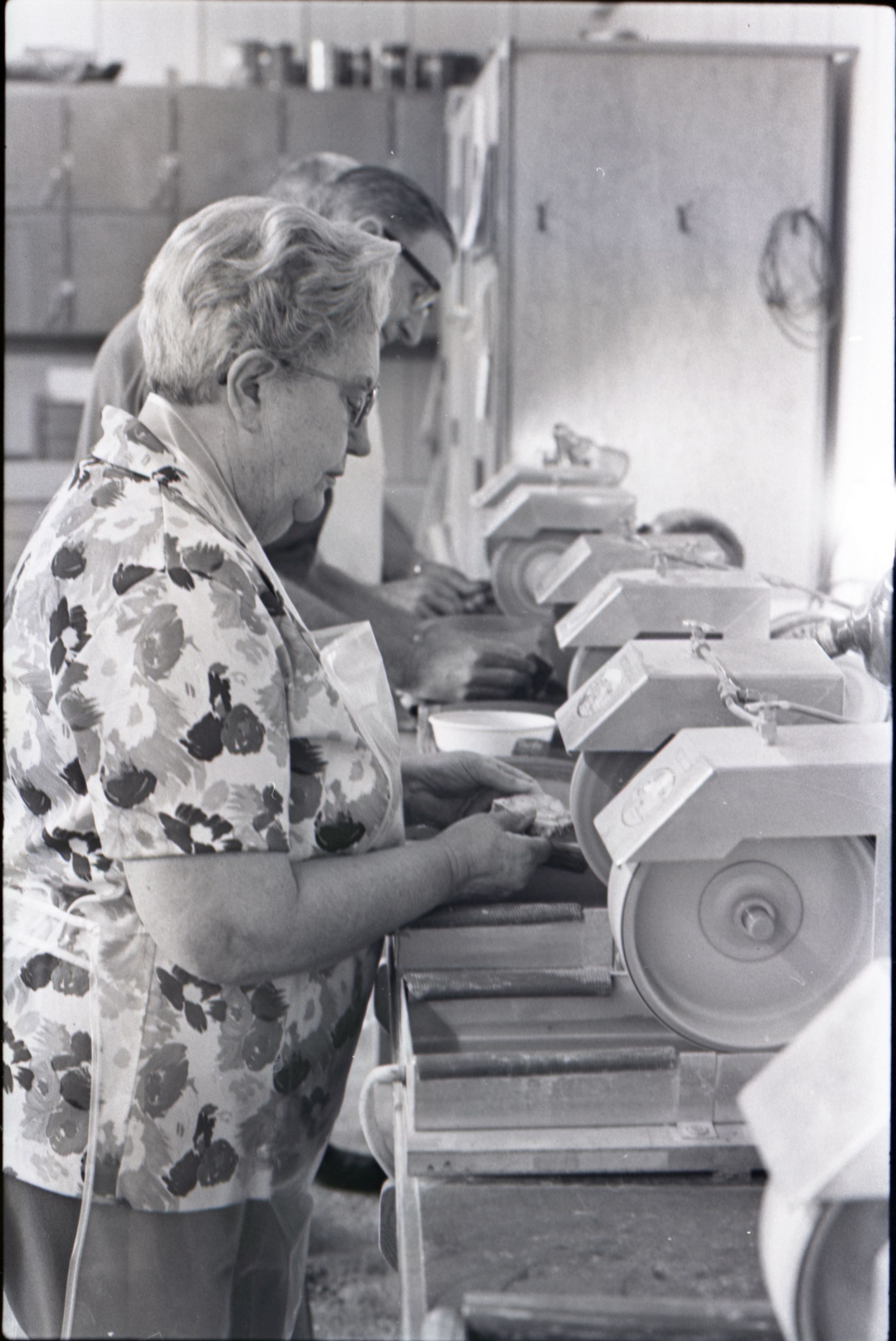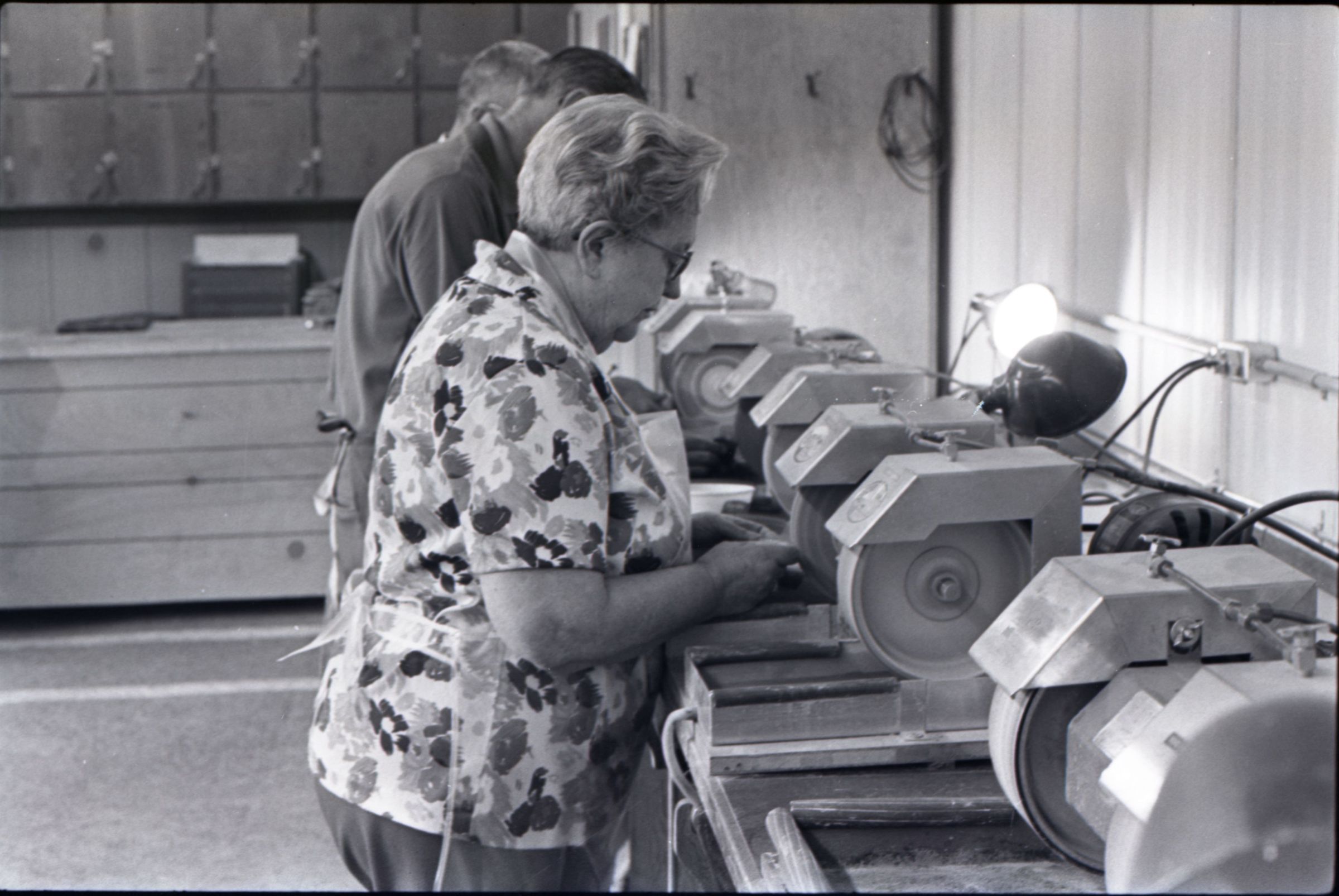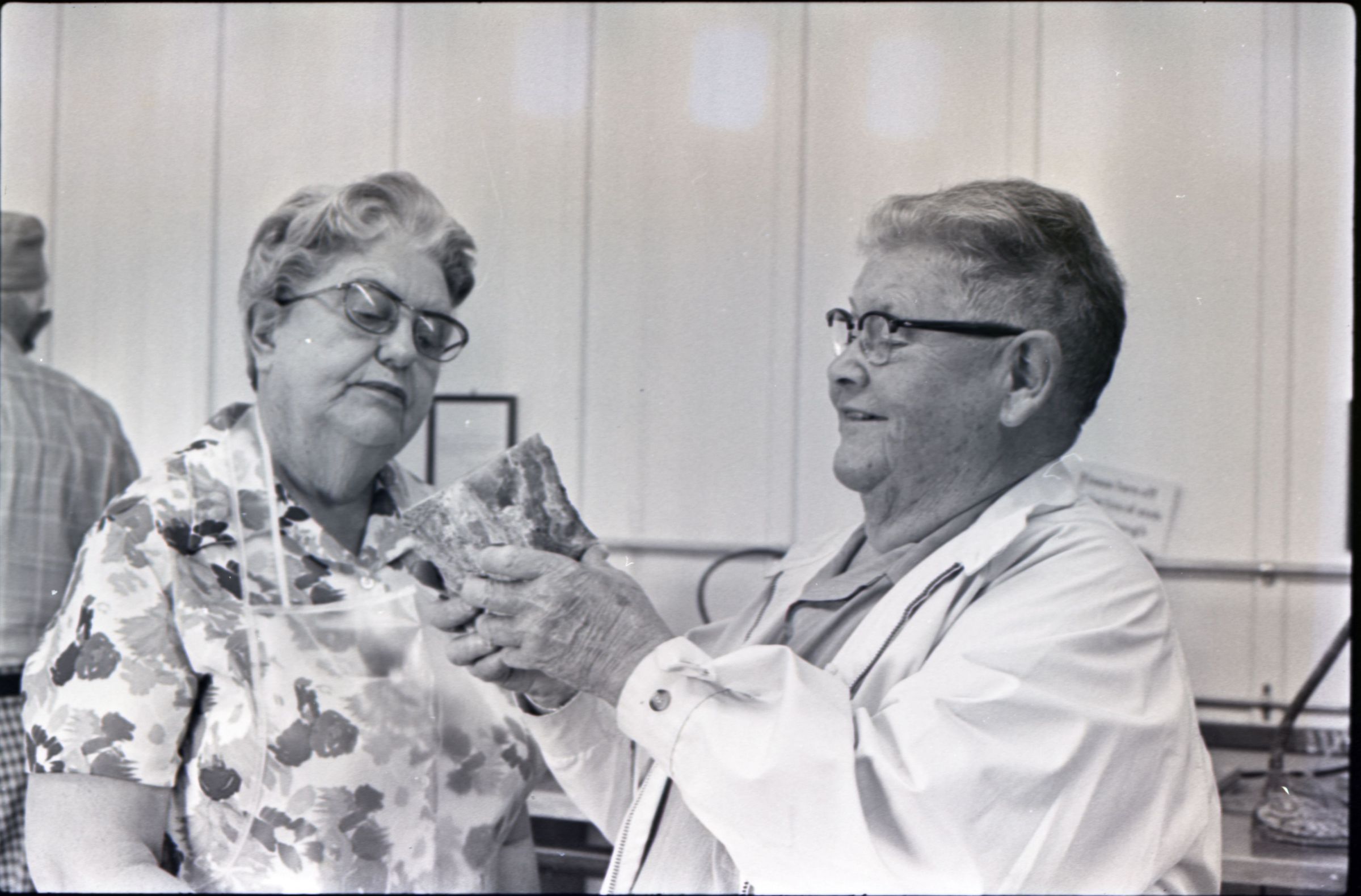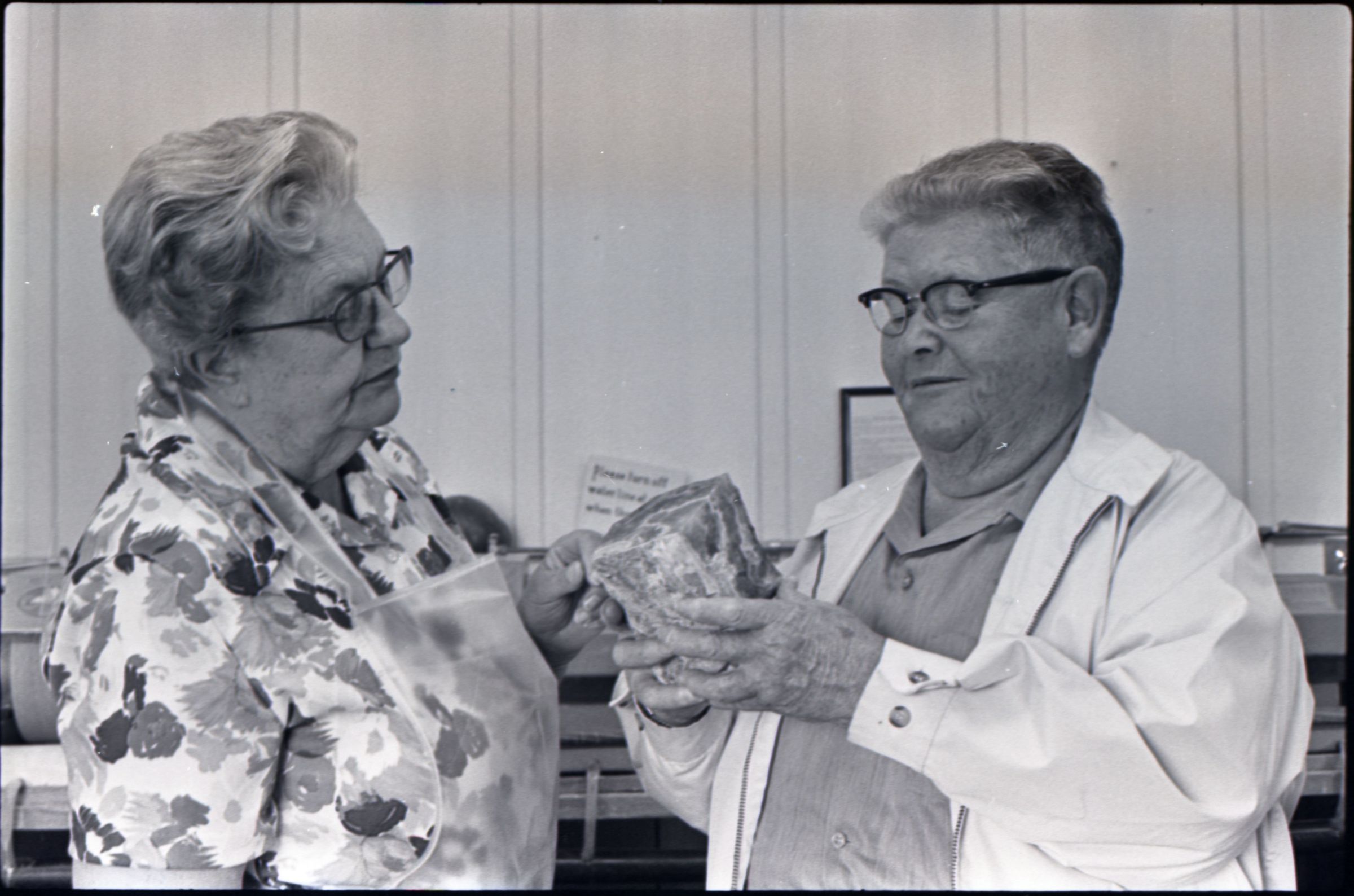 Rock Festival, 1975. These two black and white film negative strips were created for the Lacey Leader newspaper. These images show people polishing rocks and people looking at rocks.Made/Created