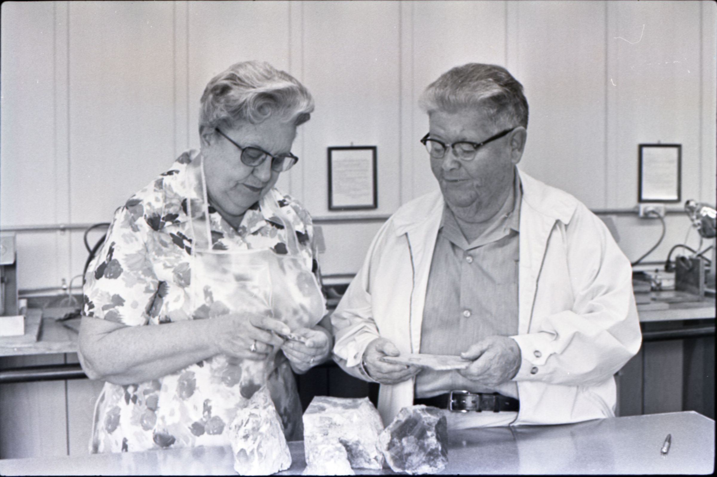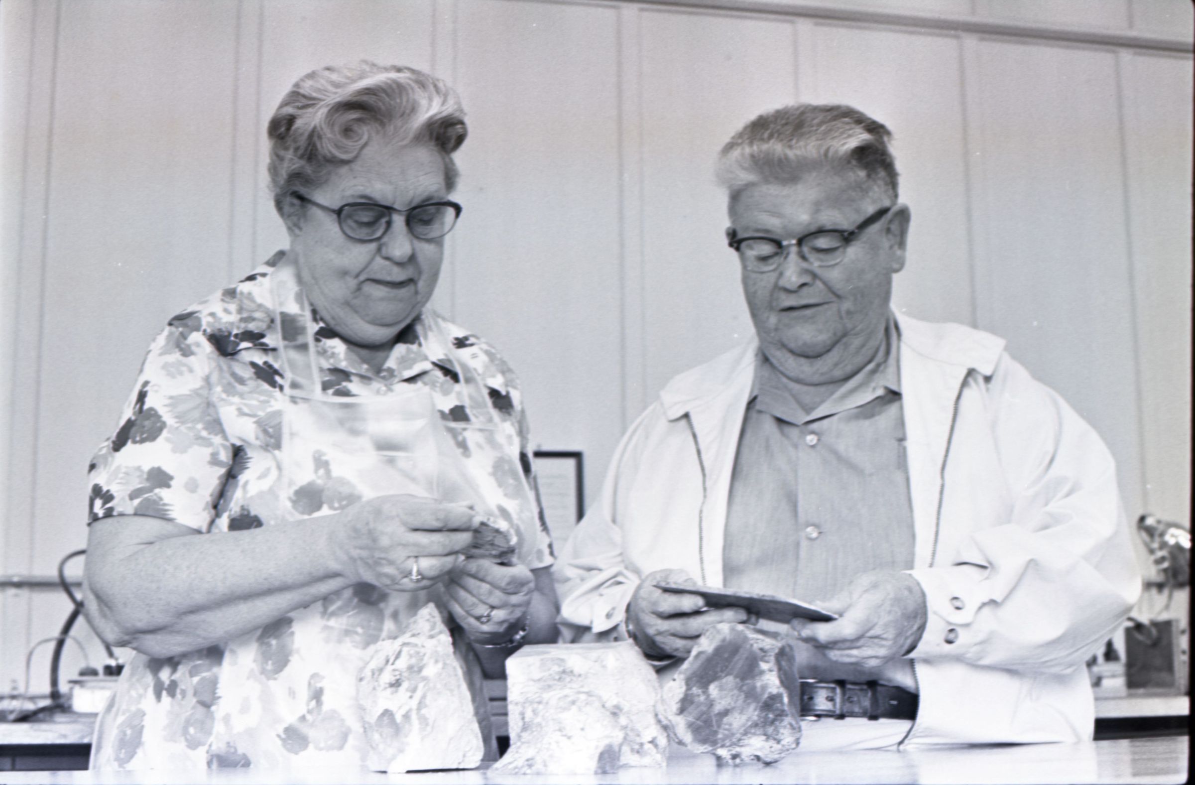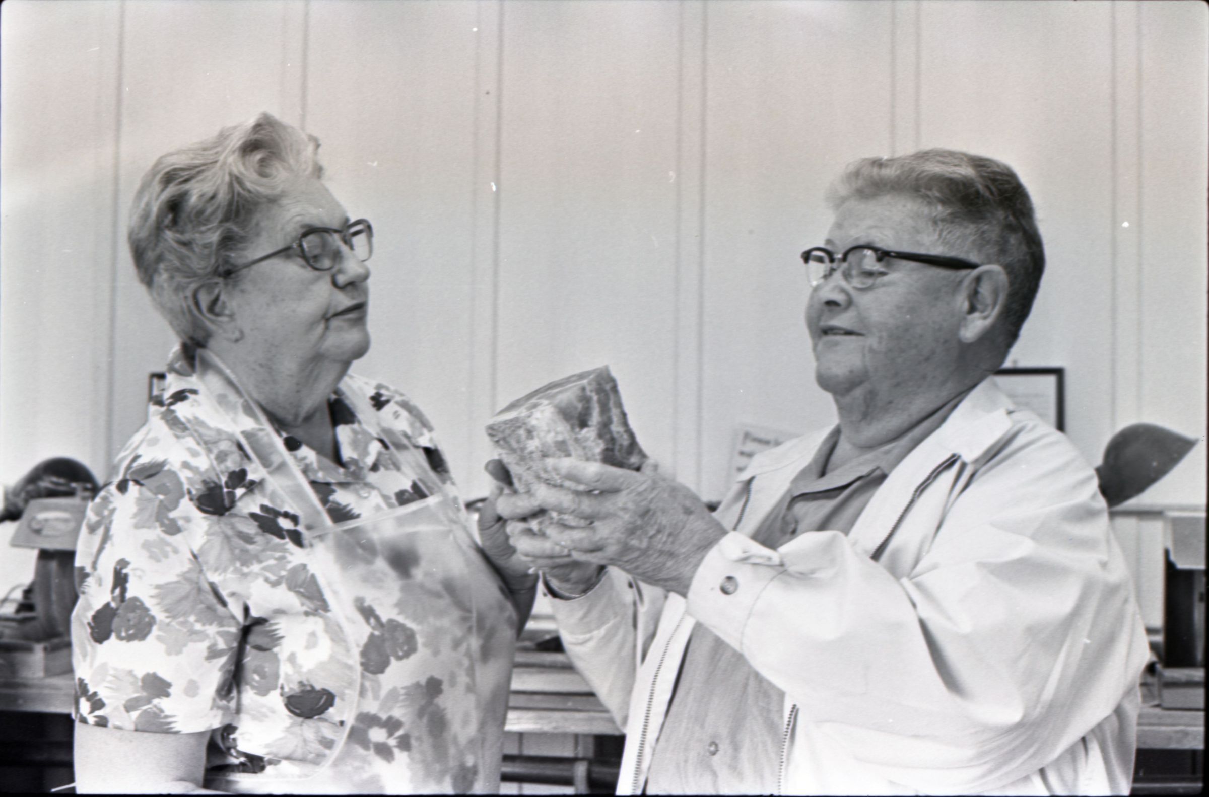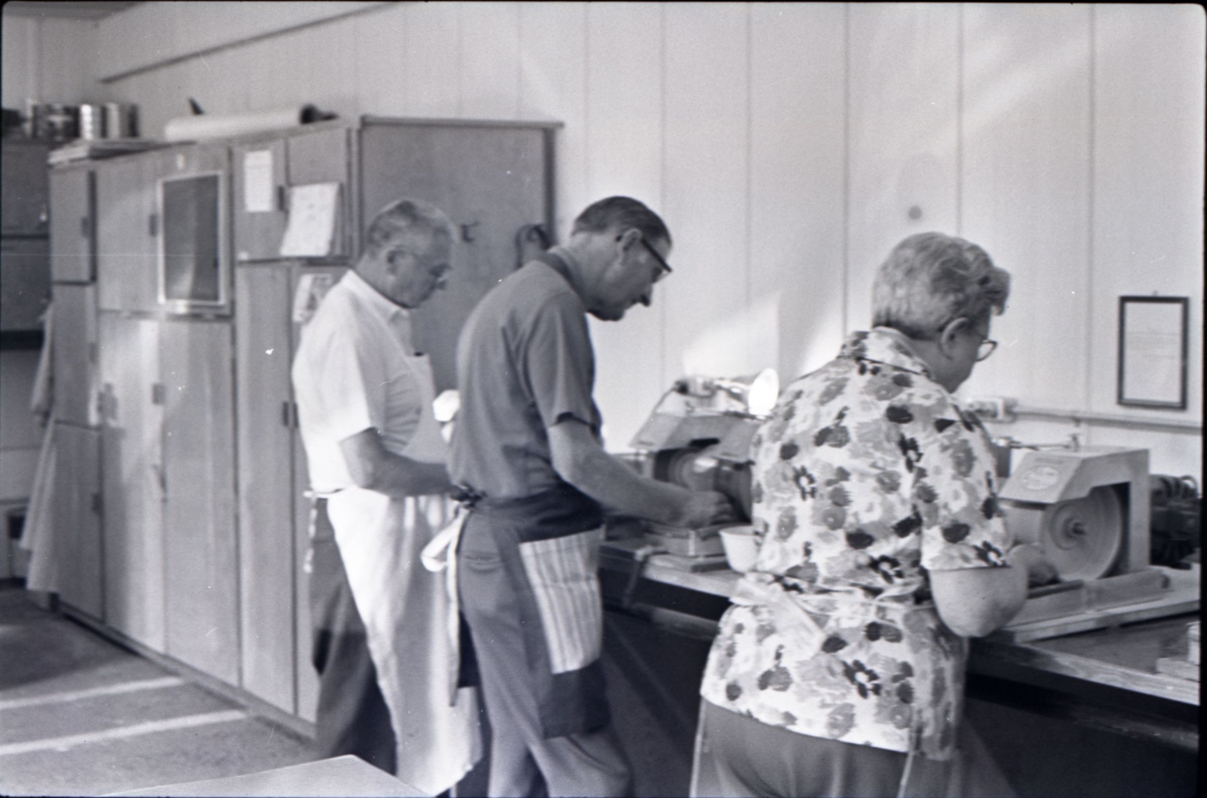 Rock Festival, 1975. These two black and white film negative strips were created for the Lacey Leader newspaper. These images show people polishing rocks and people looking at rocks.Made/Created
