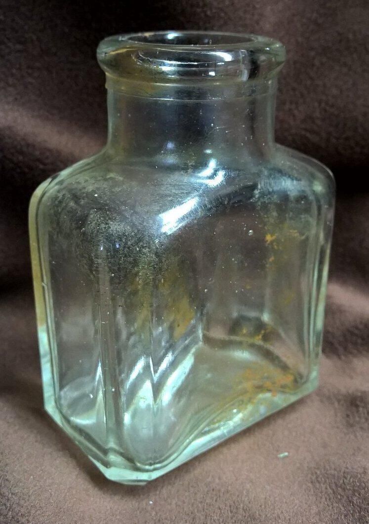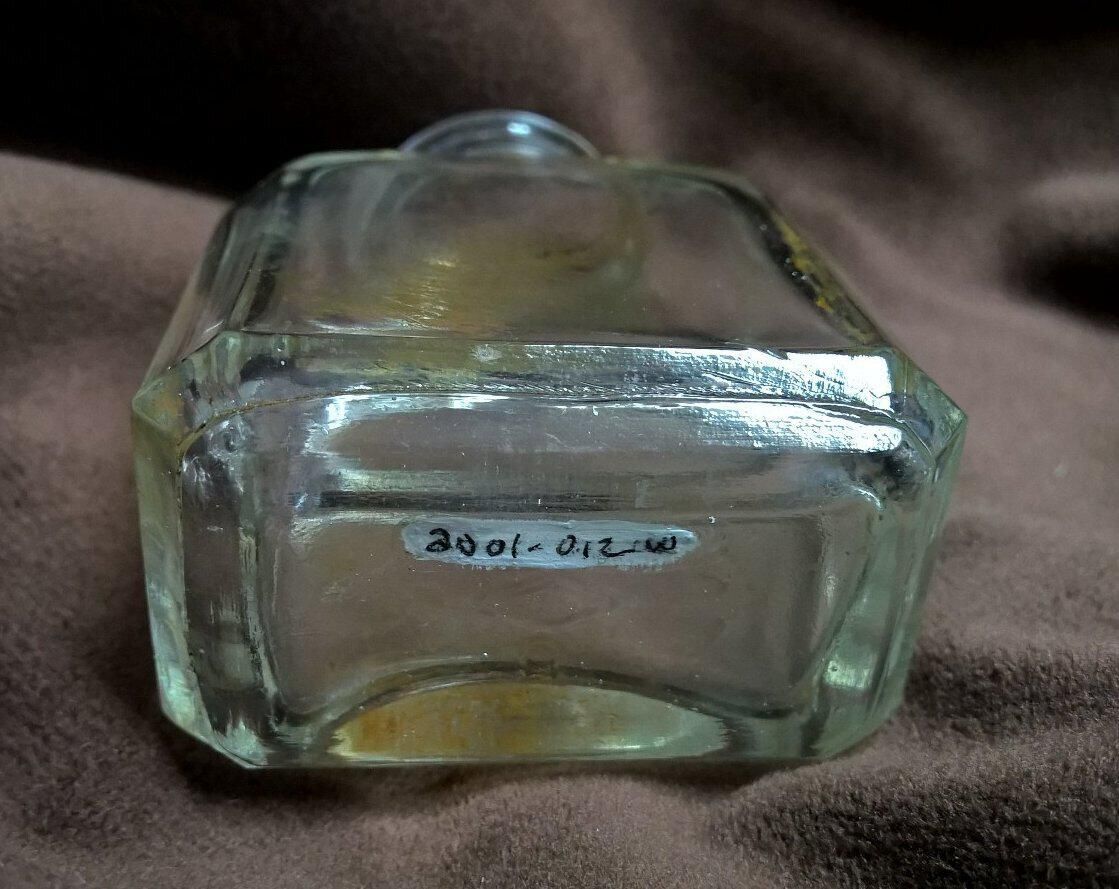 Clear glass rectangular 3" tall bottle with a round neck and lip. There are mold seams at two of the corners that extend from the bottom up to and over the lip. There is a rectangular seam on the bottom and a round horizontal seam under the lip. Embossed on the bottom is a diamond with an "8" below.