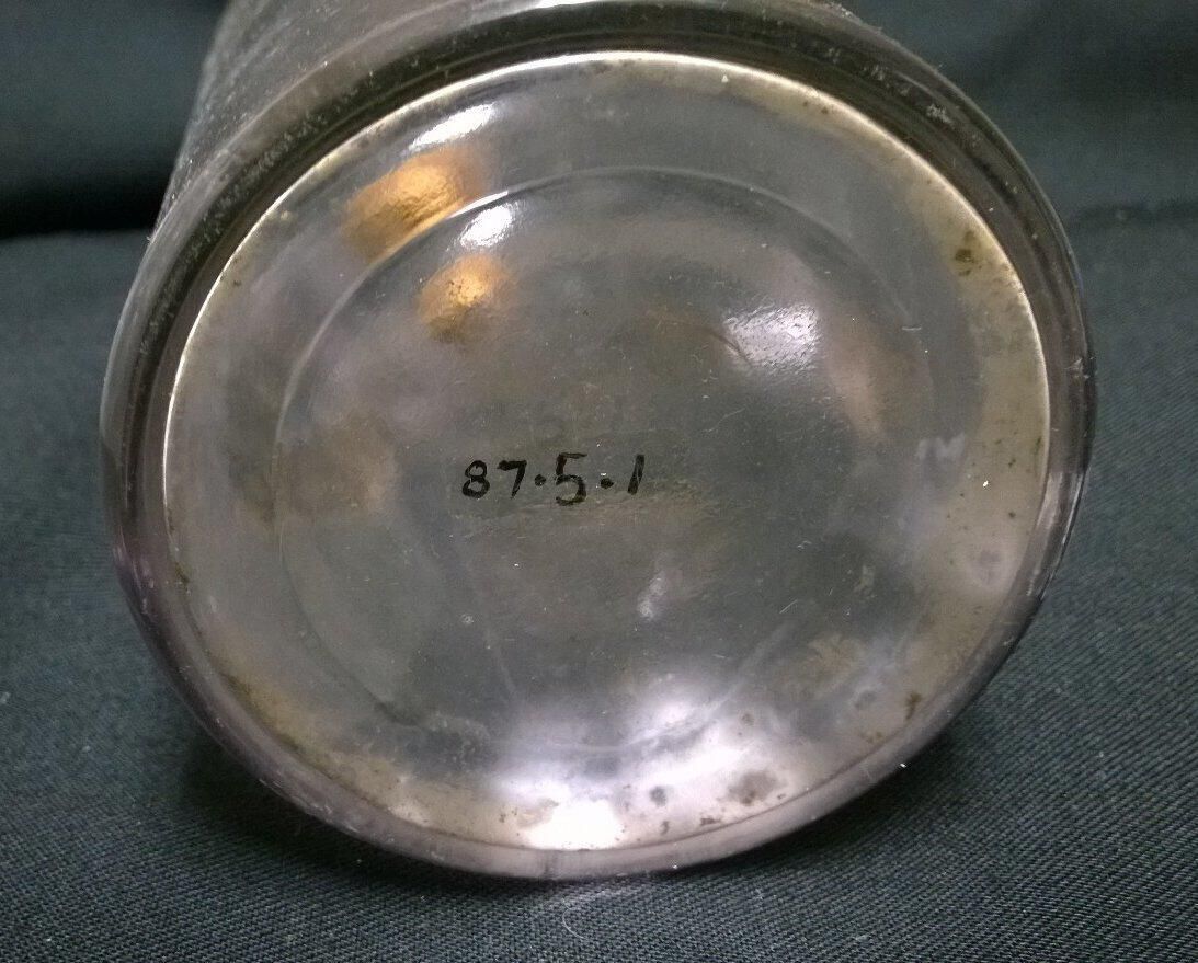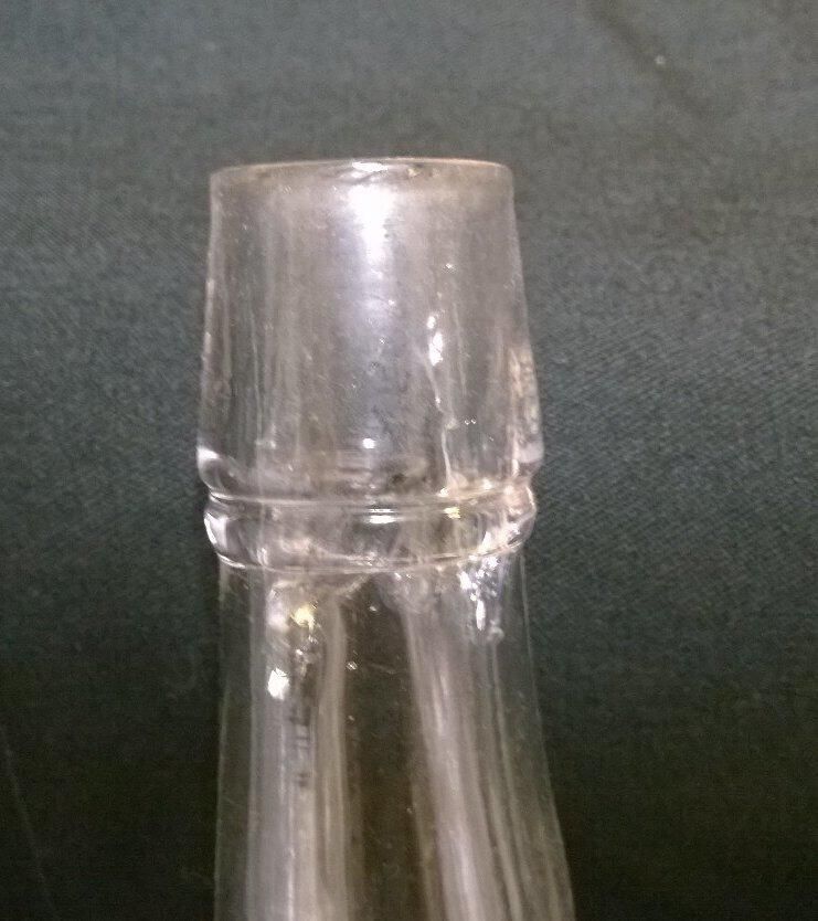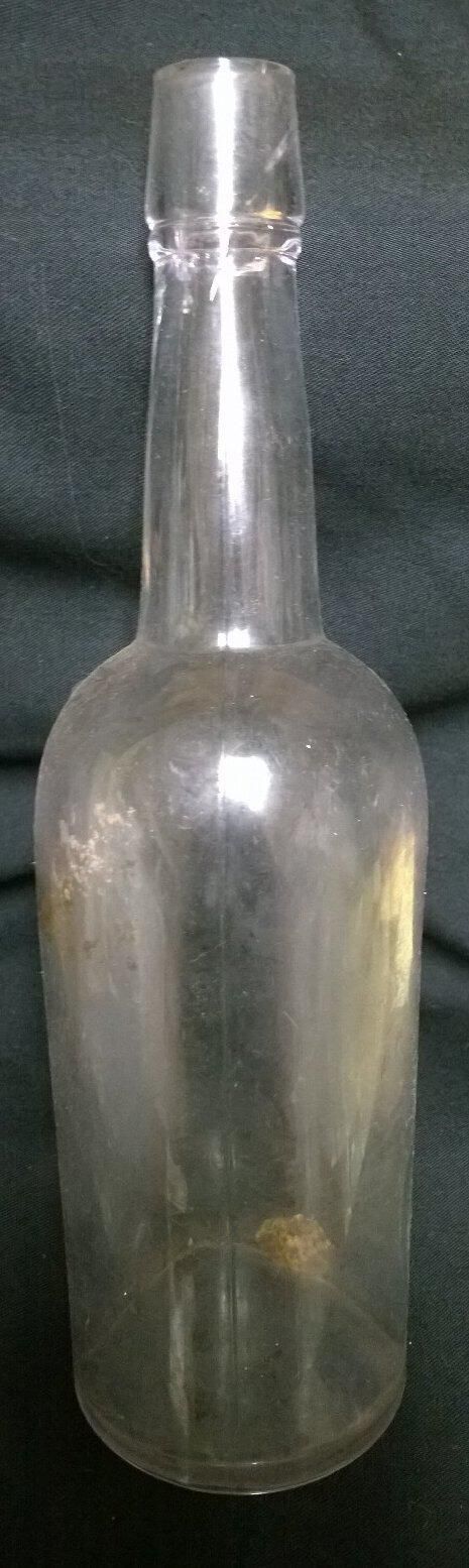Slight-amethyst-tint glass one fifth quart (probably) tall-straight-neck-cylinder liquor bottle. There is no embossing on the bottle. The opening is designed for a stopper, probably a cork. There is a piece of cork and a dead fly inside the bottle and a stain inside the bottle. There are mold seams on the sides that extend from the bottom up to the top of the neck. There are what appear to be breaks in the glass near the top. The center portion of the bottom is recessed.Made/Created