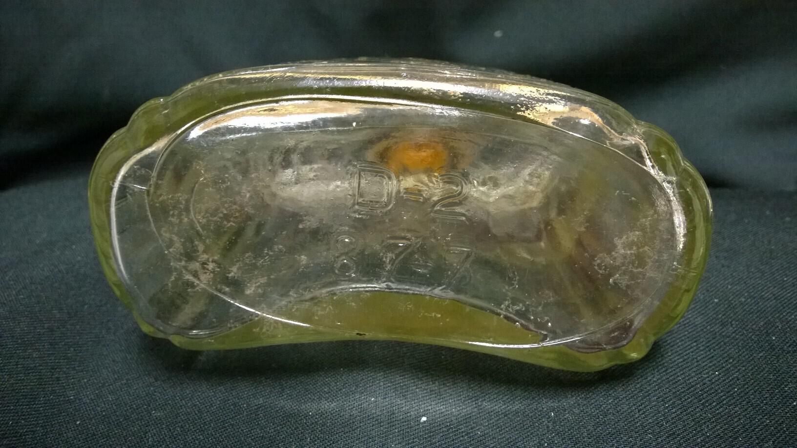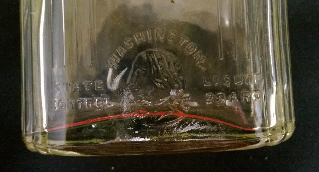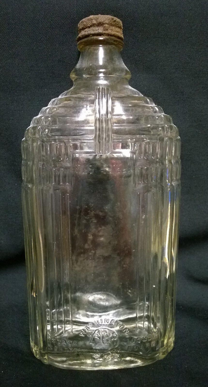 Clear glass flask-style one-fifth quart liquor bottle with screw top and rusted metal cap attached. The reverse side of the bottle is concave so as to mimic the shape of a flask. The bottle is embossed with vertical and horizontal lines that form a decoration. Also embossed on the side is "federal law forbids sale or reuse of this bottle" and "Washington State Liquor Control Board" around an image of George Washington. On the bottom is embossed "D-2" and "87-7".