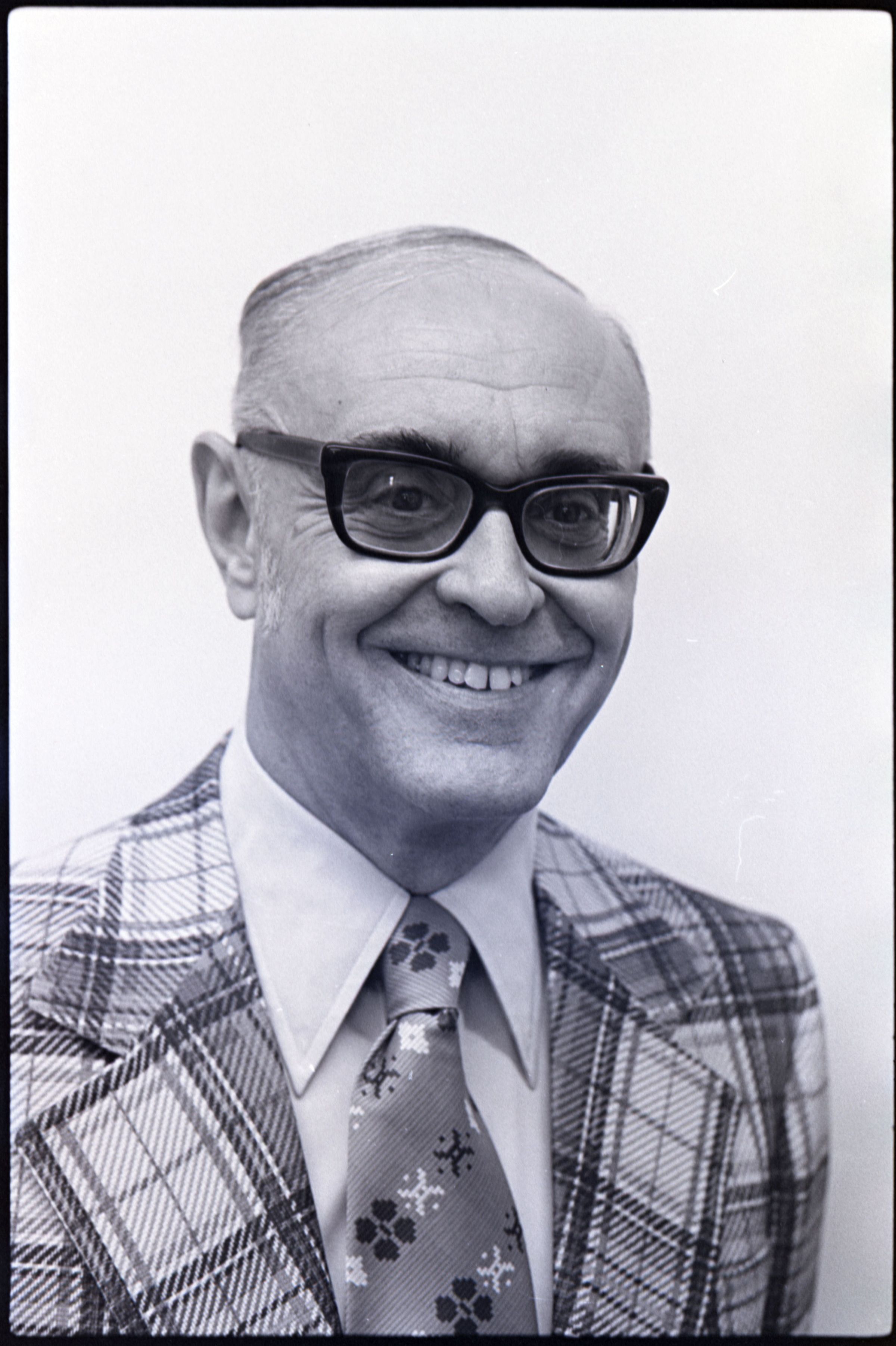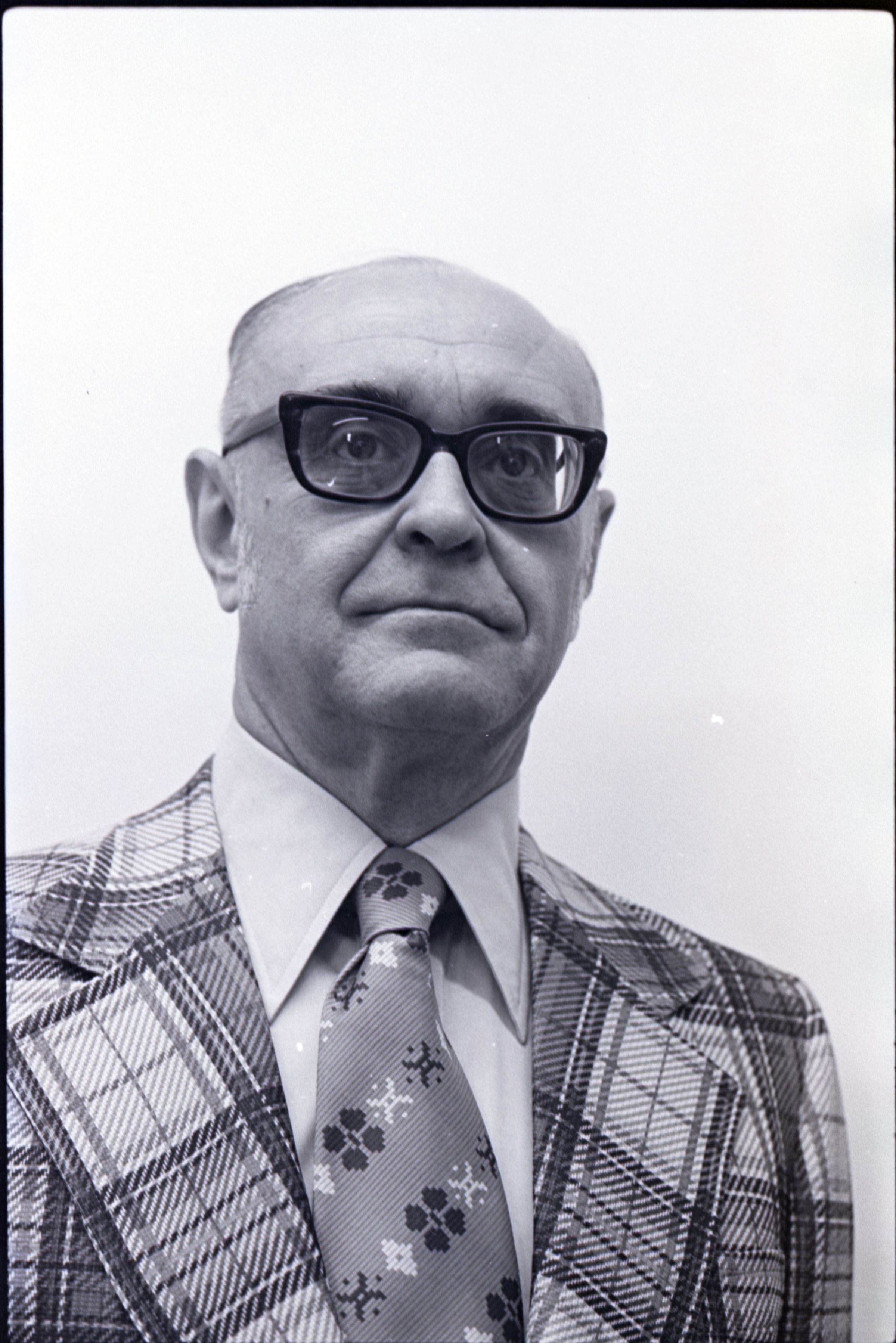 Nick Carr, 1974. This single black and white film negative strip was created for the Lacey Leader newspaper. These images show a man (Nick Carr) posing for portrait-style photos, and the cover of a magazine titled "SPIDER."
