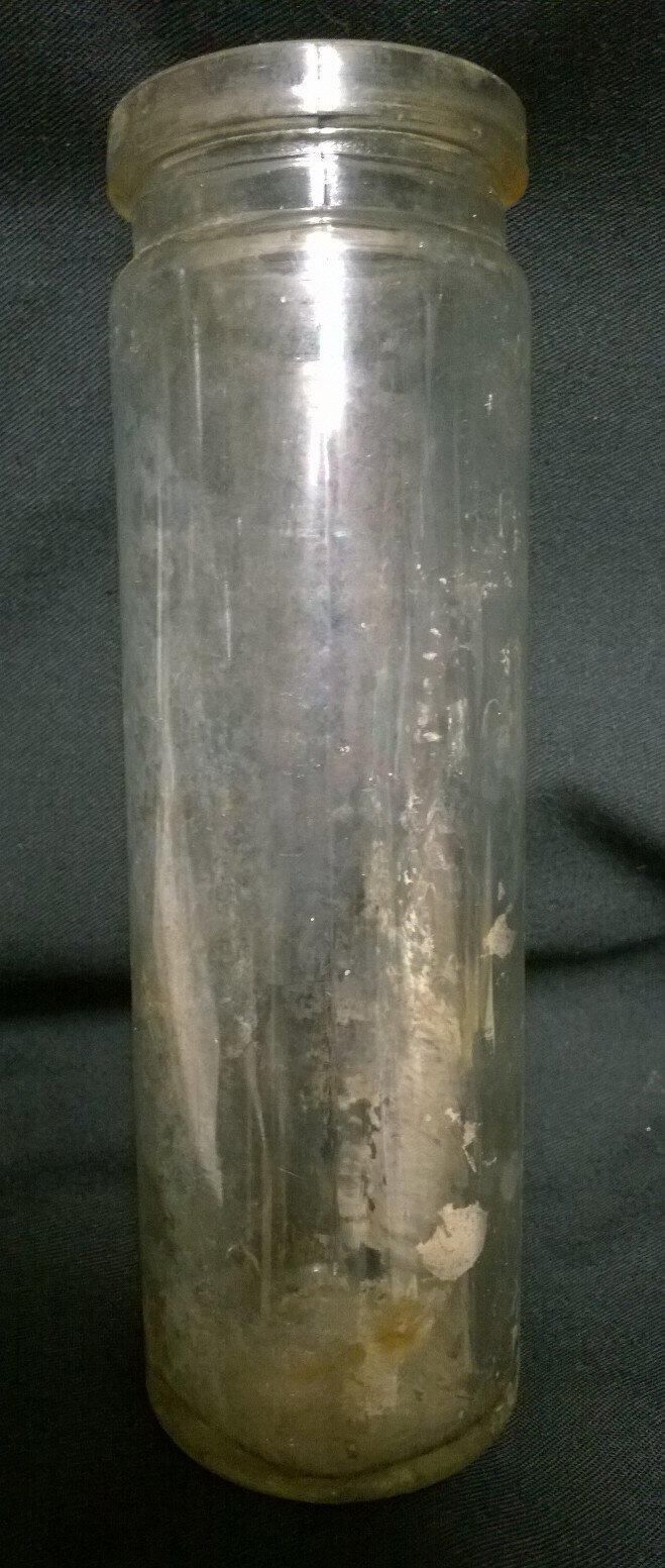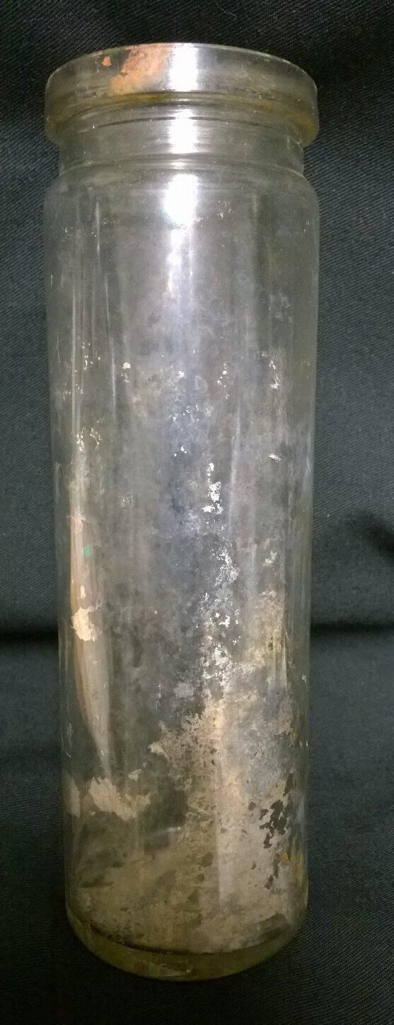 Clear glass round bottle with straight sides. The style is that of an olive bottle. There are mold seams on the side that extend from the bottom up to but not over the lip. There are seams under the top and on the bottom. One seam on the bottom is off center. There are no threads for a lid, but there is a rim inside the top possibly for a press-on lid. Embossed on the bottom is the number "5".