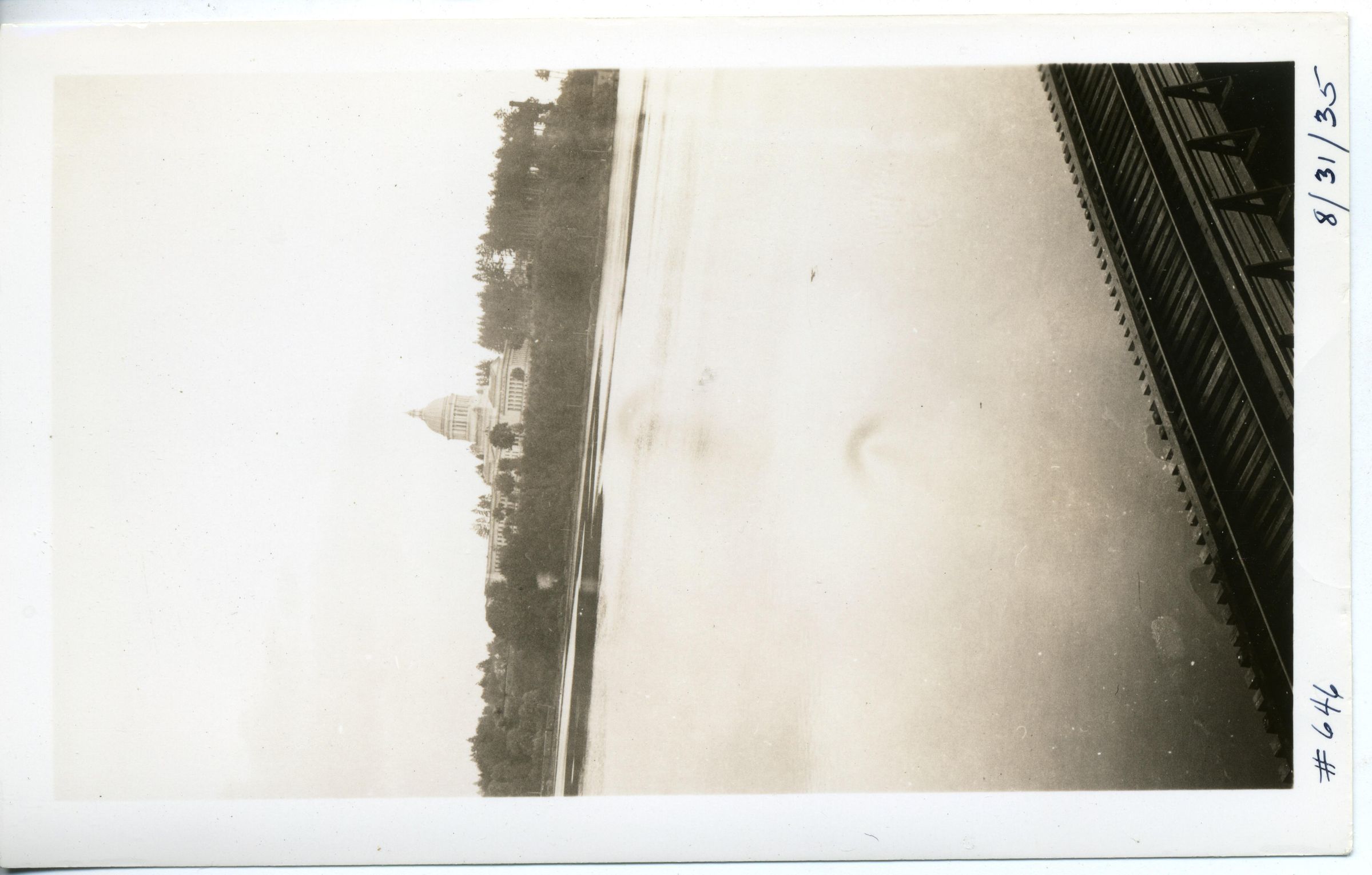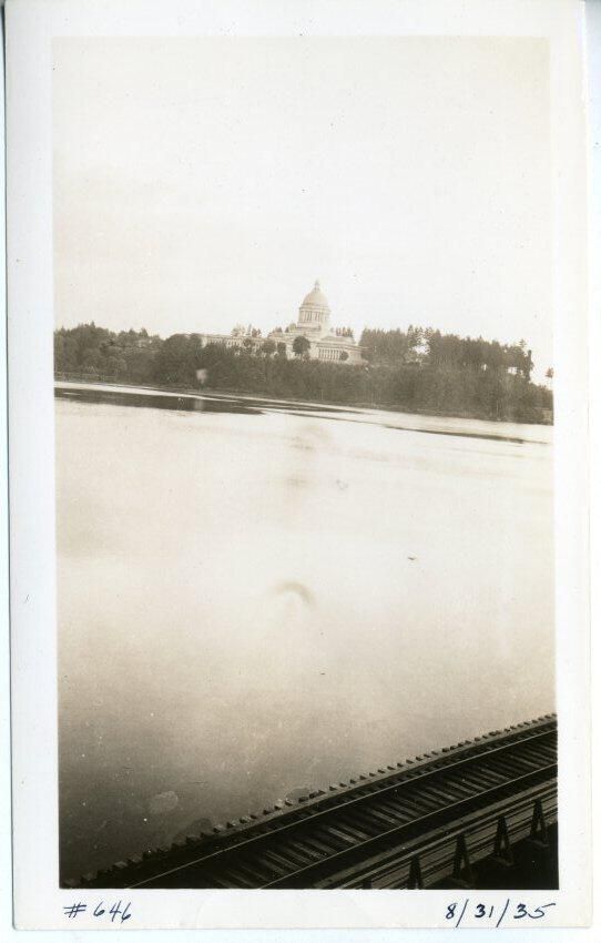 Black and white photo of the Legislative Building. In the foreground is the water of the Des Chutes River, and in the bottom right corner is a railroad track. In the background is the Capitol group. There is a white border on all sides, and in the bottom border is "#646" and "8/31/35". On the back is what appears to be "A 7" and in pencil"8/31/35"..