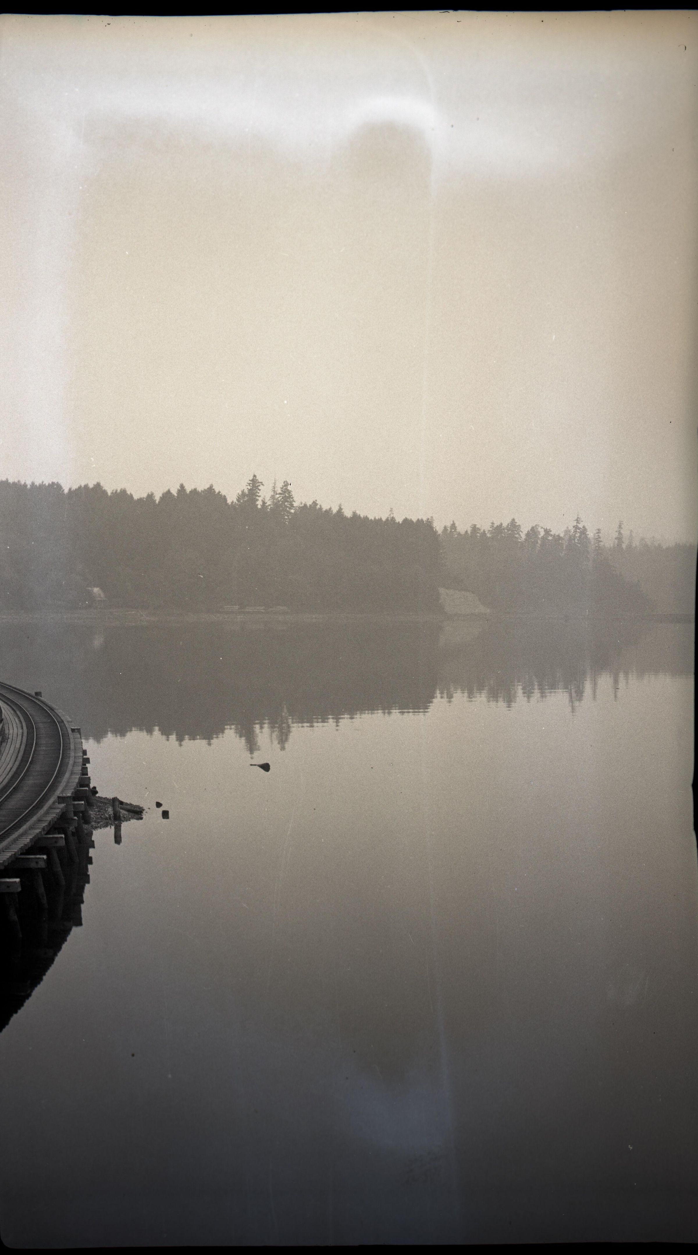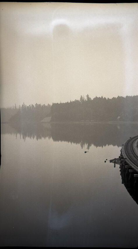 Black and white negative of a portion of Budd Inlet with the west shore in the background. At the right side is a curved railroad track. There is a white border on all sides, and in the bottom border is "#647" and "8/31/35".