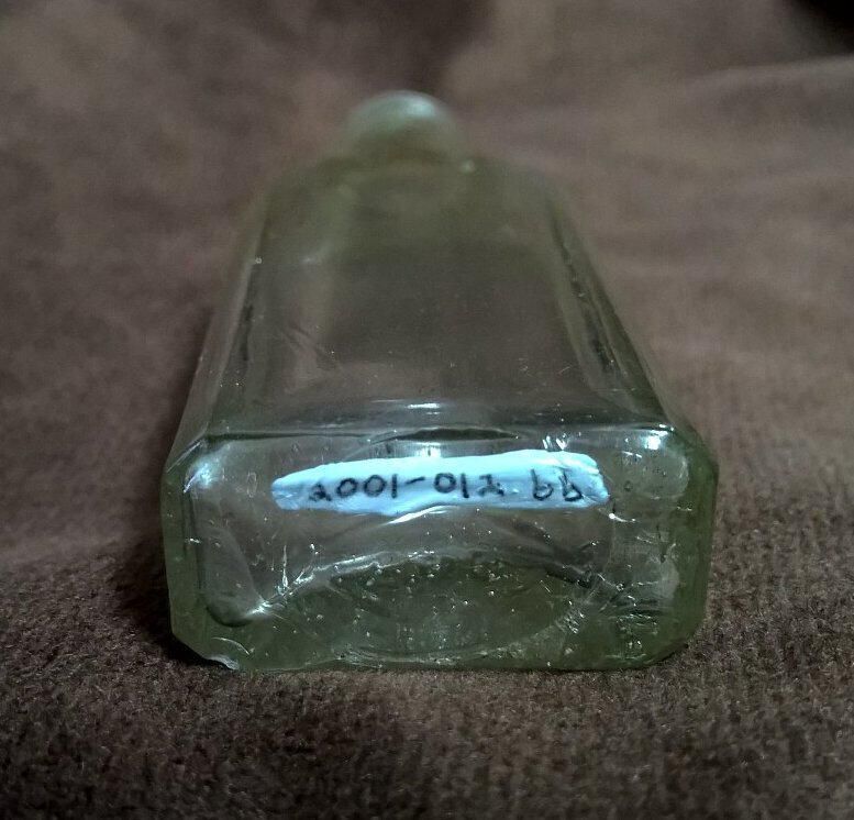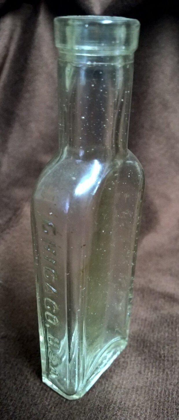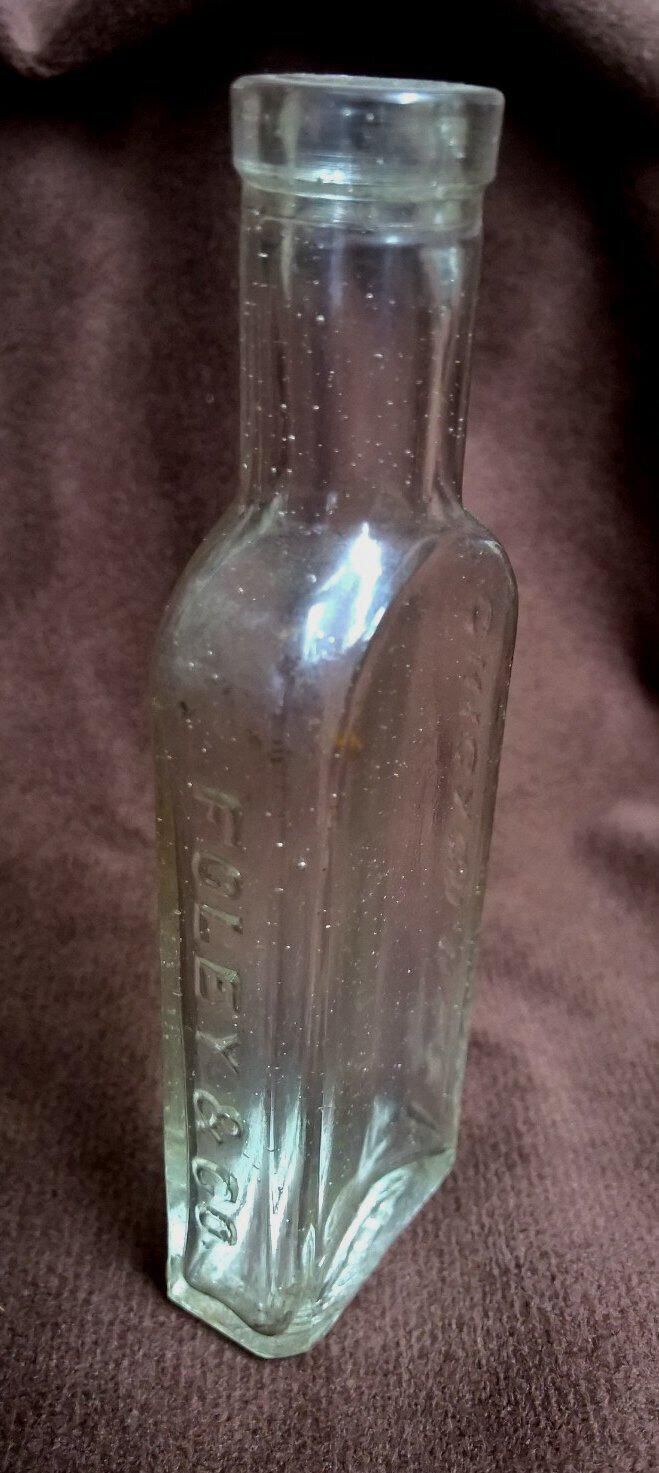 Clear glass rectangular bottle with a round neck and lip. There are mold seams at two of the corners that extend from the bottom up to just below the lip. Embossed on one side is "Foley & Co" and on the other side is "Chicago, U.S.A." On the bottom is "666" inside a diamond. The Chicago firm of Foley & Co. sold cough syrup.