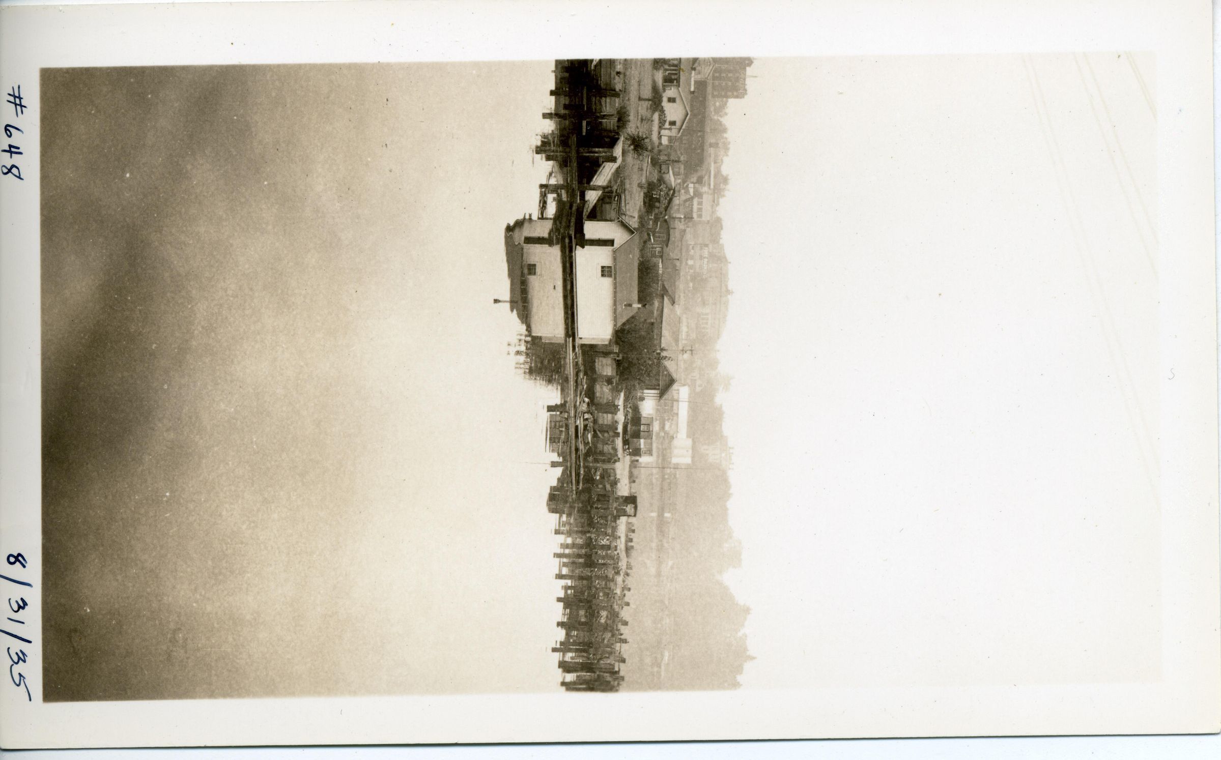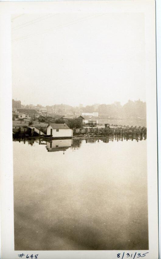 Black and white photo of Budd Inlet and the west shore. In the foreground is water and along the far shore is a structure called a "float house". It has white siding and a dark roof. To its right are objects which might be rail cars, and also pilings. Further up the hill are other structures and in the background are trees. Objects along the shore are reflected in the water. There is a white border on all sides, and in the bottom border is "#648" and "8/31/35". On the back is what appears to be "A 7" and in pencil is "8/31/35".