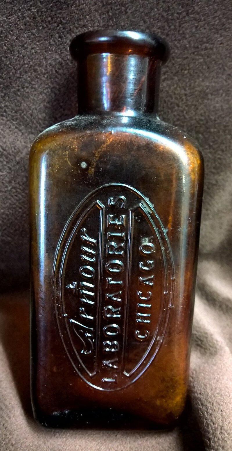 Amber glass rectangular bottle with rounded shoulders and an opening for a cork stopper. There is a mold seam on opposite corners that extends from the bottom up and over the lip. There is a seam at the bottom and a rectangular depression on the bottom. Embossed on one side is "Armour Laboratories Chicago".
