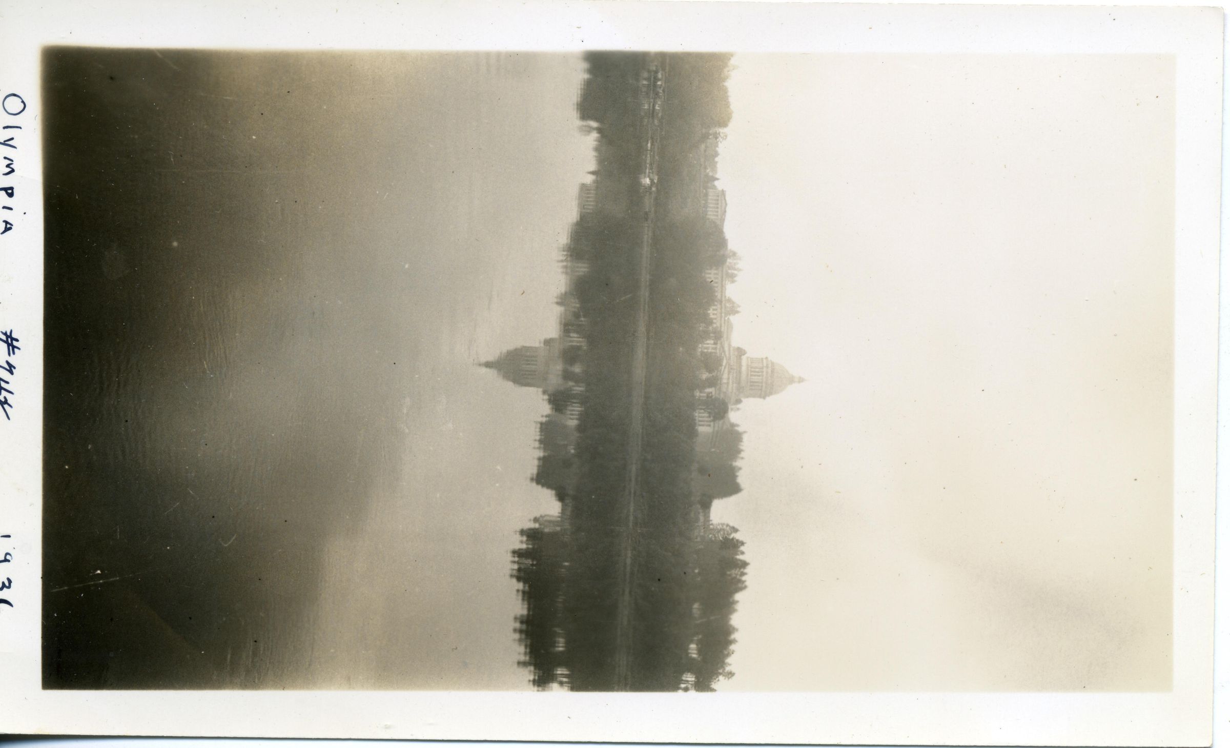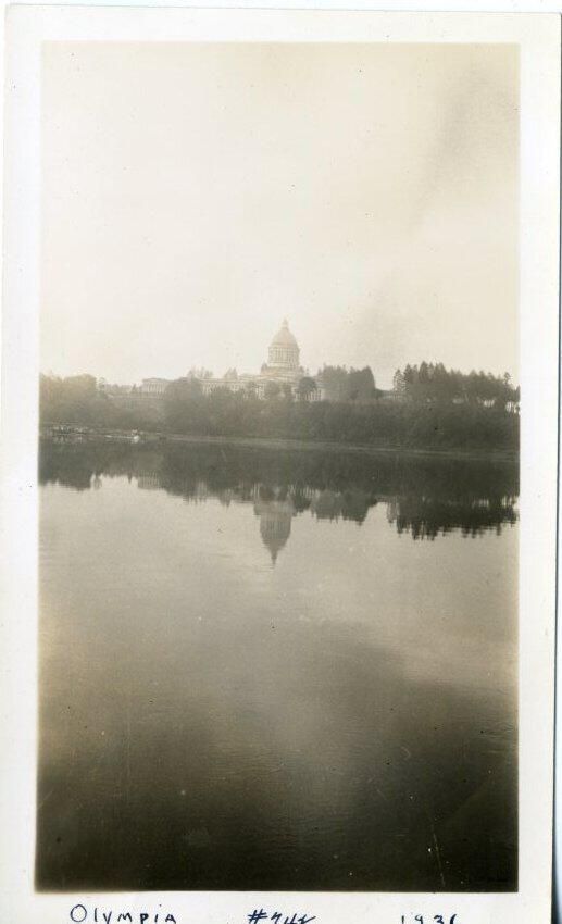 Black and white photo of the Capitol group. In the foreground is the water of the Des Chutes River. In the background is the Legislative Building, some of the other state buildings, and trees. The trees and Capitol dome are reflected in the water. There is a white border on all sides, and in the bottom border is "Olympia #742 1936". On the back is a stamp that is mostly unreadable but may be "157".