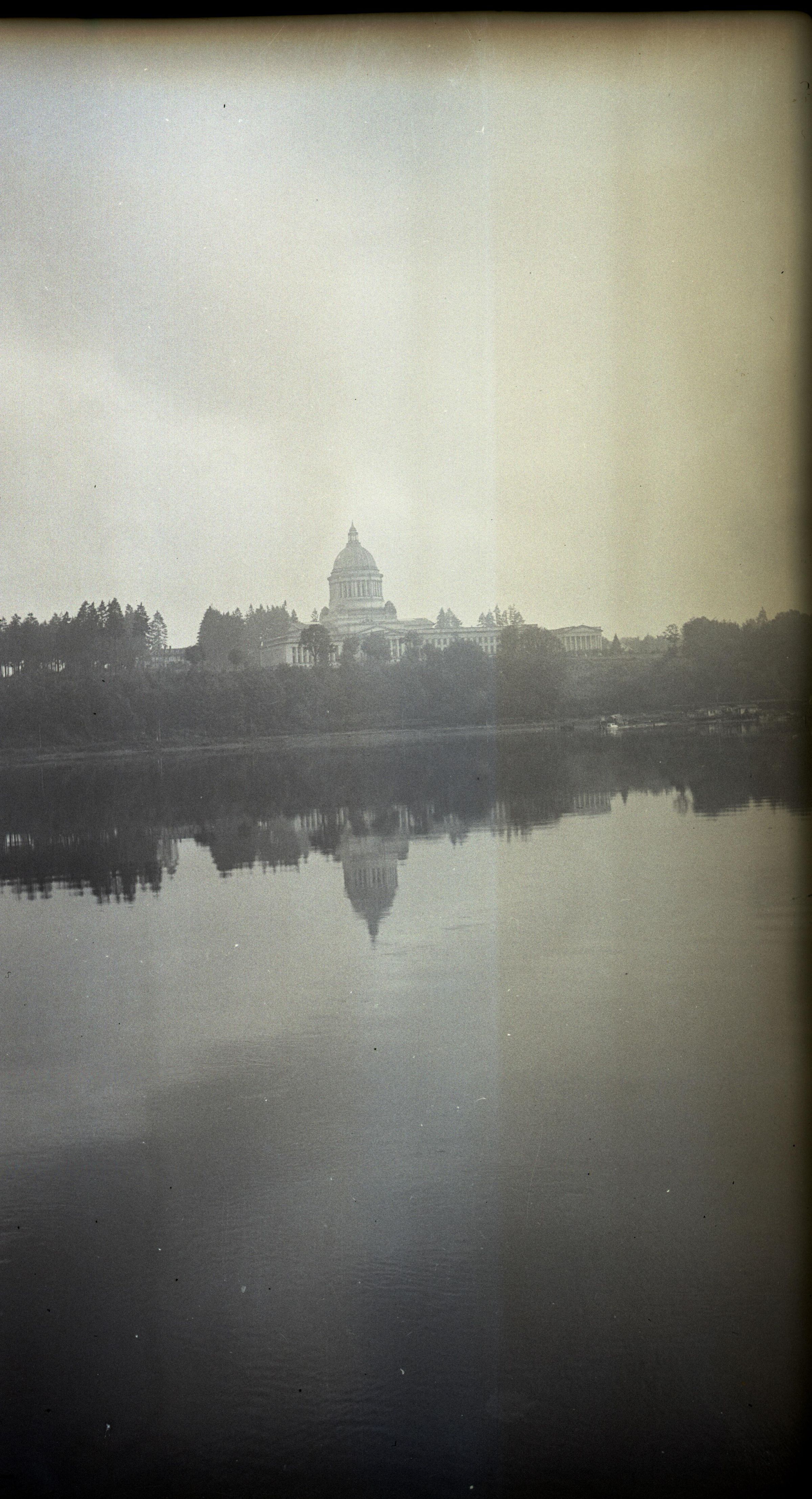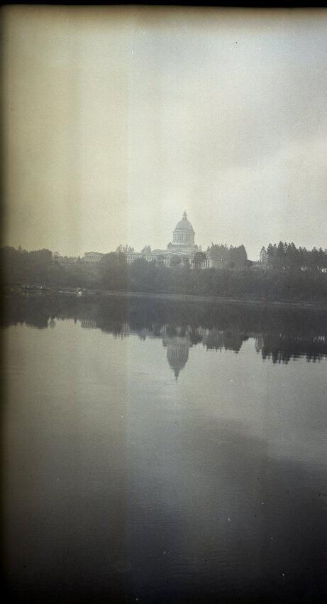 Black and white negative of the Capitol group. In the foreground is the water of the Des Chutes River. In the background is the Legislative Building, some of the other state buildings, and trees. The trees and Capitol dome are reflected in the water. There is a white border on all sides, and in the bottom border is "Olympia #742 1936".