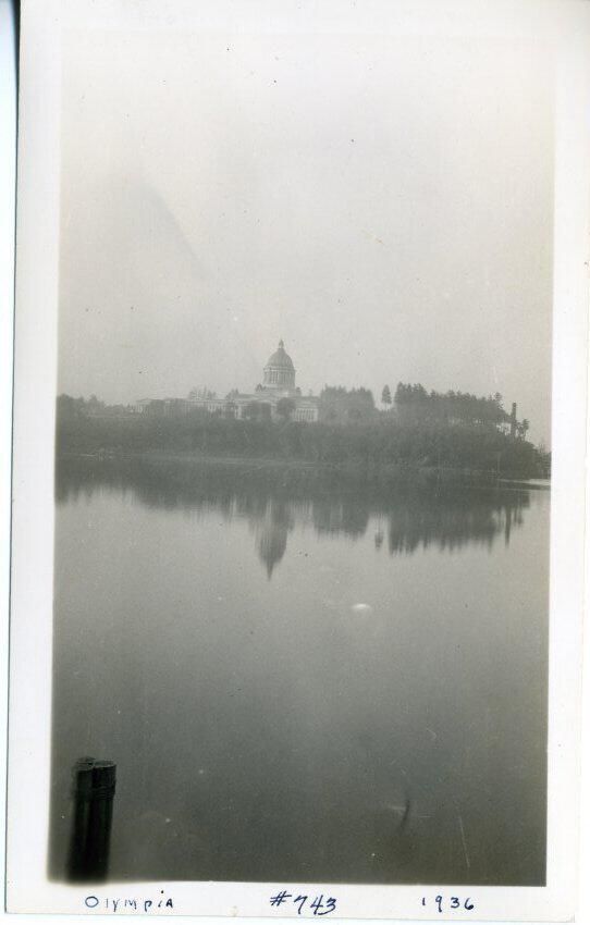 Black and white photo of the Capitol group. In the foreground is the water of the Des Chutes River. In the background is the Legislative Building, some of the other state buildings, and trees. The trees and Capitol dome are reflected in the water. There is a white border on all sides, and in the bottom border is "Olympia #743 1936". On the back is a stamp that is mostly unreadable but may be "588".