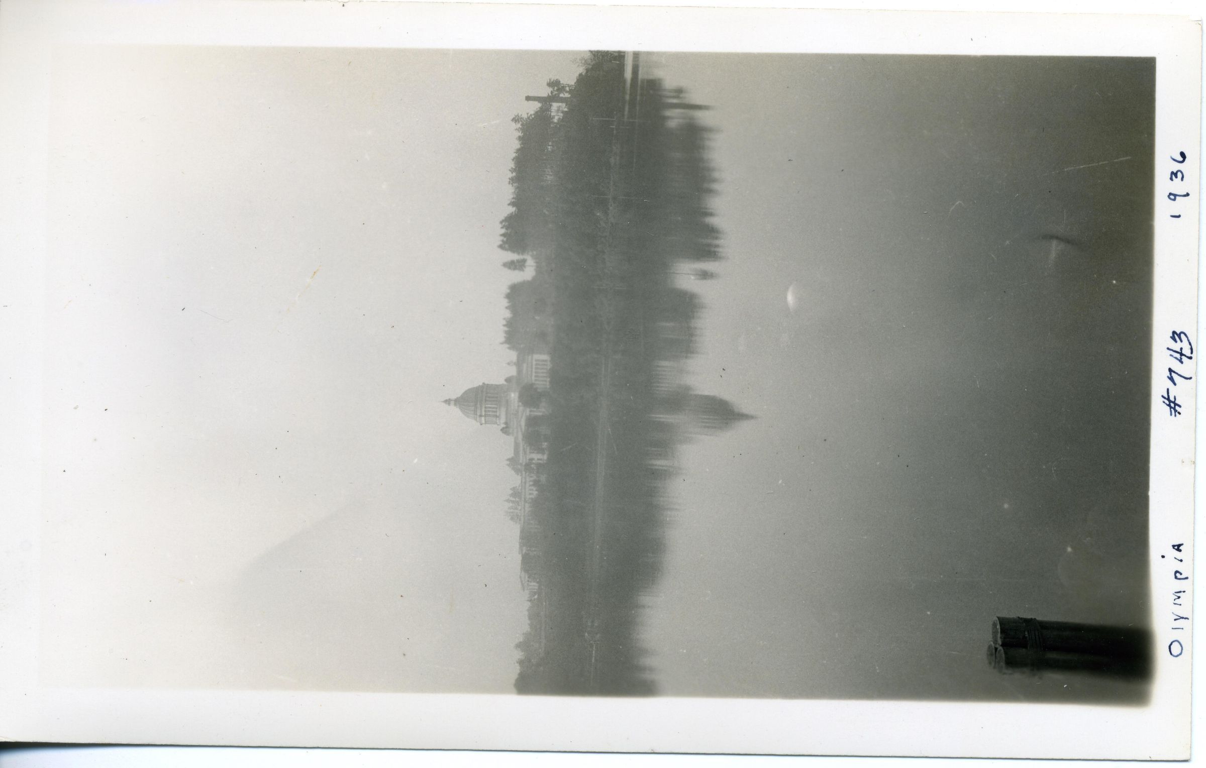 The photo is inserted, along with a negative of the image, into a cream colored envelope that has typed "Olympia 1936 ? Reflection of Capitol from bridge". Stamped is "743" and "indexed".Made/Created