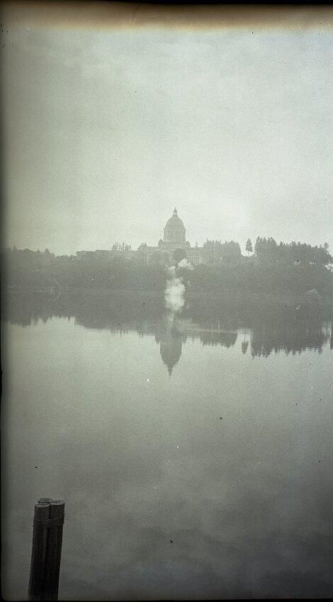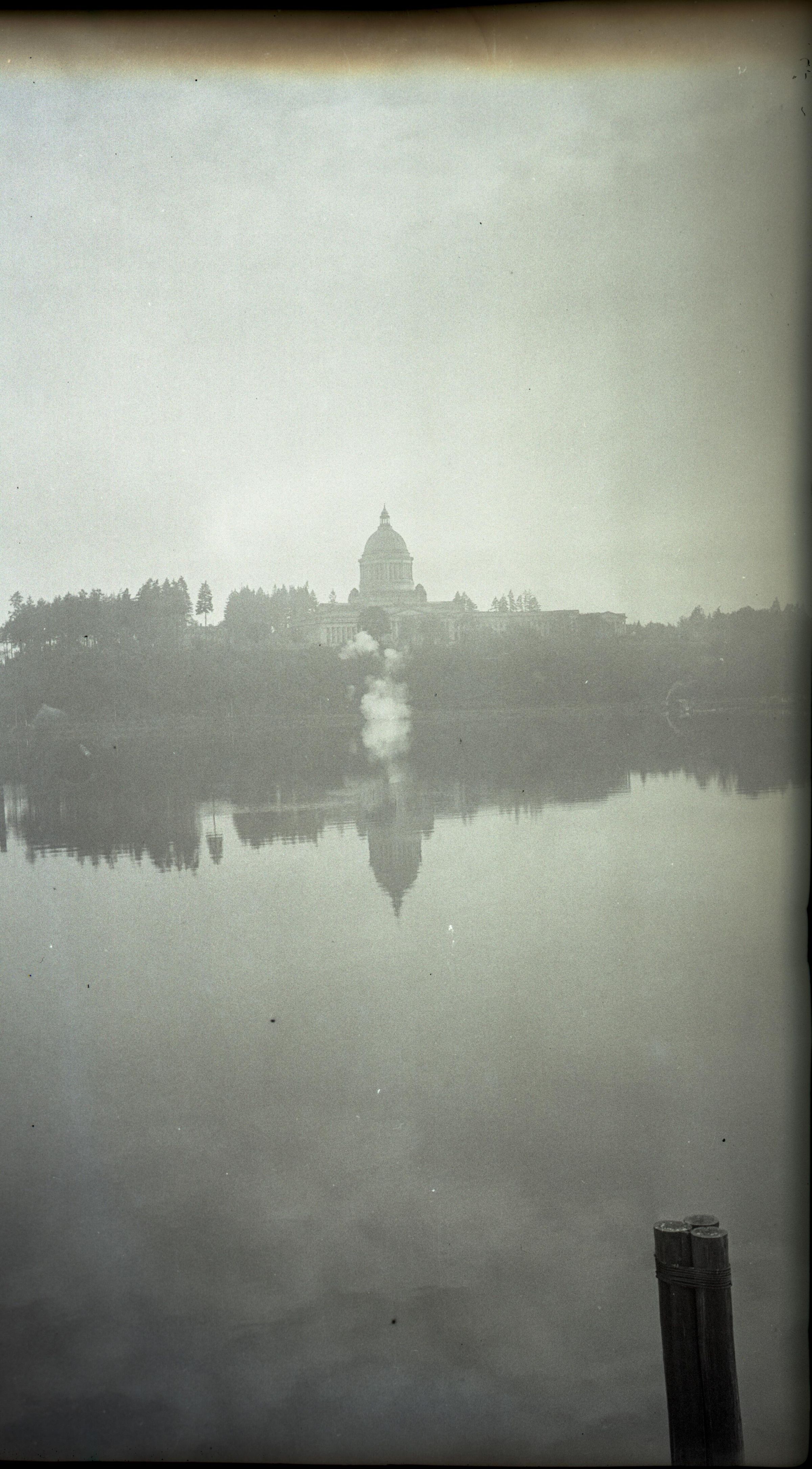 Black and white negative of the Capitol group. In the foreground is the water of the Des Chutes River. In the background is the Legislative Building, some of the other state buildings, and trees. The trees and Capitol dome are reflected in the water. There is a white border on all sides, and in the bottom border is "Olympia #743 1936". On the back is a stamp that is mostly unreadable but may be "588".