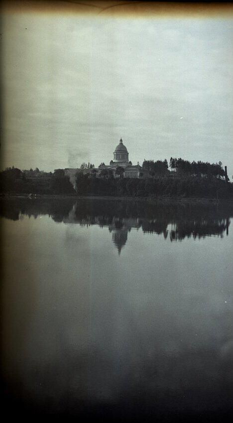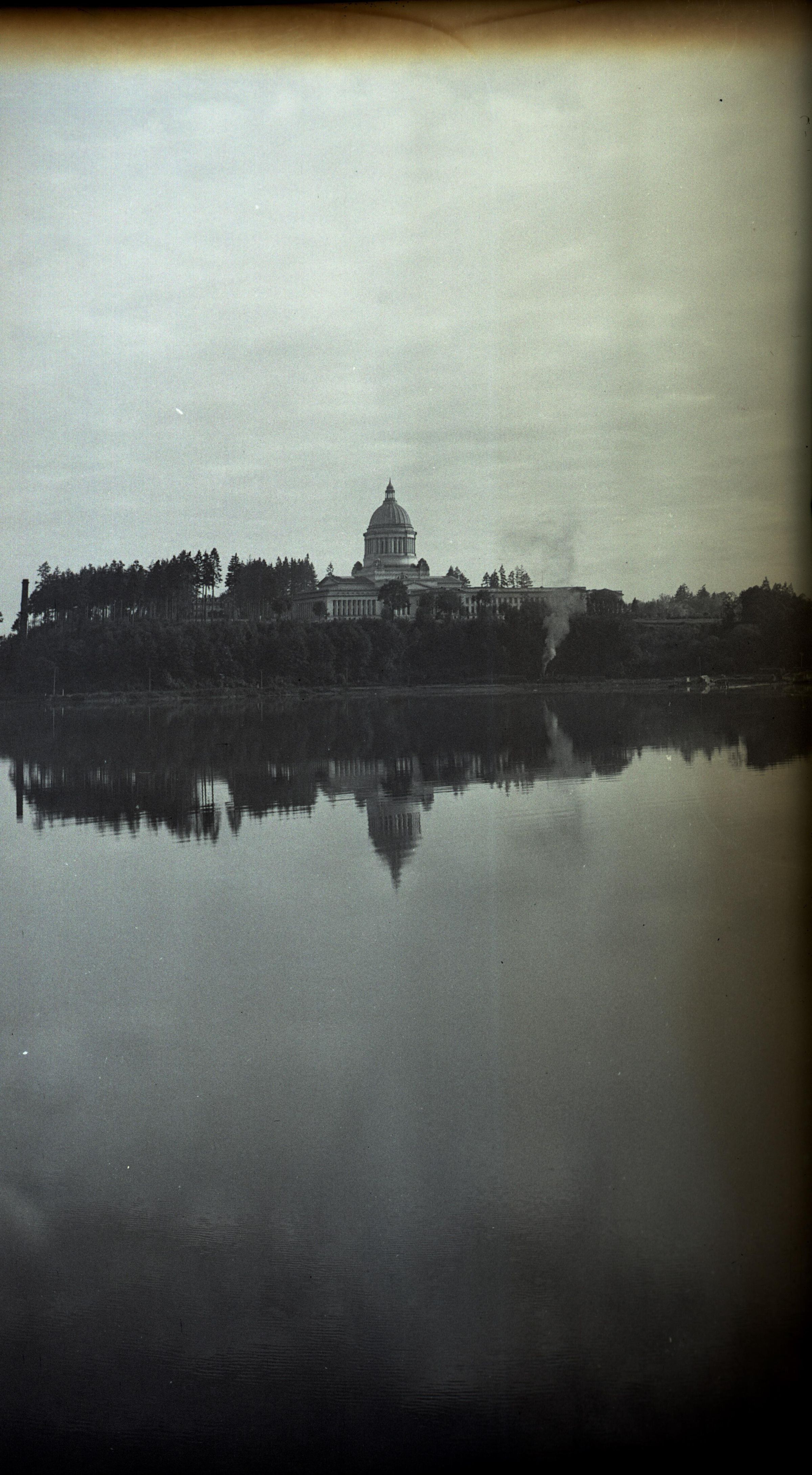 Black and white negative of the Capitol group. In the foreground is the water of the Des Chutes River. In the background is the Legislative Building, some of the other state buildings, and trees. The trees and Capitol dome are reflected in the water. There is a white border on all sides, and in the bottom border is "Olympia #744 1936". On the back is a stamp that is mostly unreadable but may be "443".