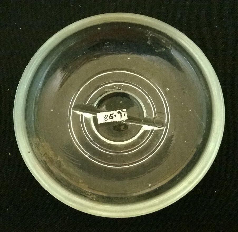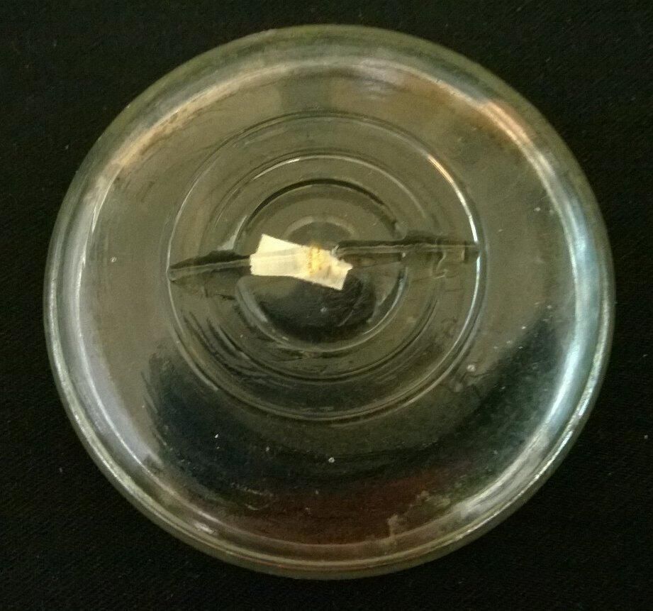 Clear glass lid for "lightning" or "toggle" type canning jar. The lid is designed to fit on a canning jar that does not have threads, but instead has a wire bail. The lid has a cover groove in the center of the top for securing the wire bail, which clamps the lid to the jar using a rubber seal between the lid and the jar.Made/Created